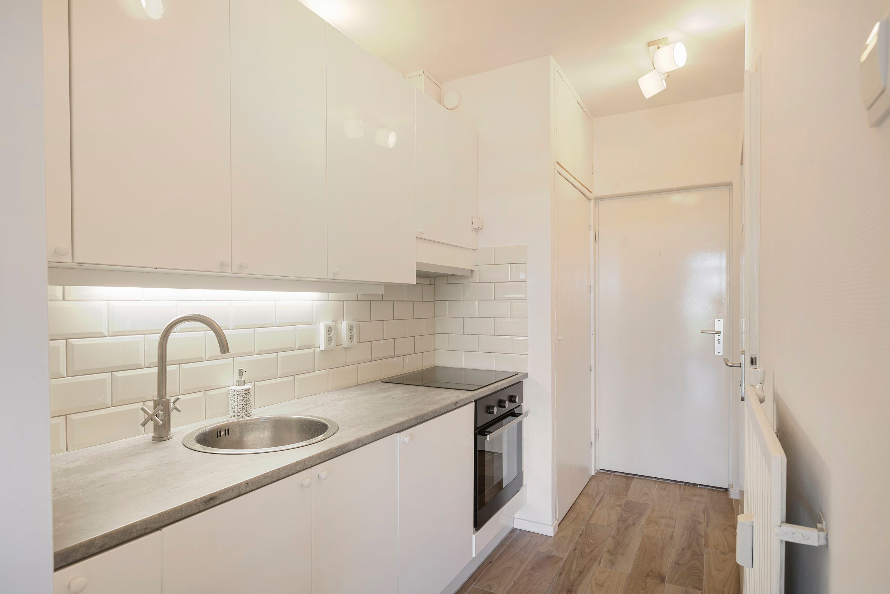 Bij binnenkomst in de hal, waar zich een vaste kast met de meterkast bevindt, heb je direct toegang tot de keuken. De keuken is ingericht met een recht keukenblok in een lichte en tijdloze kleurstelling. Vanuit de keuken bereik je zowel het woongedeelte als de badkamer.