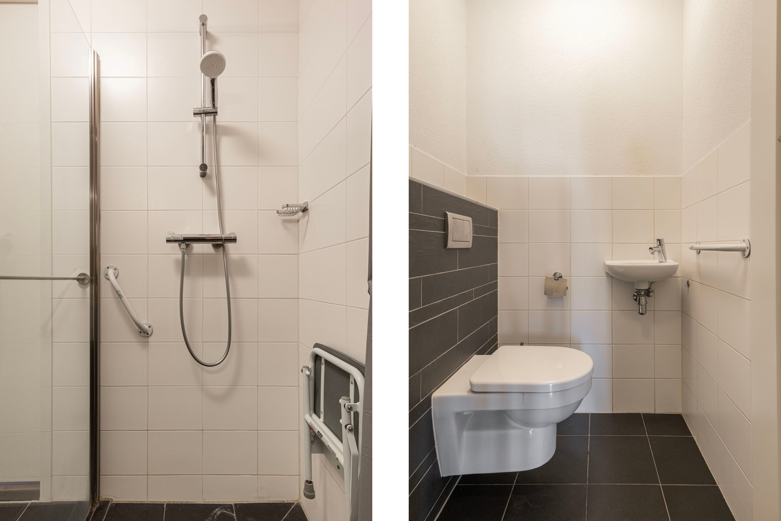 De badkamer is voorzien van een inloopdouche en een wastafel met meubel, terwijl het toilet zich apart bevindt. Alles binnen handbereik.