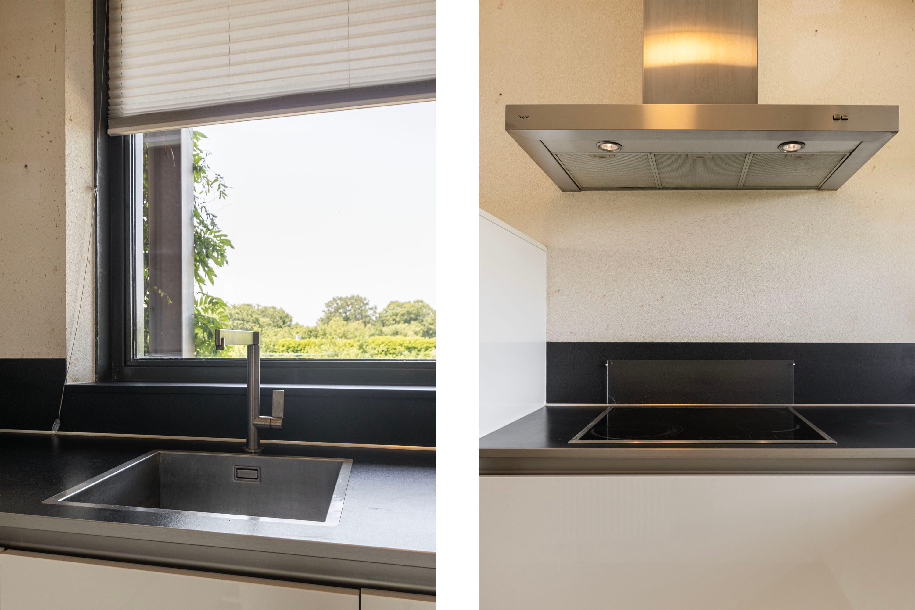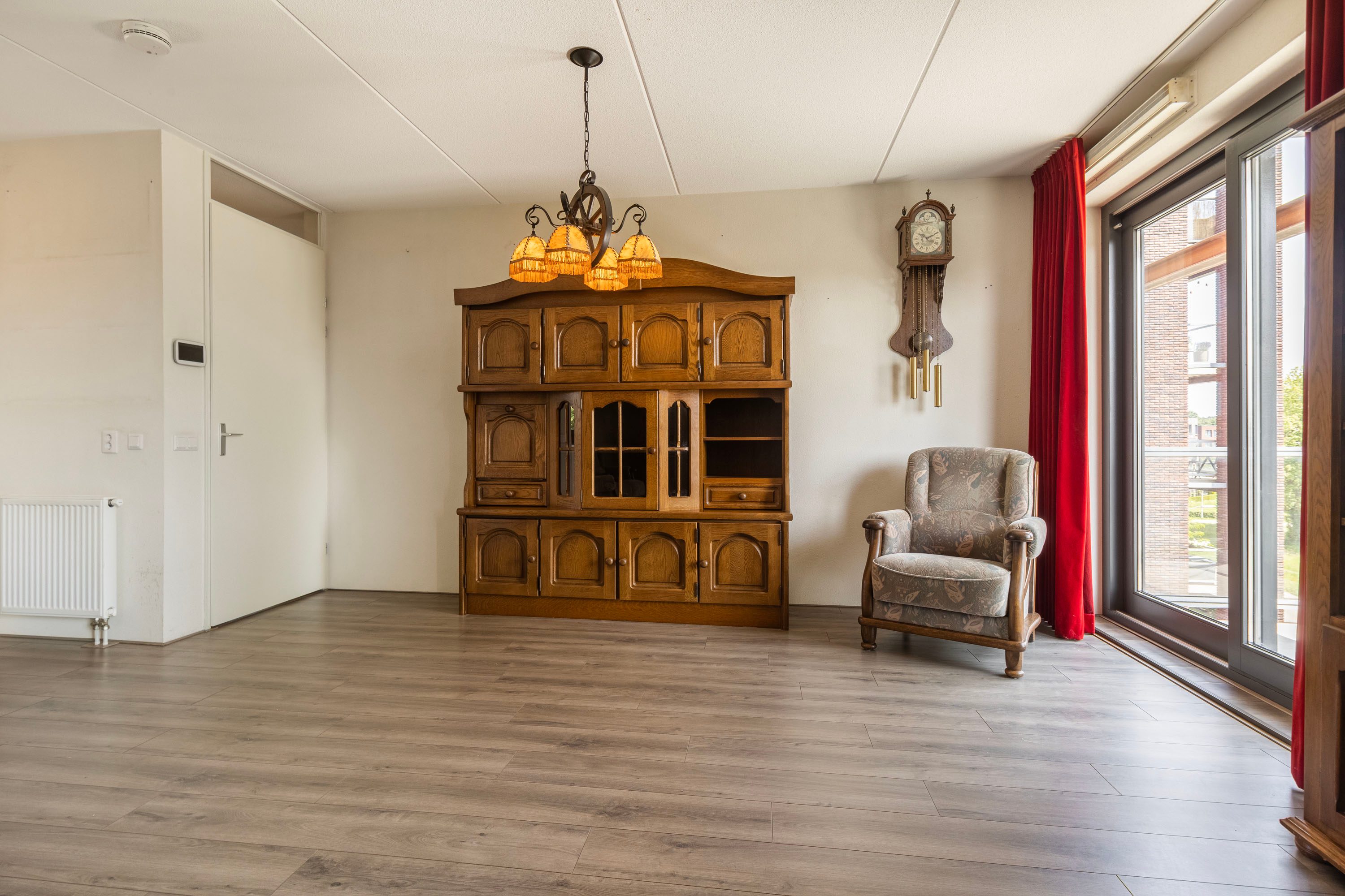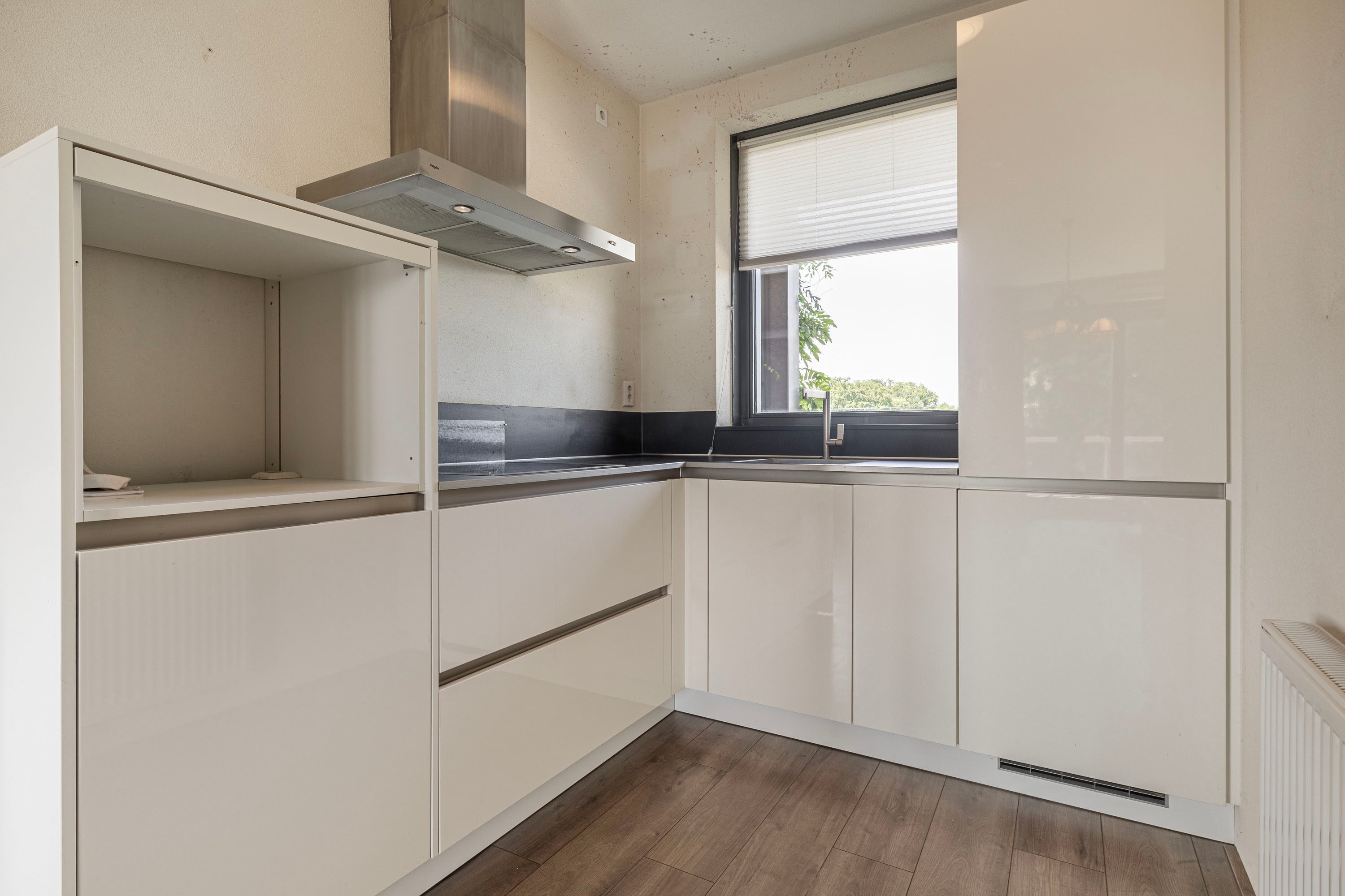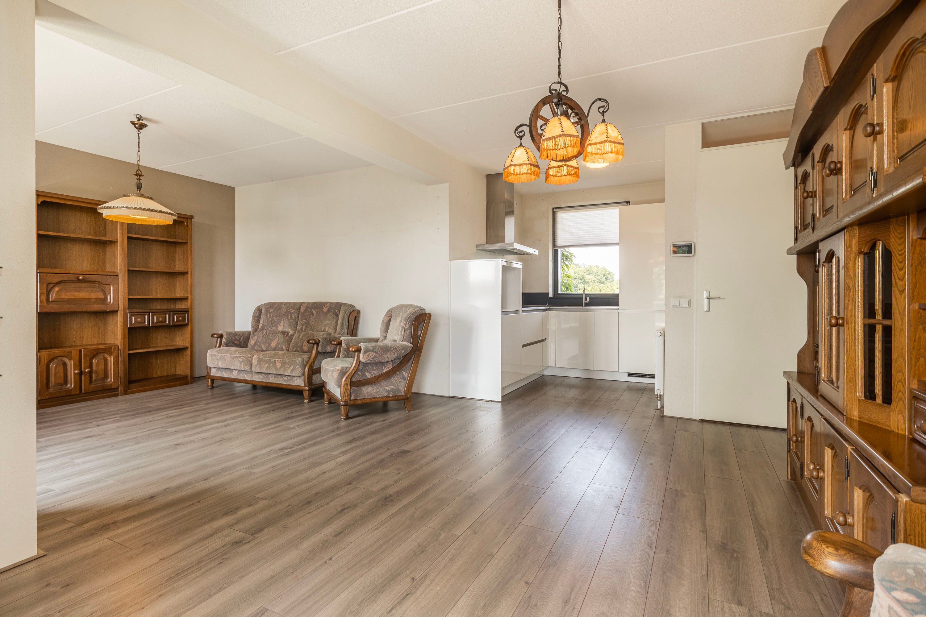 Bij binnenkomst in de woonkamer valt direct het binnenvallende daglicht op. Er is hier voldoende ruimte om zowel een gezellige eethoek als een comfortabel zitgedeelte te creëren. Daarnaast vind je in deze ruimte de keuken, slim opgesteld in een L-vorm met inbouwapparatuur zoals een inductiekookplaat en een praktische koel-vriescombinatie.