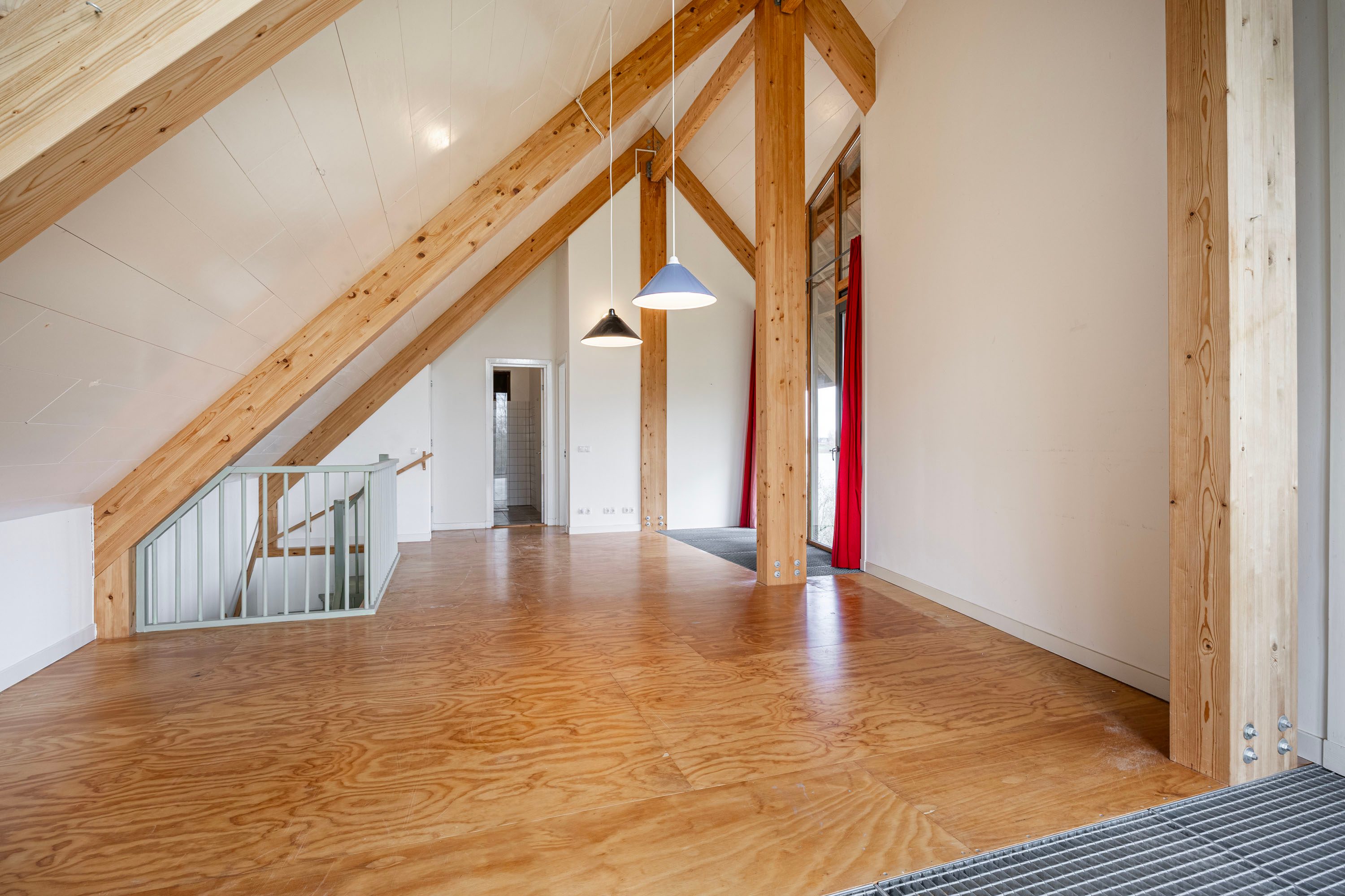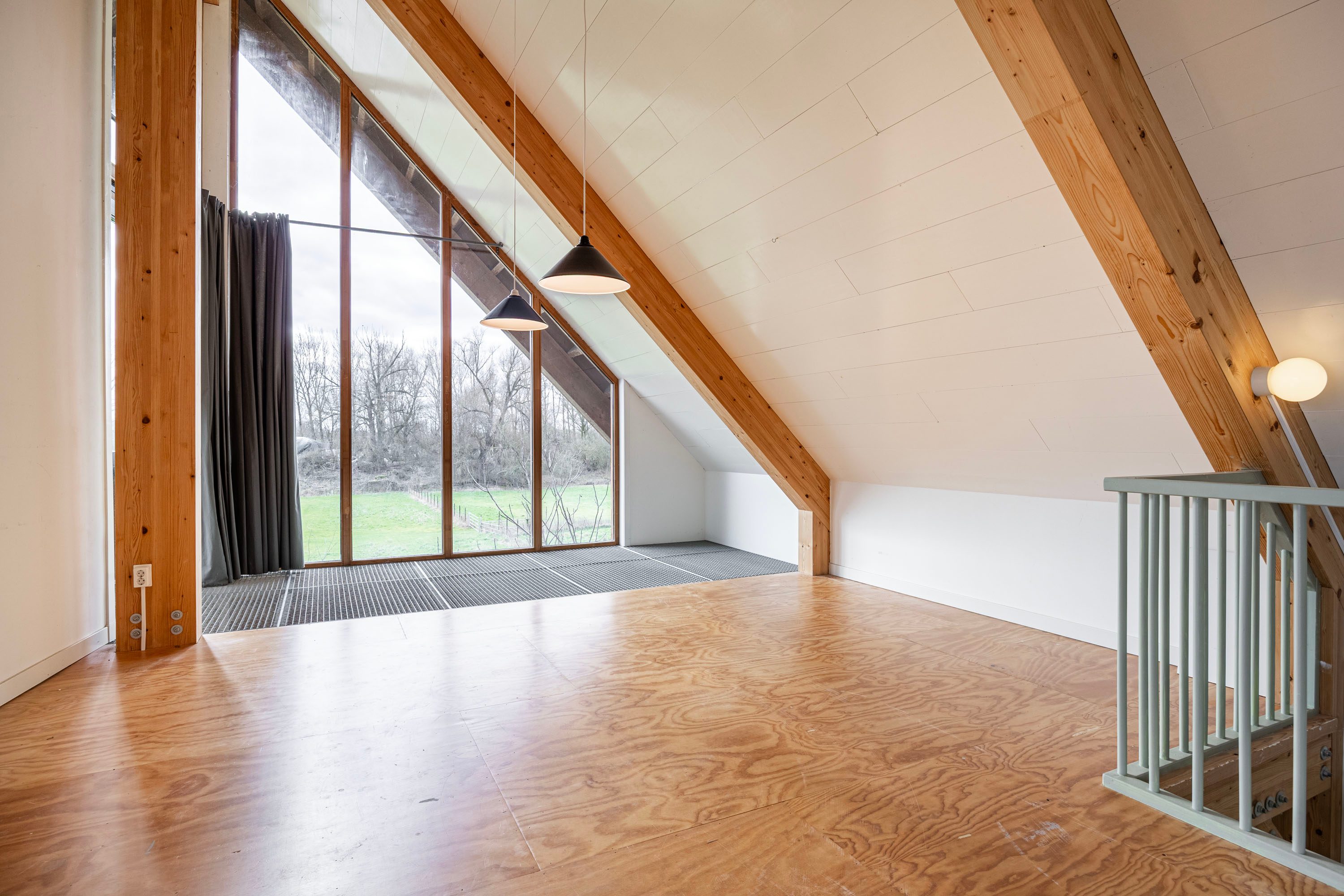 De verdieping is een prachtige, open ruimte met volop mogelijkheden. Dankzij de indrukwekkende hoogte, de houten draagconstructie en de grote raampartijen heerst hier een bijzondere sfeer waarin licht, ruimte en uitzicht centraal staan. De huidige indeling bestaat uit een royale multifunctionele ruimte die uitstekend dienstdoet als slaap-, werk-, hobby- of atelierruimte. Door de glazen puien aan beide zijden geniet je van panoramisch zicht op het omliggende landschap en valt het daglicht rijkelijk binnen.