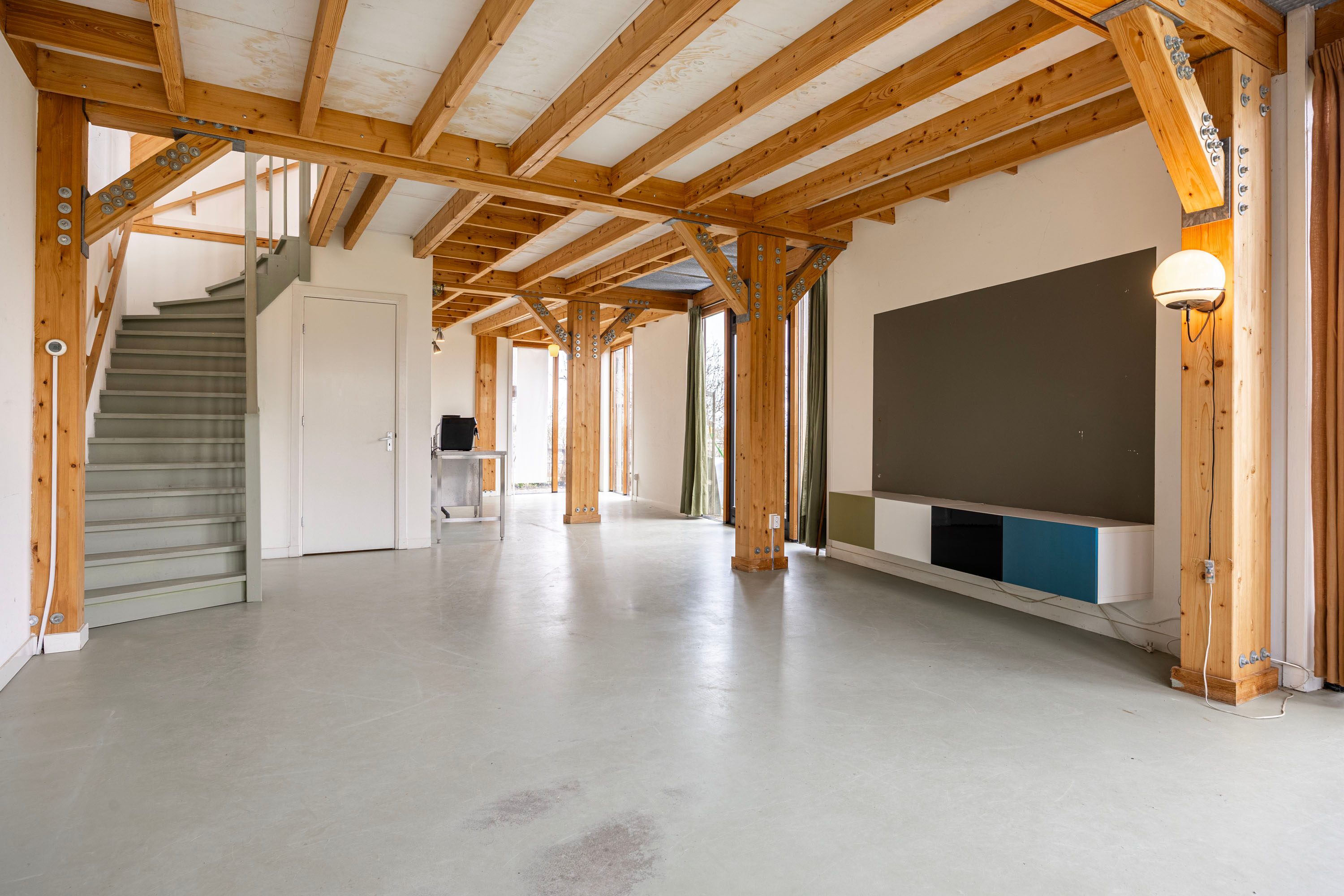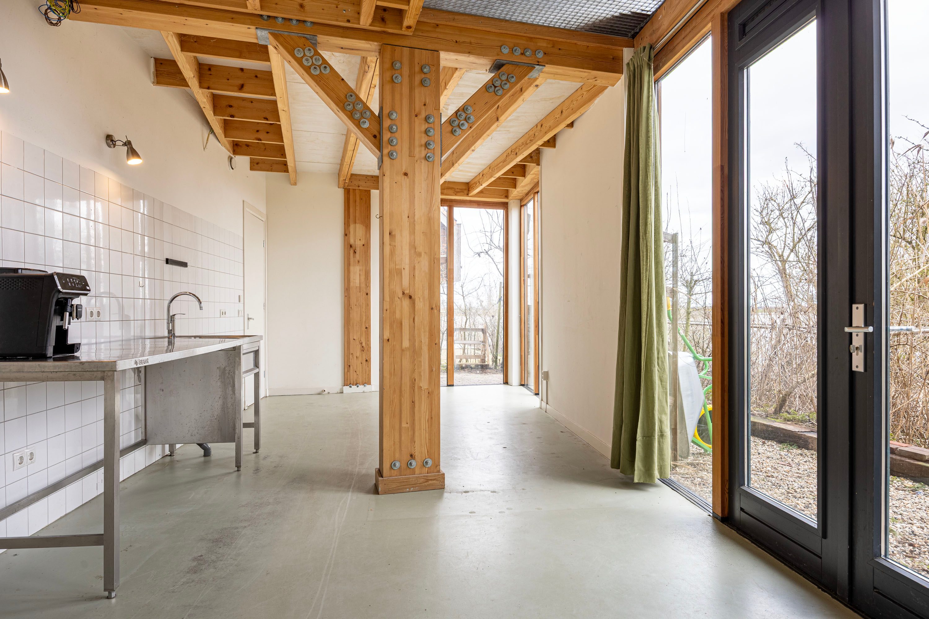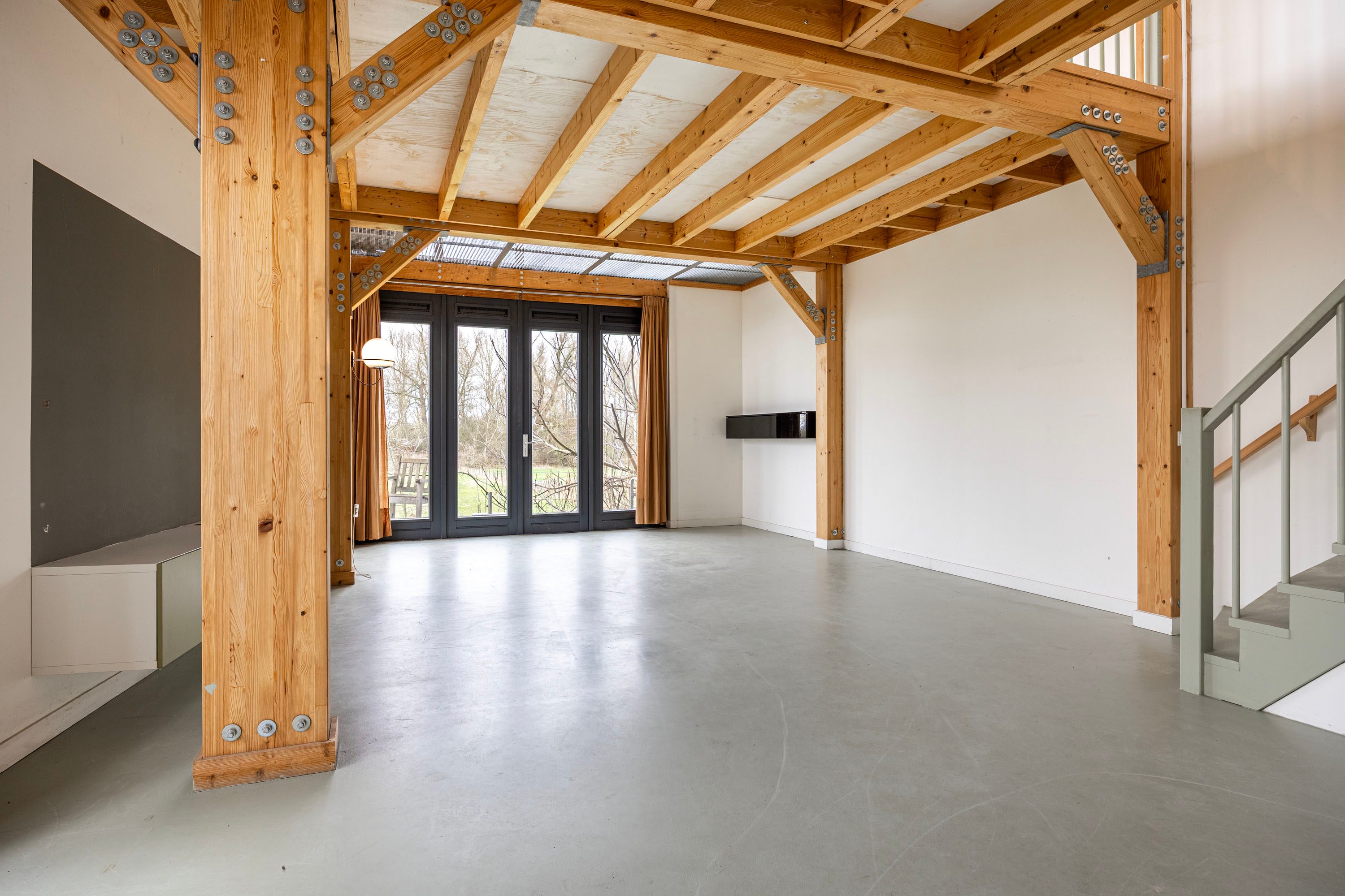 Vanuit de keuken loopt de ruimte naadloos over in de ruime woonkamer, waar de houten kolommen en balken direct in het oog springen. De deels open plafondconstructie met metalen roosters versterkt het moderne, stoere karakter van de woning. Het samenspel van hout en staal geeft de leefruimte een subtiele industriële touch, zonder in te leveren op warmte en sfeer. De lange zichtlijnen en de royale opzet zorgen bovendien voor een bijzonder licht en ruimtelijk gevoel.