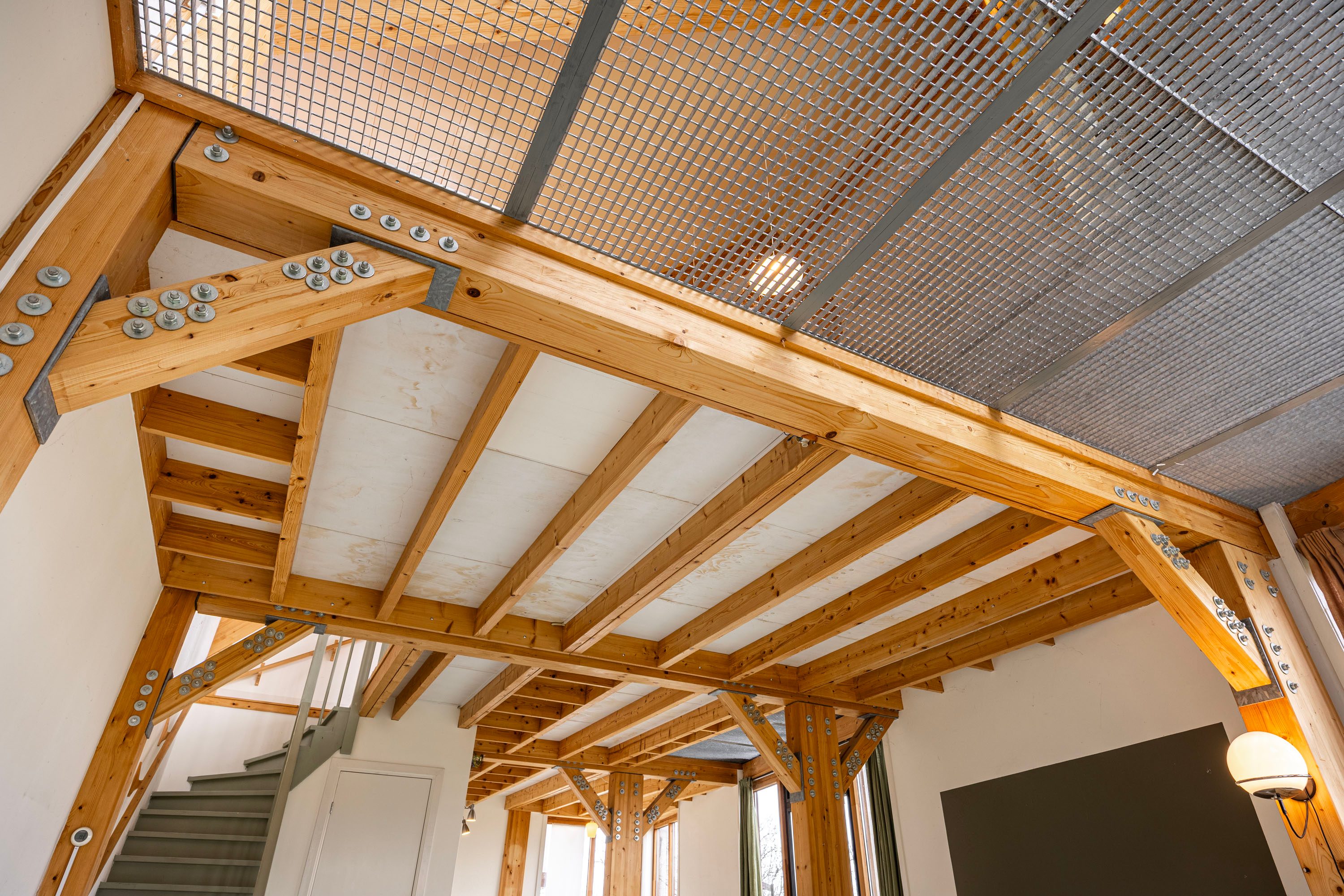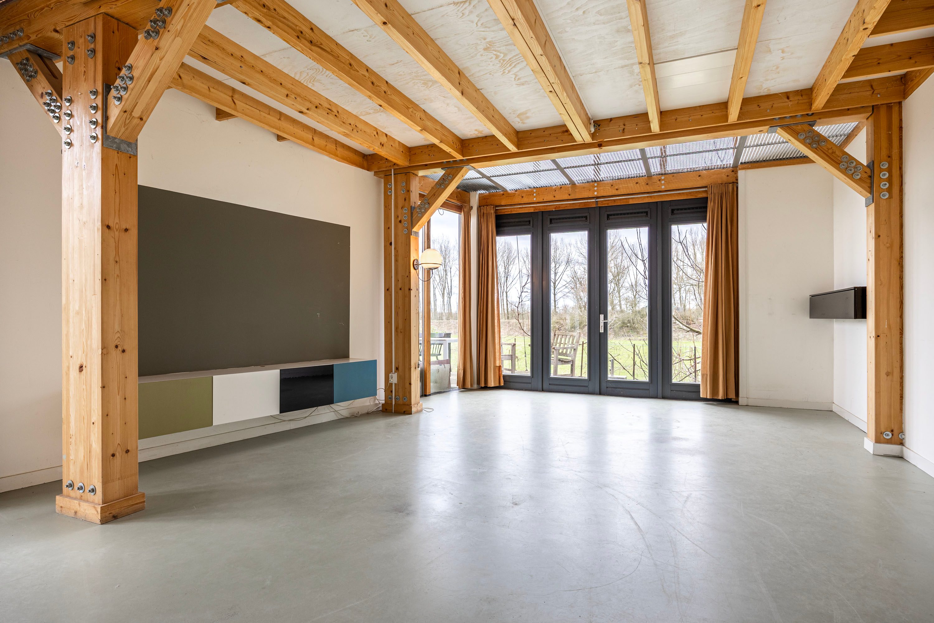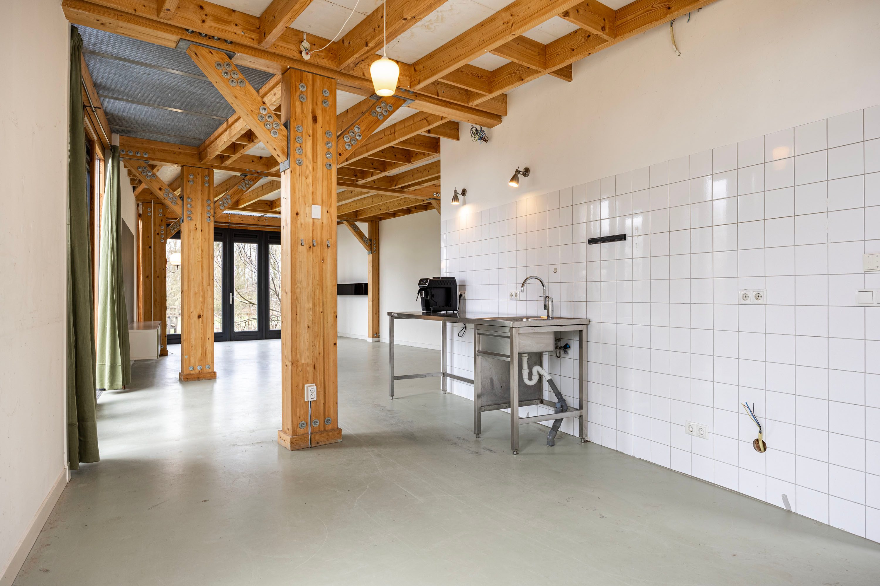 Vanuit de keuken loopt de ruimte naadloos over in de ruime woonkamer, waar de houten kolommen en balken direct in het oog springen. De deels open plafondconstructie met metalen roosters versterkt het moderne, stoere karakter van de woning. Het samenspel van hout en staal geeft de leefruimte een subtiele industriële touch, zonder in te leveren op warmte en sfeer. De lange zichtlijnen en de royale opzet zorgen bovendien voor een bijzonder licht en ruimtelijk gevoel.