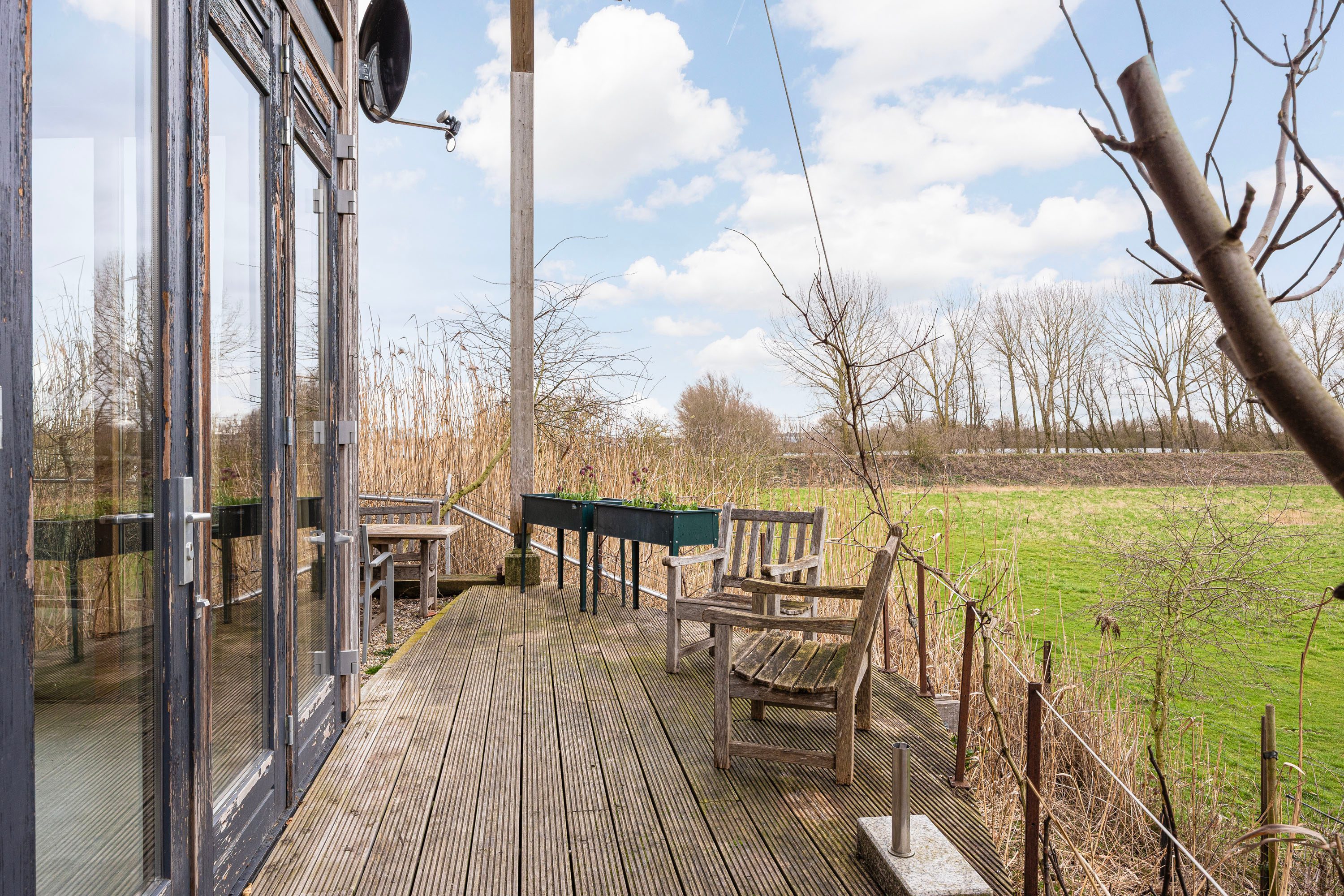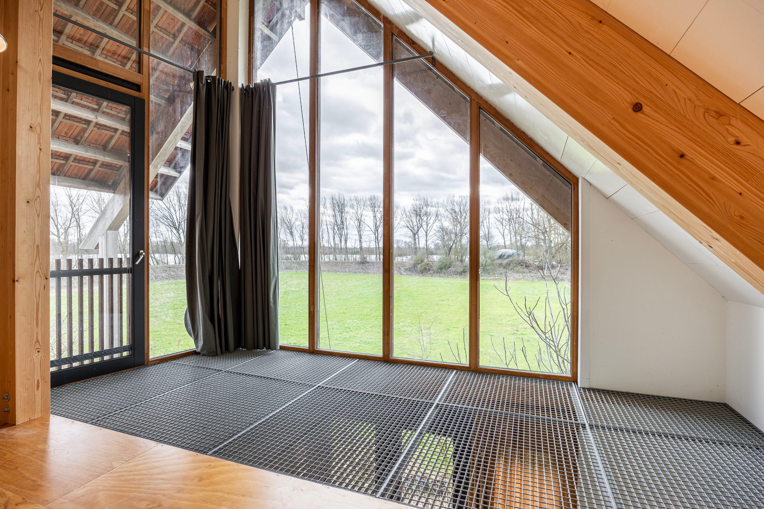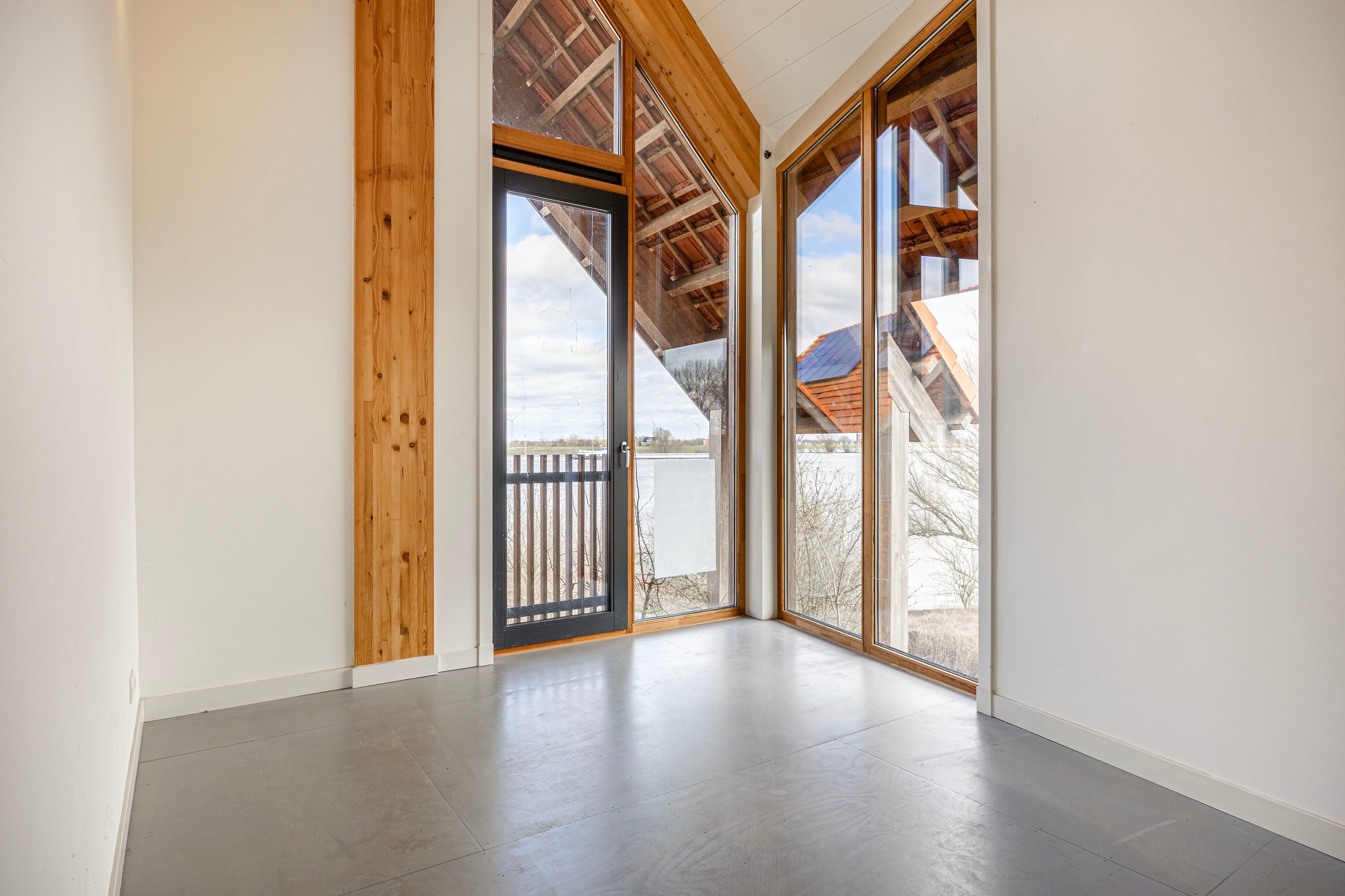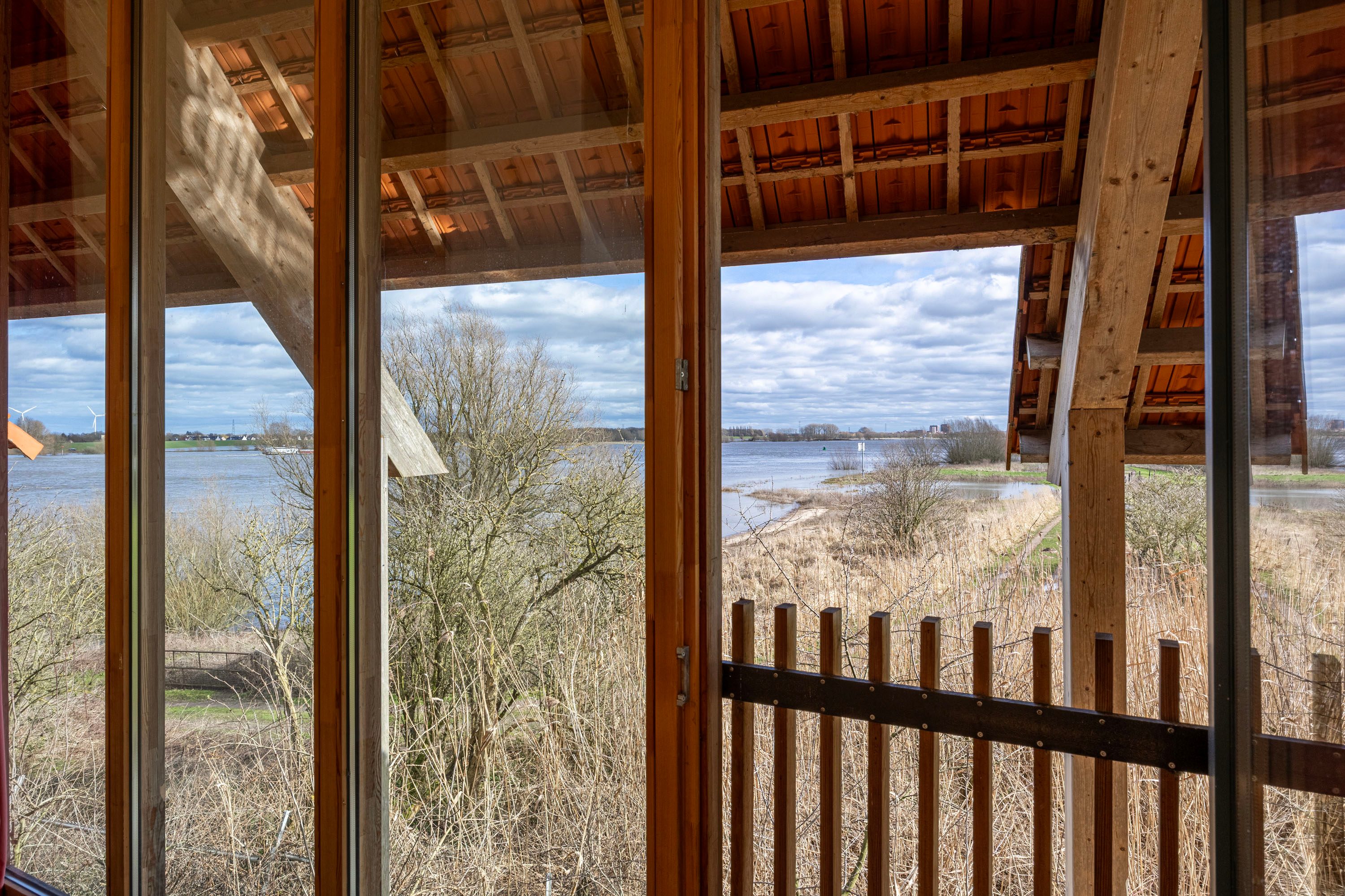 - Grote ramen in lariks houten kozijnen met uitzicht op Waal, landschap en tuin