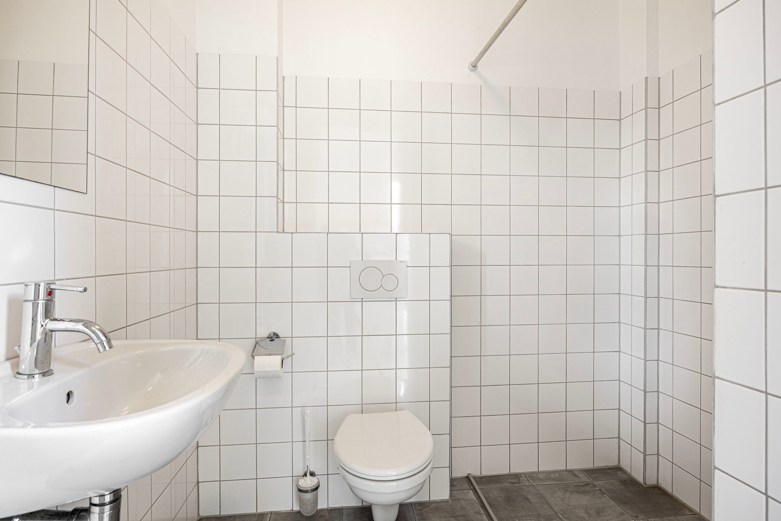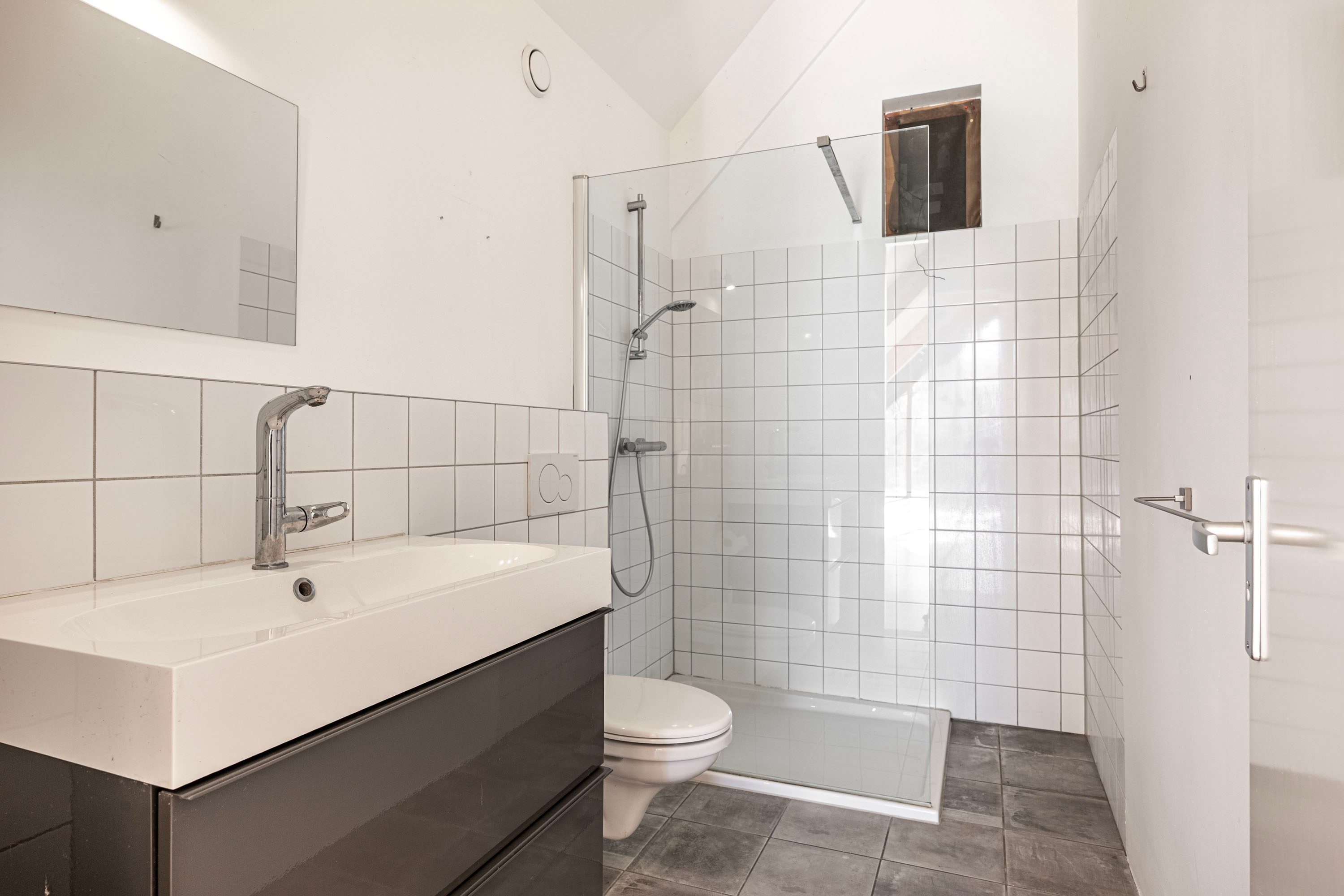 Op de begane grond vind je daarnaast een praktische berging en de 1e badkamer. Deze badkamer is uitgerust met een toilet, een wastafel en een inloopdouche.