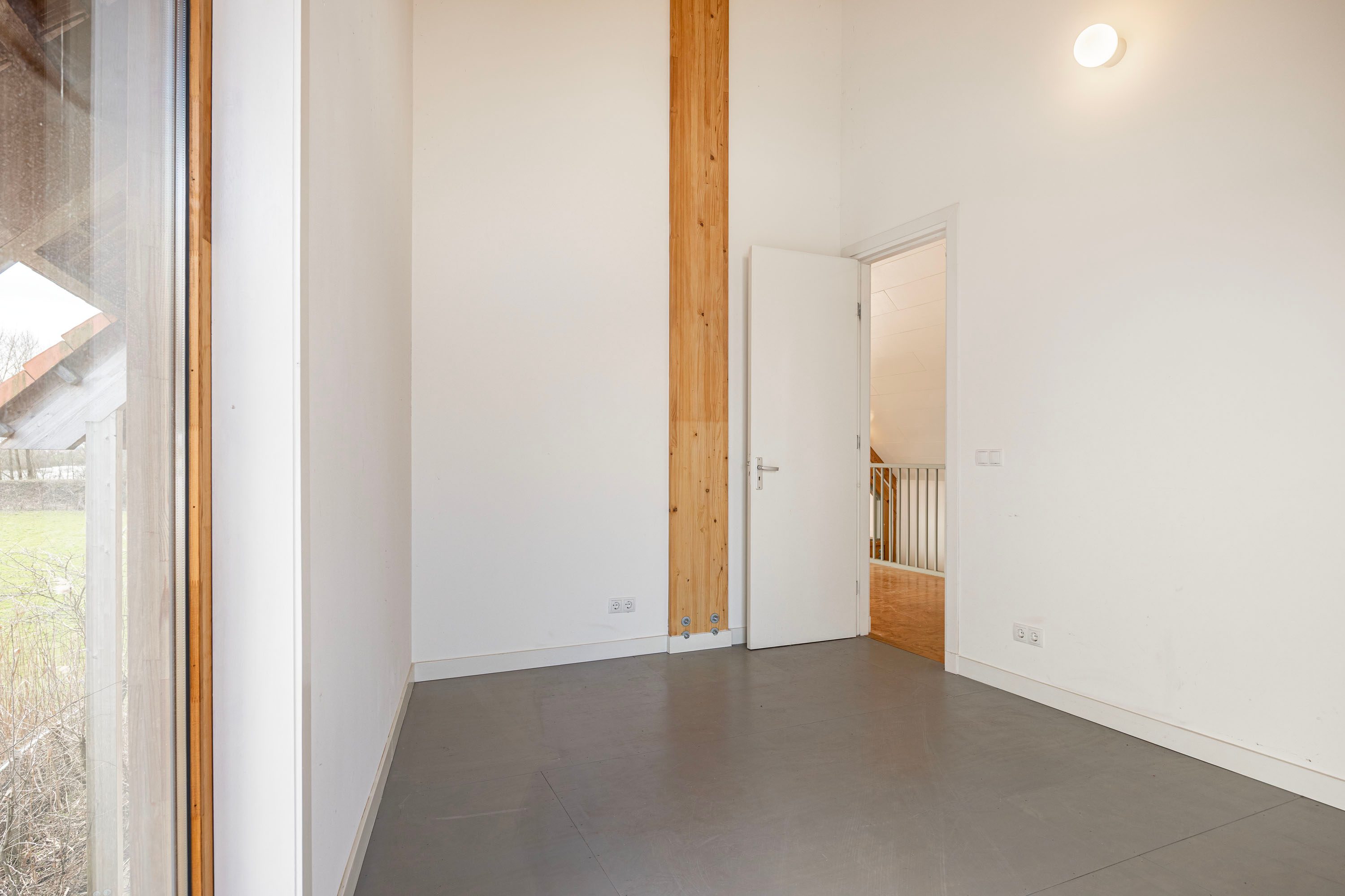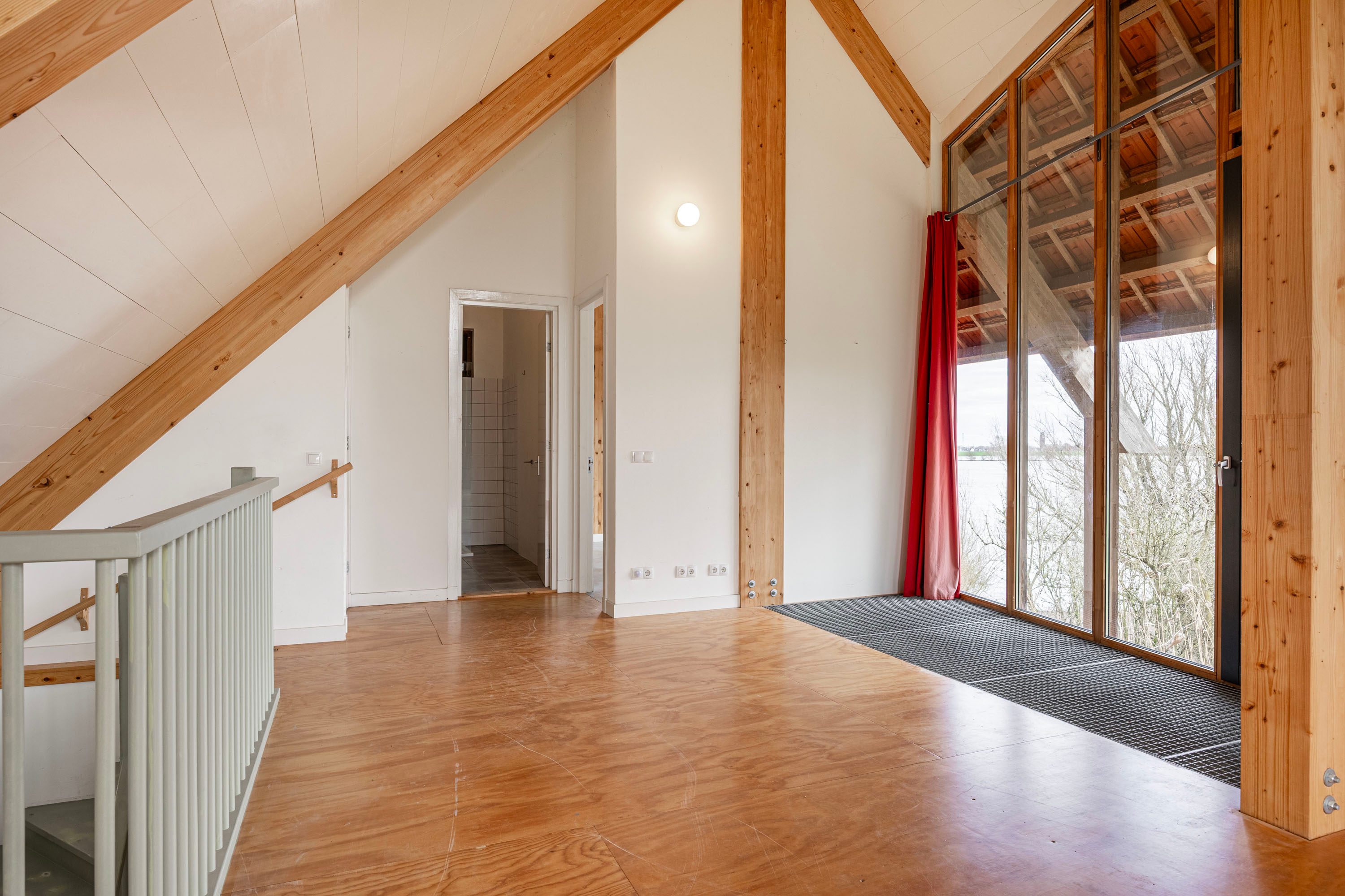 Binnen geniet je van een ruime woonkamer van circa 40 m², een eenvoudige keuken, badkamer en berging. De hoge ramen, de hoogte van de ruimte en het weidse uitzicht zorgen voor een lichte en indrukwekkende sfeer. De bovenverdieping biedt ruimte voor meerdere slaapkamers en is momenteel ingedeeld als een multifunctionele hobby- of atelierruimte, aangevuld met een slaapkamer, badkamer en een praktische berg-/wasruimte. Dankzij de groene omgeving kijk je vanaf elke hoek uit over het landschap, de Waal en de karakteristieke steenfabriek. De grote ramen in lariks houten kozijnen kaderen de vergezichten als kunstwerken in de schuine wanden met steeds wisselende perspectieven.