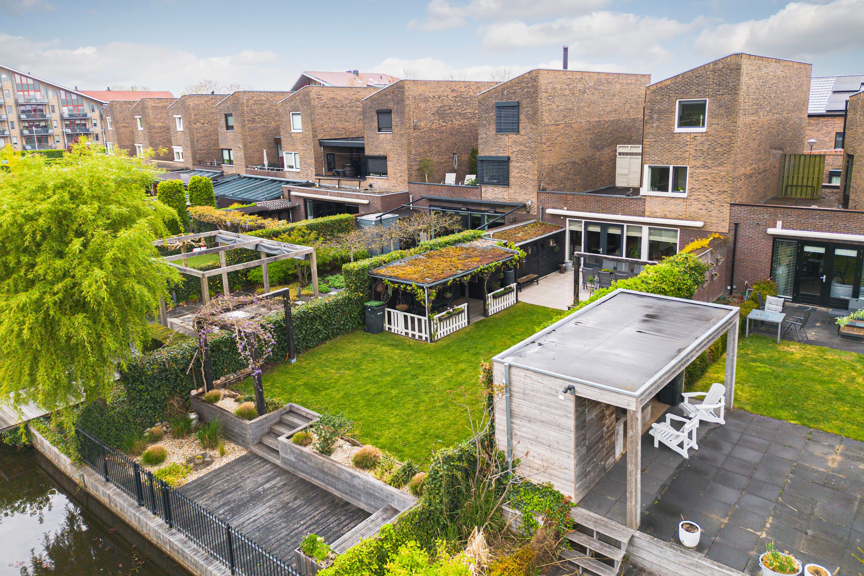 Een veranda aan de buitenschuur zorgt voor een plek om te kunnen genieten van het buitenleven. Aan het einde van de tuin ligt de vlonder, afgescheiden van het water middels een hek met toegang tot de waterpartij.
