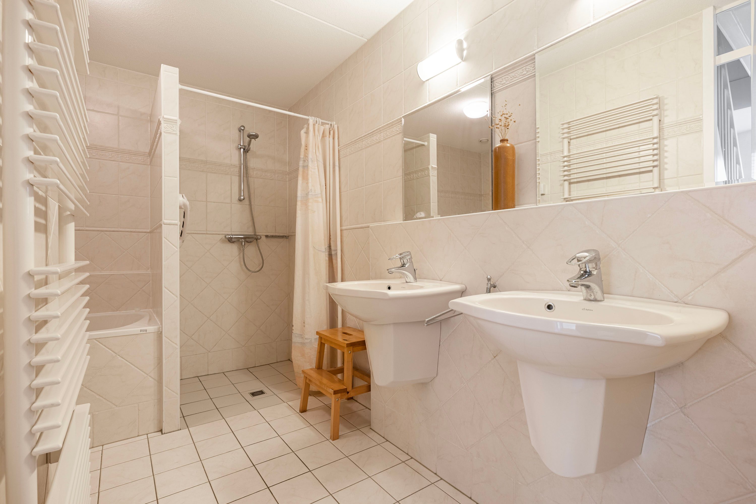 + Dubbele wastafel en een wandmeubel;