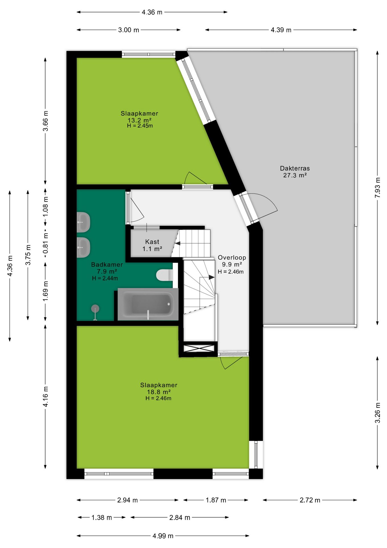 Vanaf de overloop is er toegang tot het dakterras van maar liefst 27 m². Gelegen op het zuiden en tussen de woningen in biedt deze veel privacy.