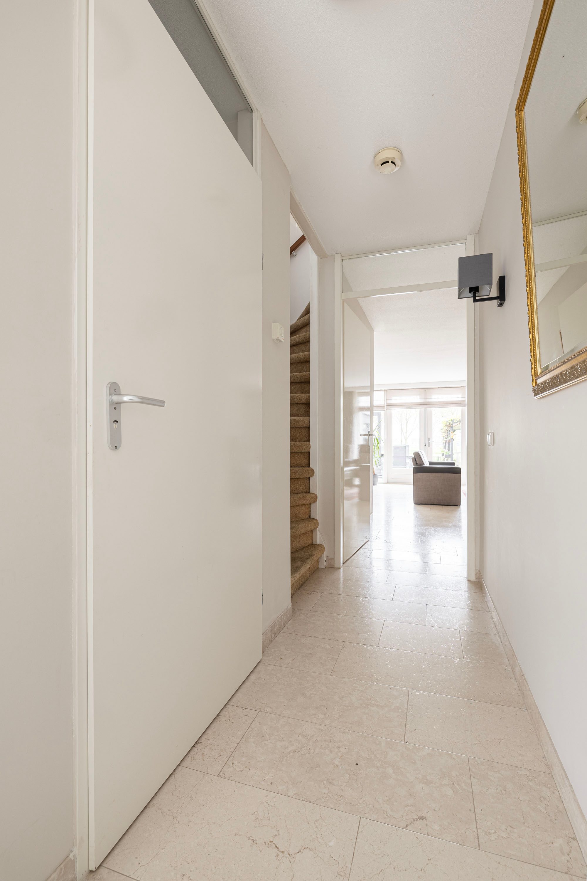 Hal/entree met toegang tot de meterkast, het toilet met fonteintje, trapopgang naar de eerste verdieping, garderobenis en toegang tot de aan de achterzijde gelegen ruime woonkamer die is voorzien van grote raampartijen en openslaande deuren naar de zonnige tuin. Vanuit de woonkamer loop je via het eetgedeelte naar de aan de voorzijde gelegen keuken met veel bergruimte welke is voorzien van diverse inbouwapparatuur waaronder begrepen: