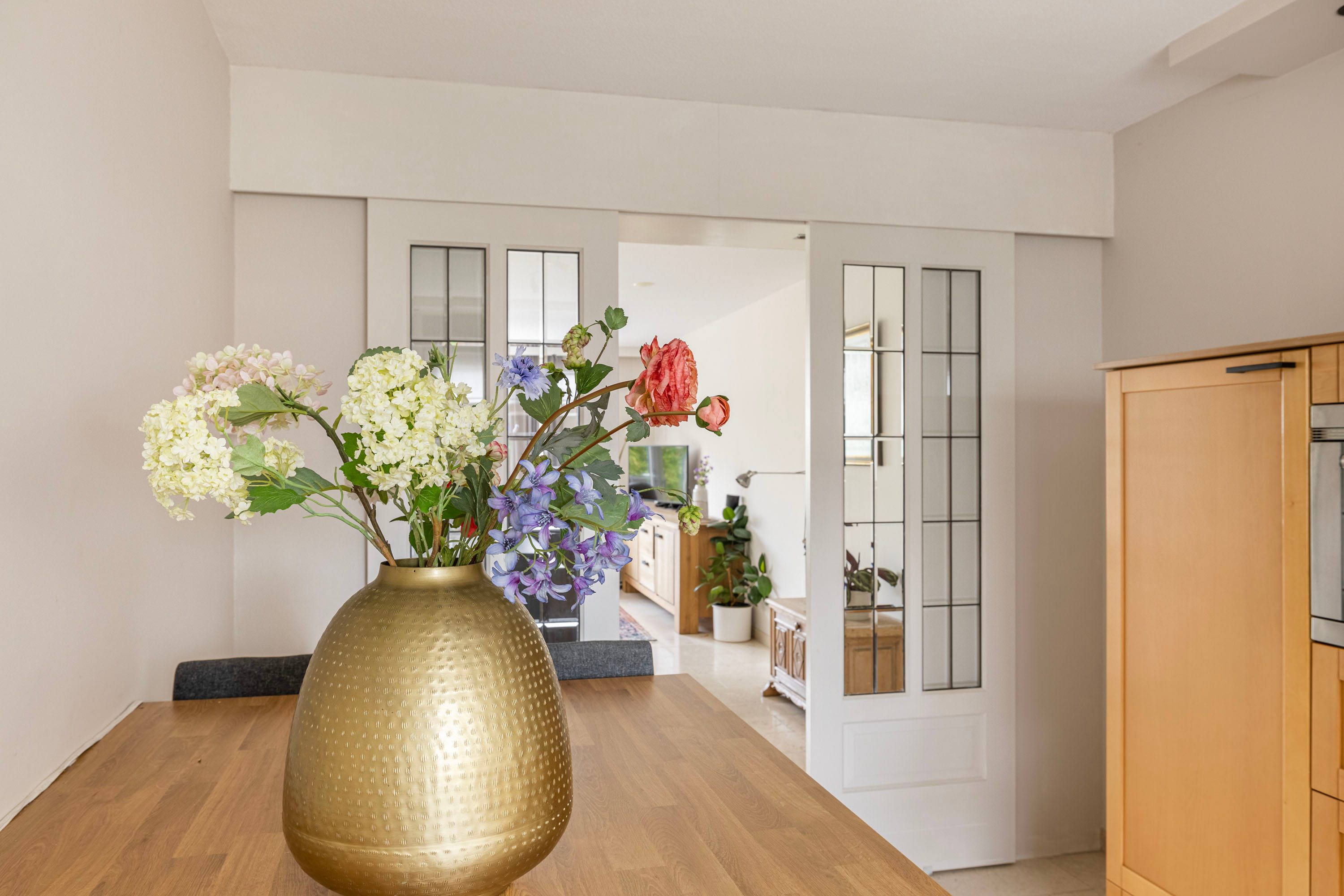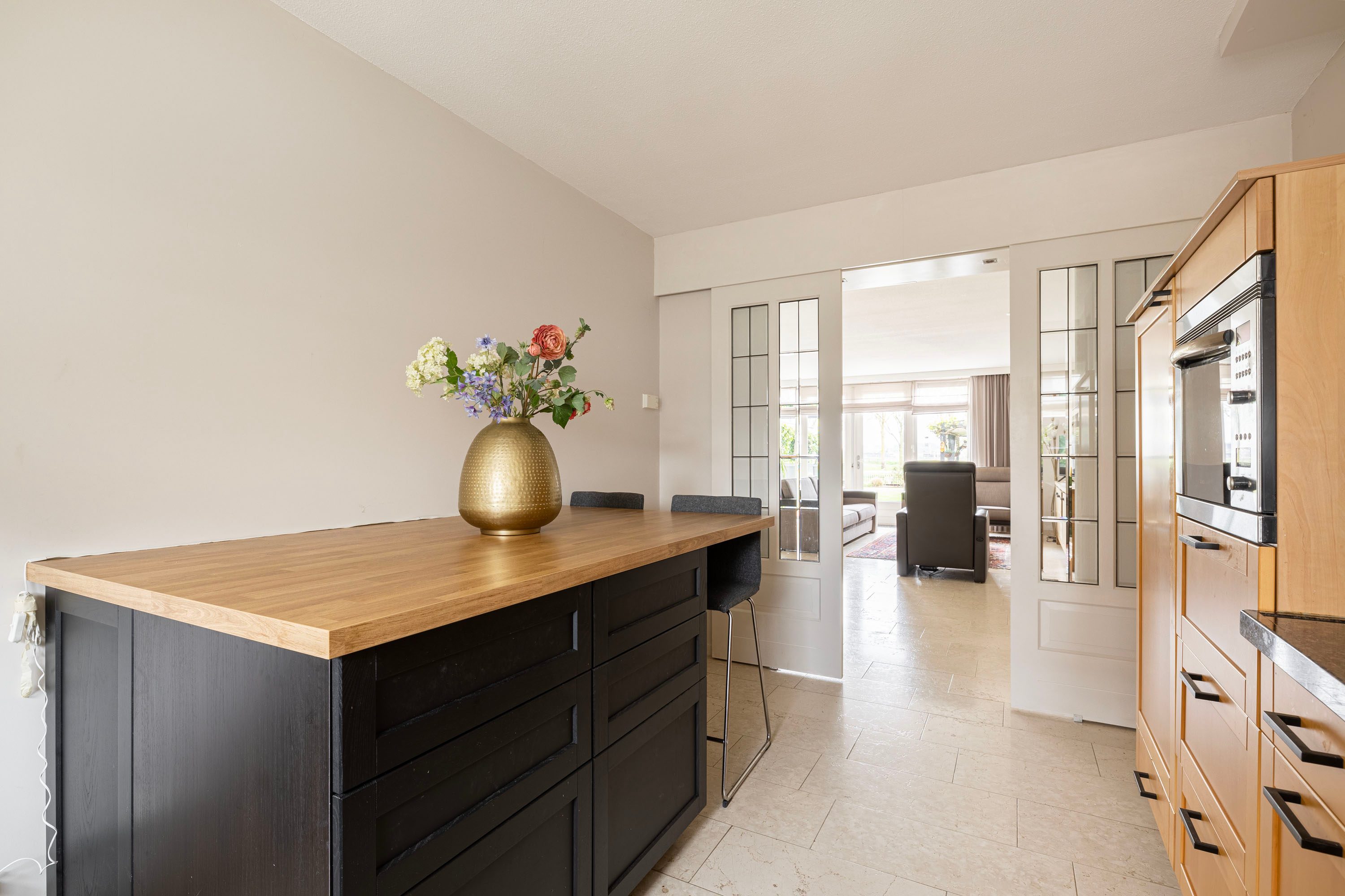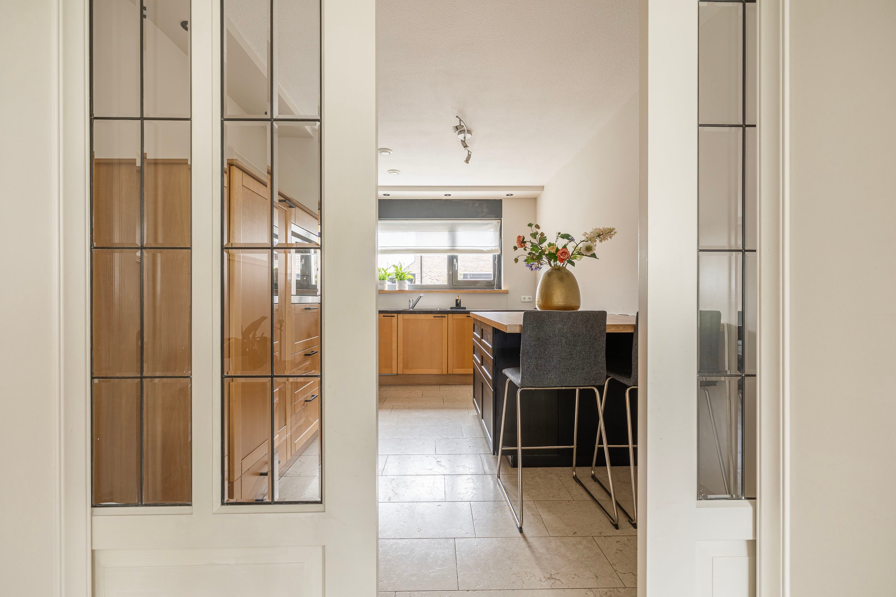Hal/entree met toegang tot de meterkast, het toilet met fonteintje, trapopgang naar de eerste verdieping, garderobenis en toegang tot de aan de achterzijde gelegen ruime woonkamer die is voorzien van grote raampartijen en openslaande deuren naar de zonnige tuin. Vanuit de woonkamer loop je via het eetgedeelte naar de aan de voorzijde gelegen keuken met veel bergruimte welke is voorzien van diverse inbouwapparatuur waaronder begrepen: