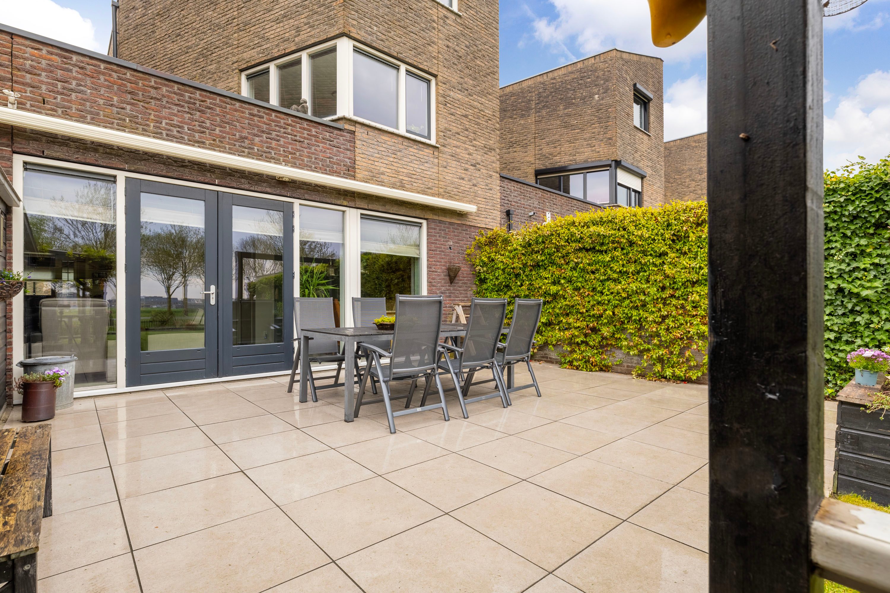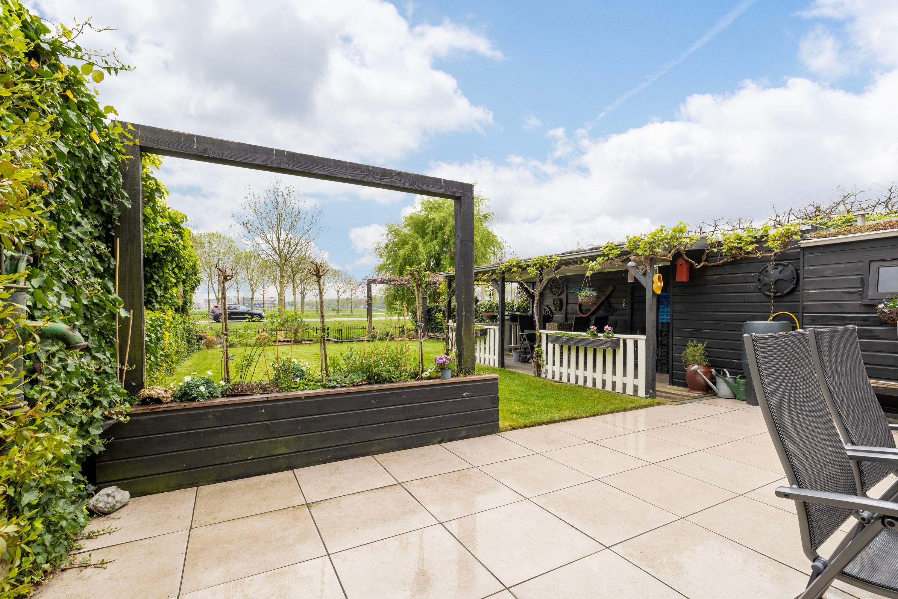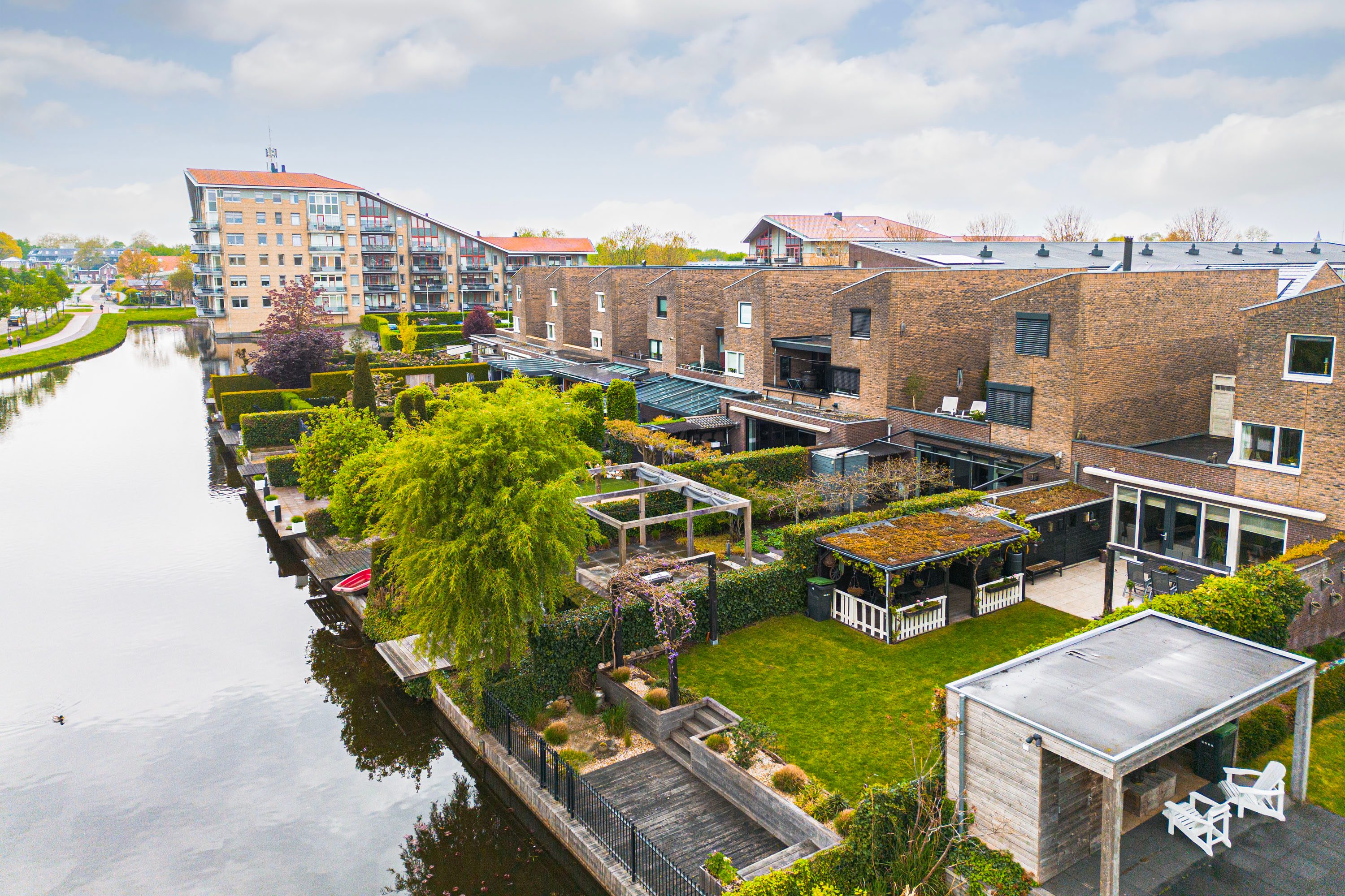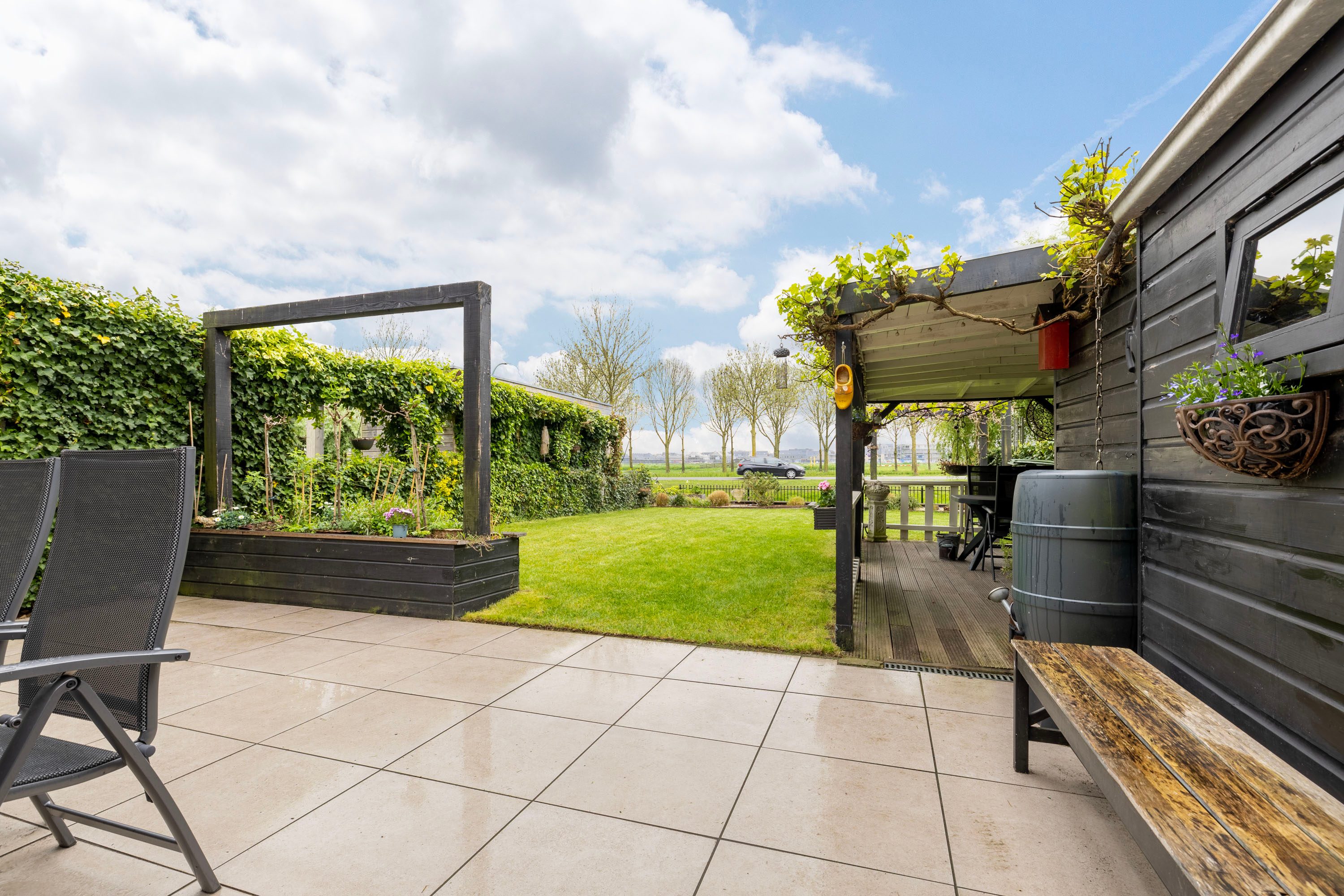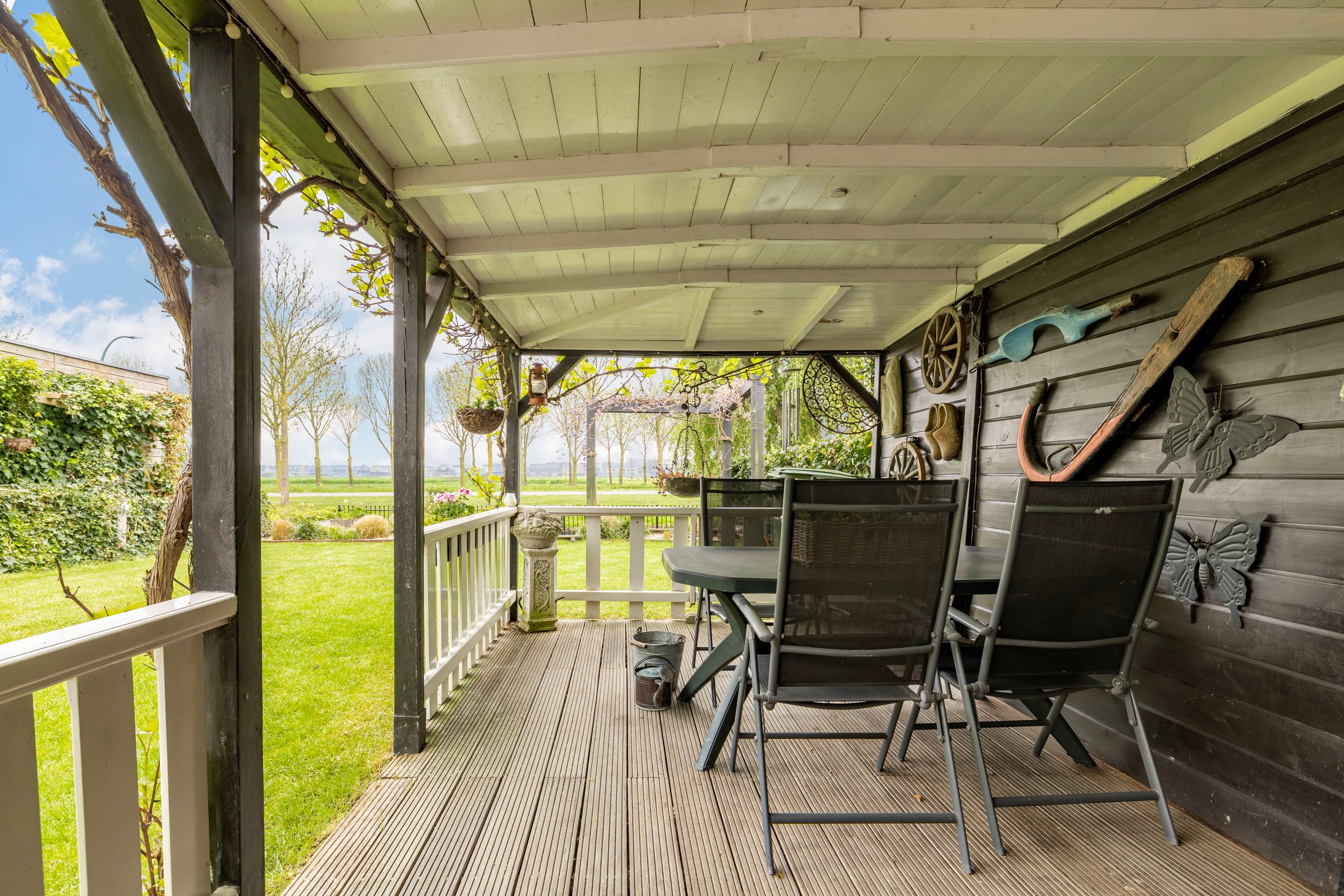 Een veranda aan de buitenschuur zorgt voor een plek om te kunnen genieten van het buitenleven. Aan het einde van de tuin ligt de vlonder, afgescheiden van het water middels een hek met toegang tot de waterpartij.