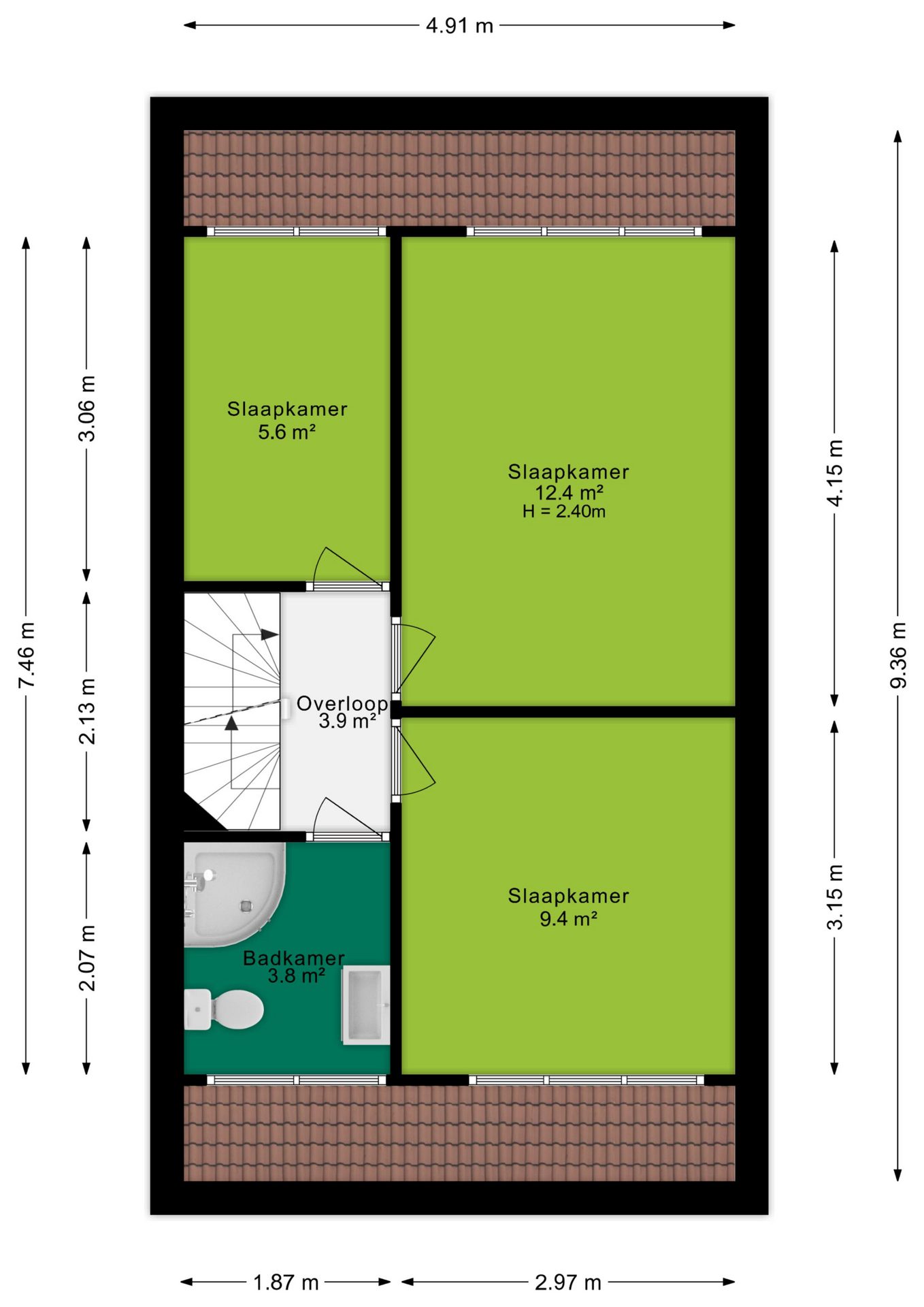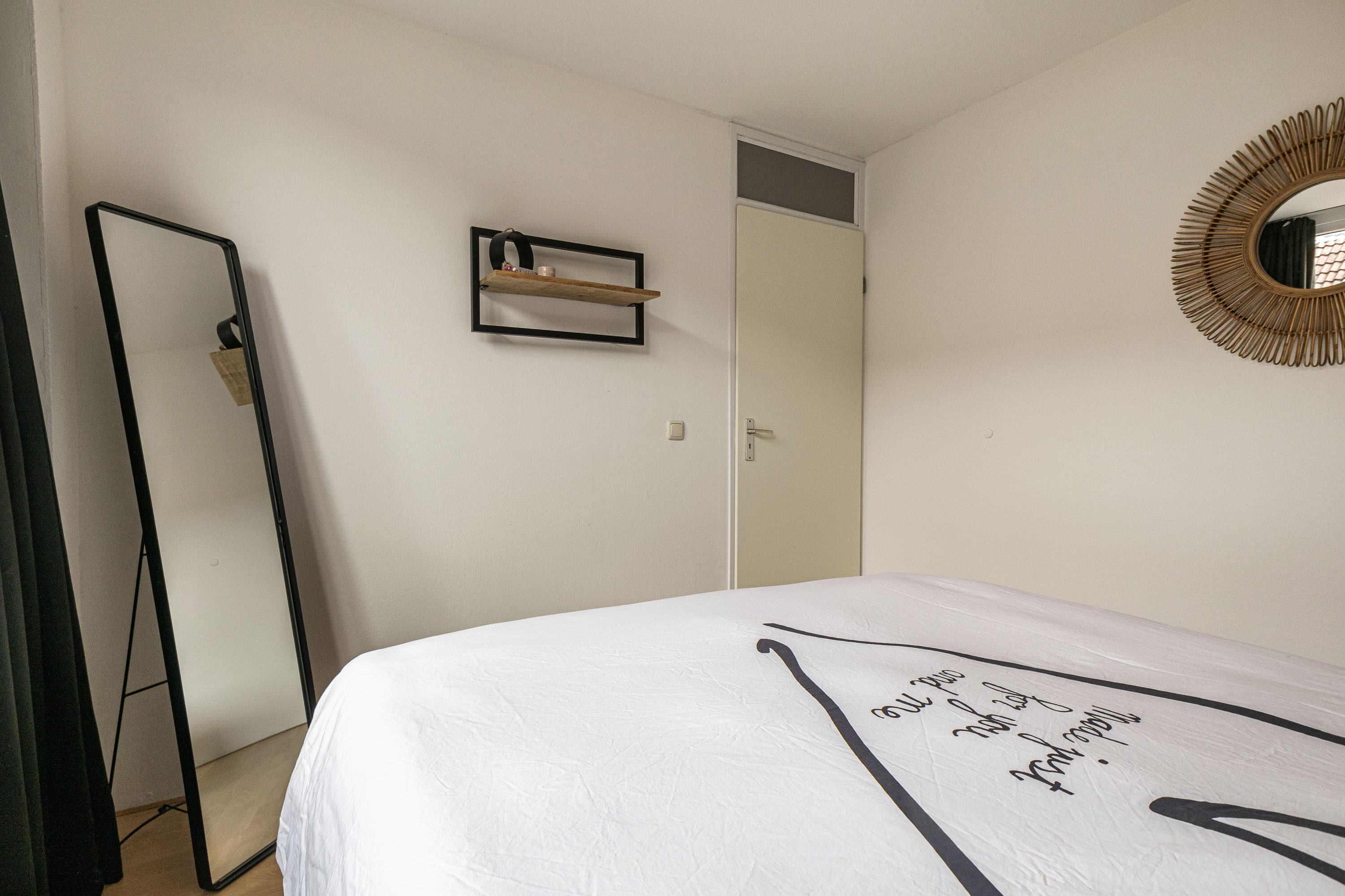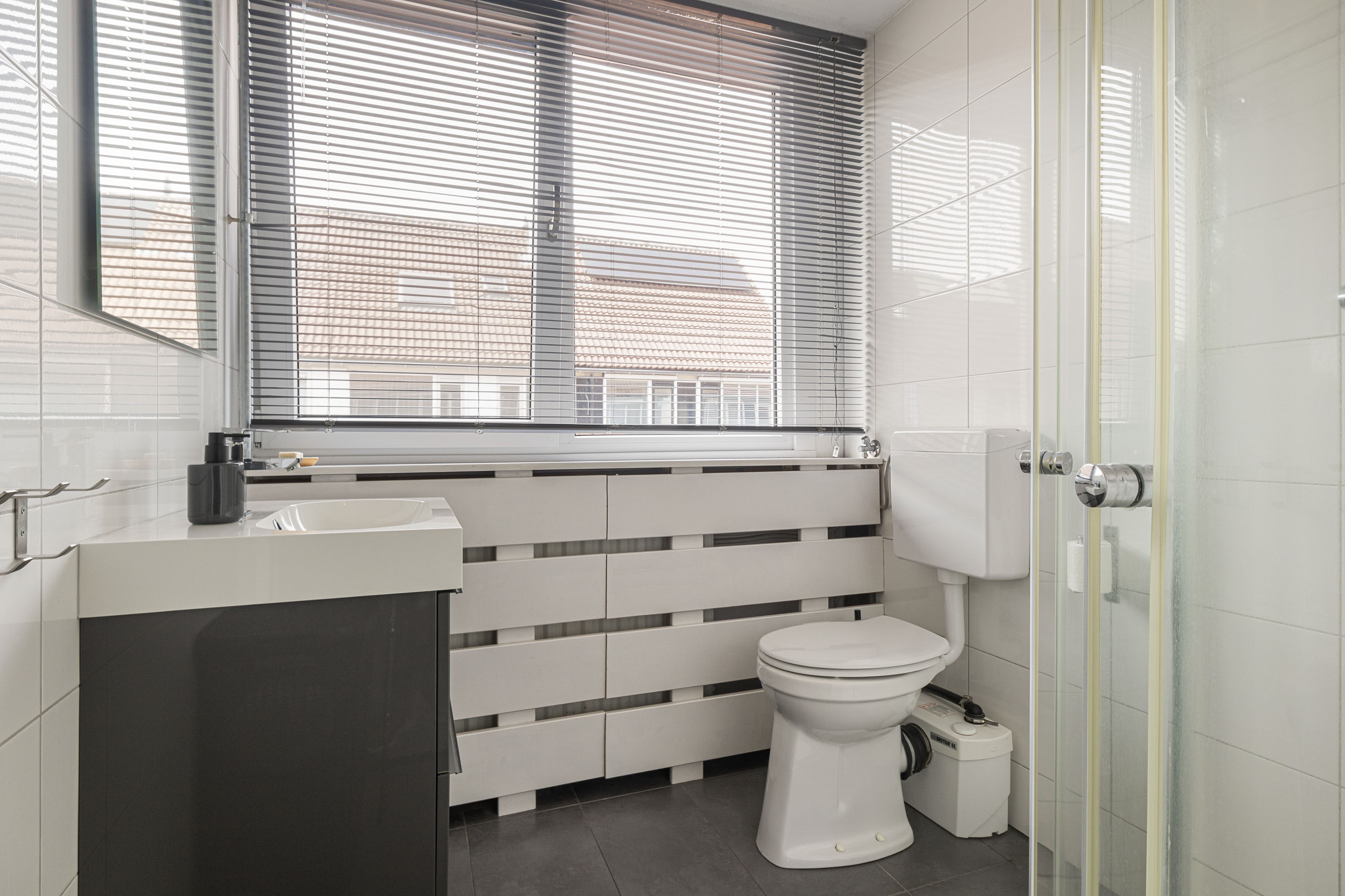 Een ruime overloop biedt toegang tot drie slaapkamers en de badkamer. De twee slaapkamers aan de achterzijde van de woning zijn 5,6 m² en 12,4 m² groot en bieden je prettig uitzicht over de verzorgde achtertuin. De 3e slaapkamer en de badkamer zijn gelegen aan de voorzijde van de woning. De slaapkamer is met circa 9,4 m² van een prettig formaat. De badkamer is bijna 4 m² groot en uitgevoerd met een 2e toilet, radiator met ombouw, wastafelmeubel met enkele wastafel, een inloopdouche en beschikt naast mechanische ventilatie ook over natuurlijke ventilatie door middel van een te openen raam.