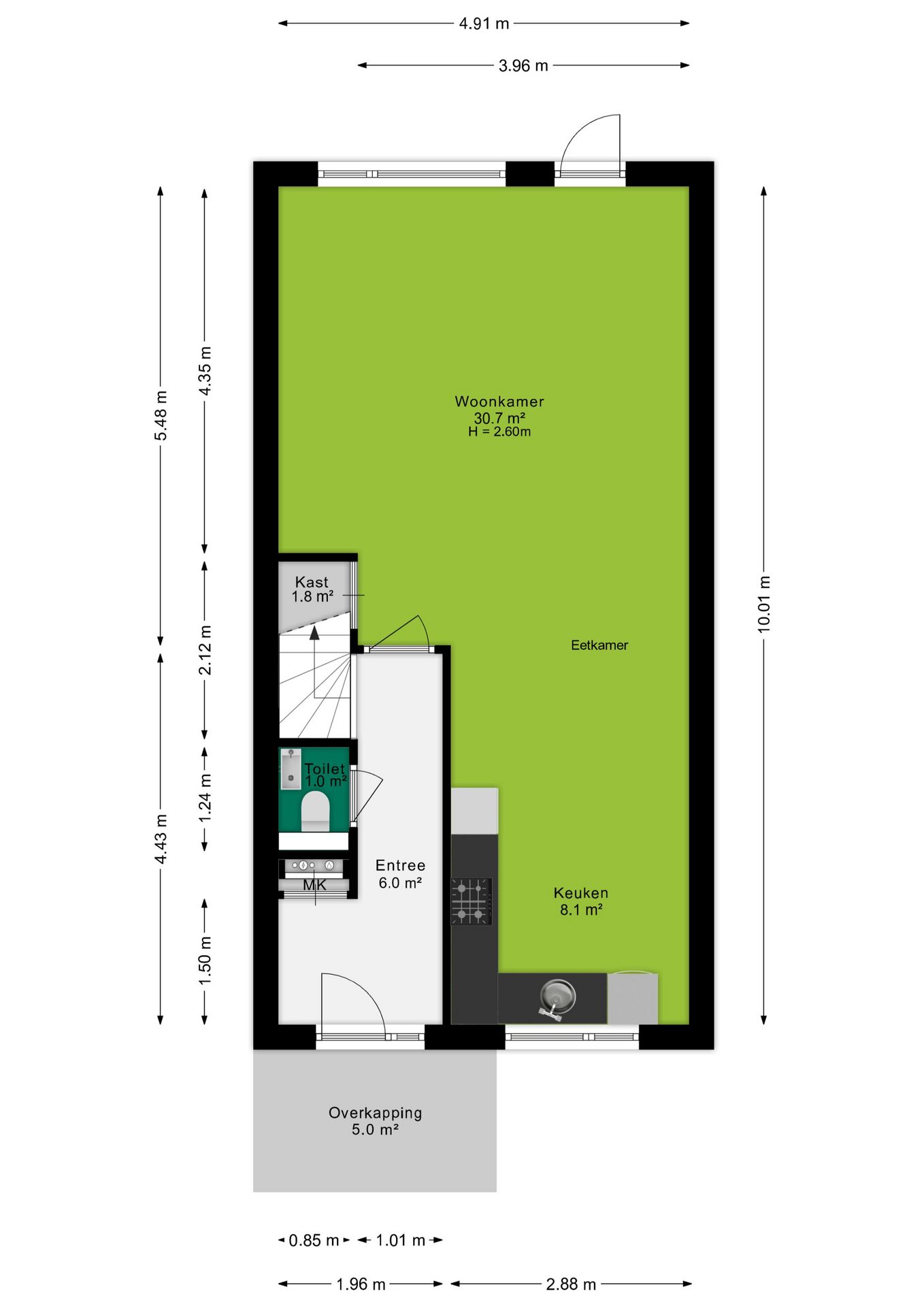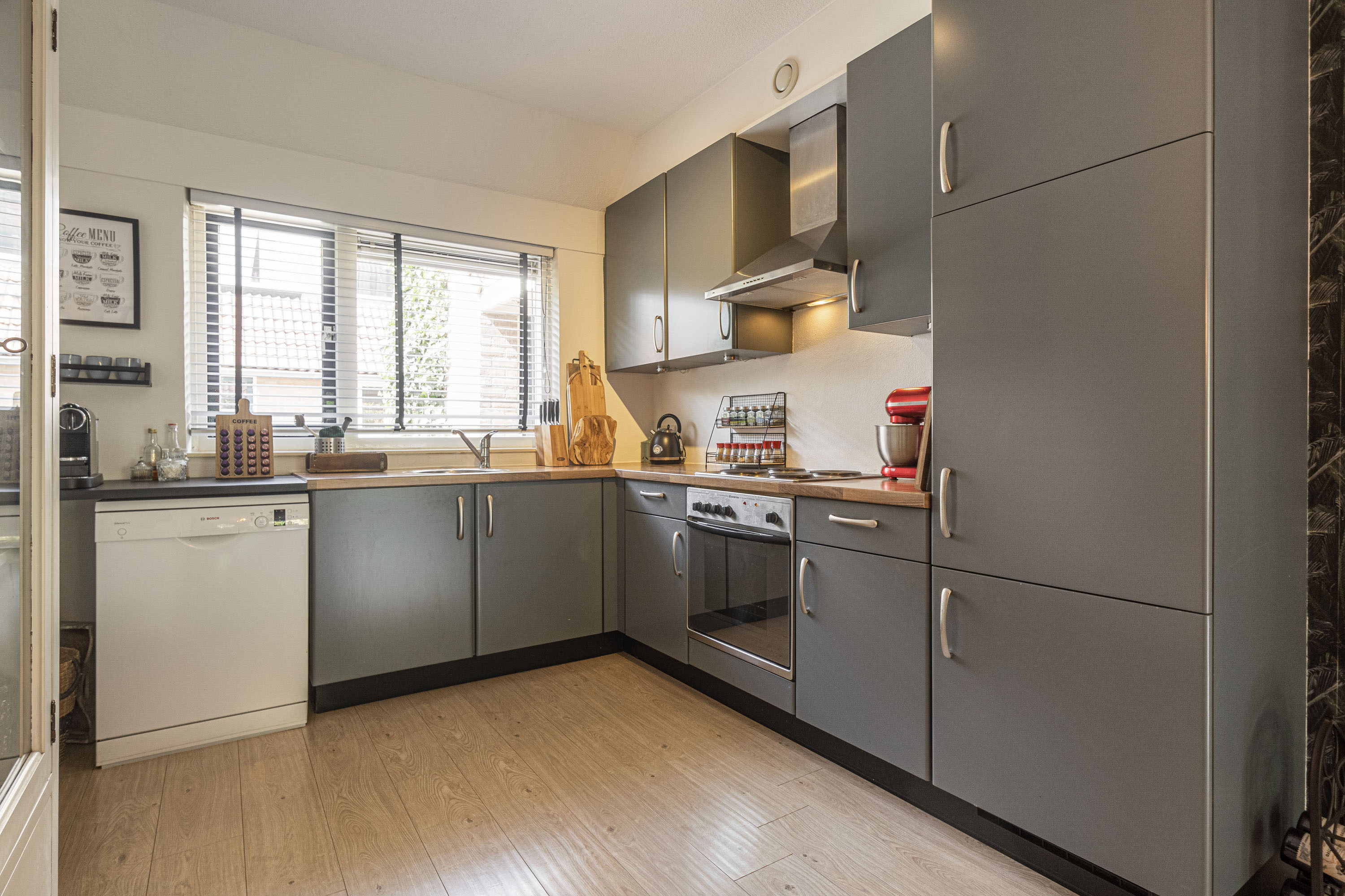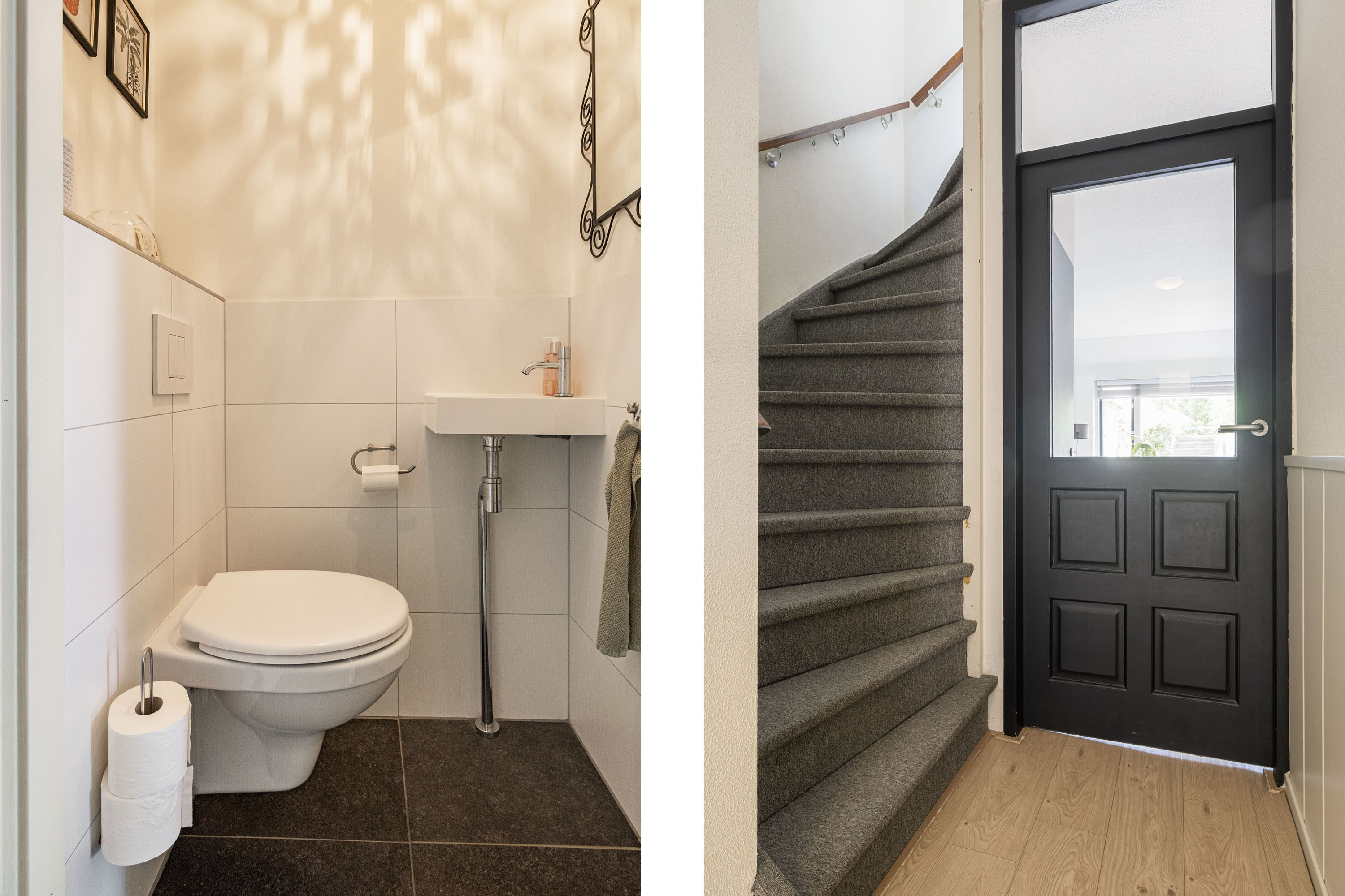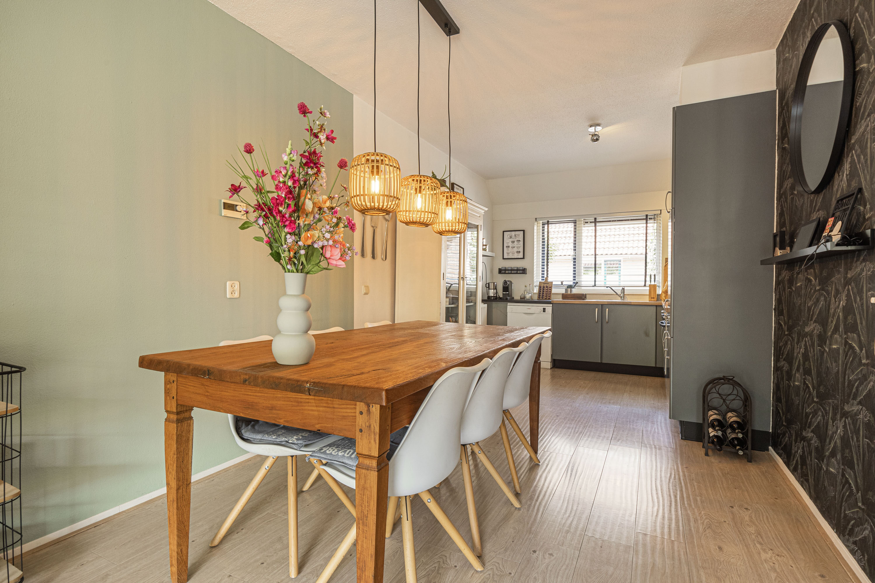 Entree met hal, meterkast, toiletruimte, trapopgang naar de 1e verdieping, toegang tot het leefgedeelte met aan de voorzijde de keuken in L-opstelling, centraal het eetgedeelte en een tuingerichte woonkamer. Vanuit de woonkamer bereik je middels een loopdeur de achtertuin: een fijne, zonnige buitenruimte met volop plek voor lounge, eettafel en speelruimte. De ideale plek voor een zomerse BBQ!