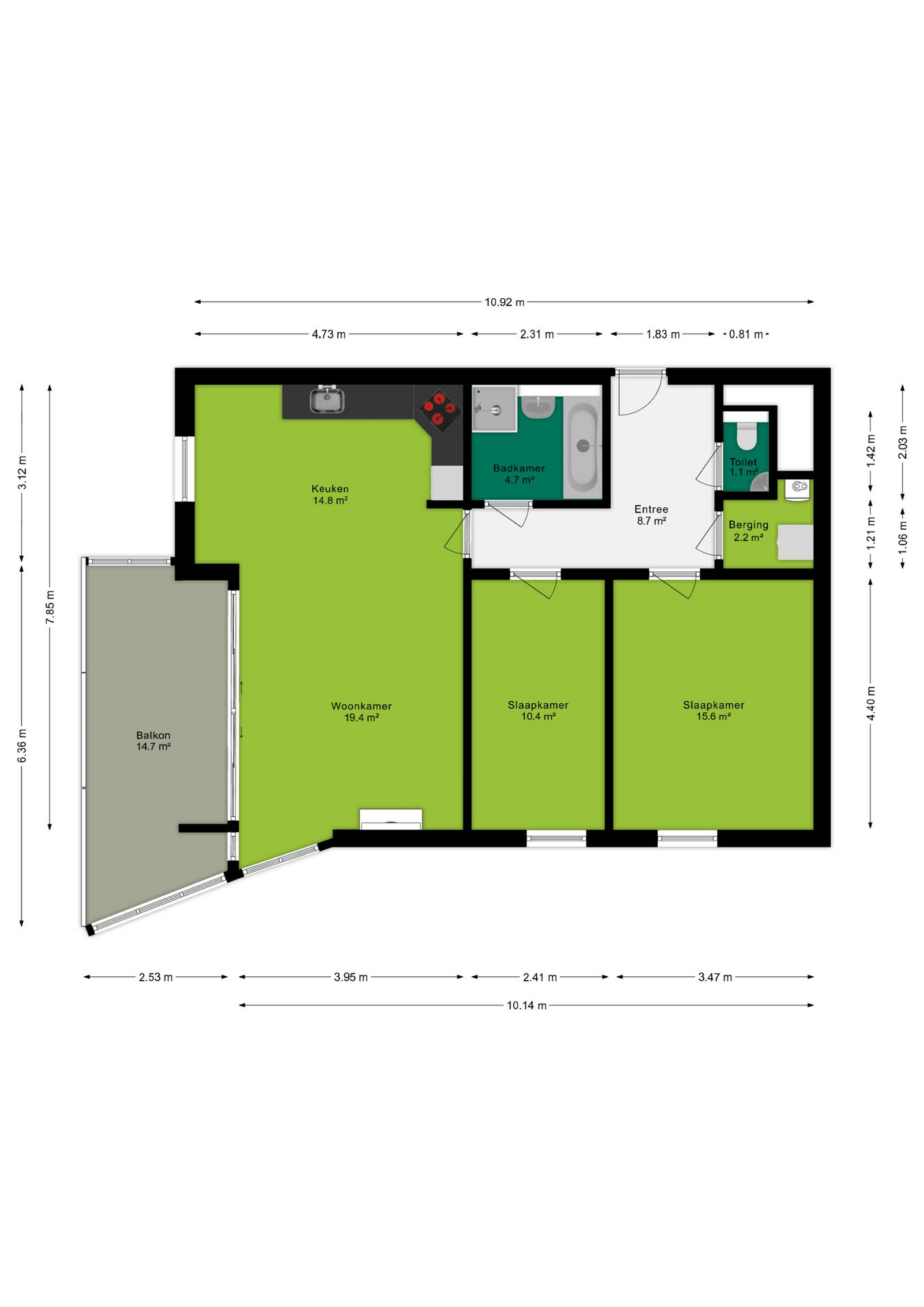 Via de entree, waar het toilet en de naastgelegen berging van 2,2 m² gelegen zijn, bereik je de woonkamer van 19,4 m². Deze kamer geniet van veel licht dankzij de raampartij met schuifpui, die tevens toegang biedt tot het balkon. Er is voldoende ruimte voor een comfortabele hoekbank en een gezellige zithoek bij de open haard, ideaal voor koude winterdagen.