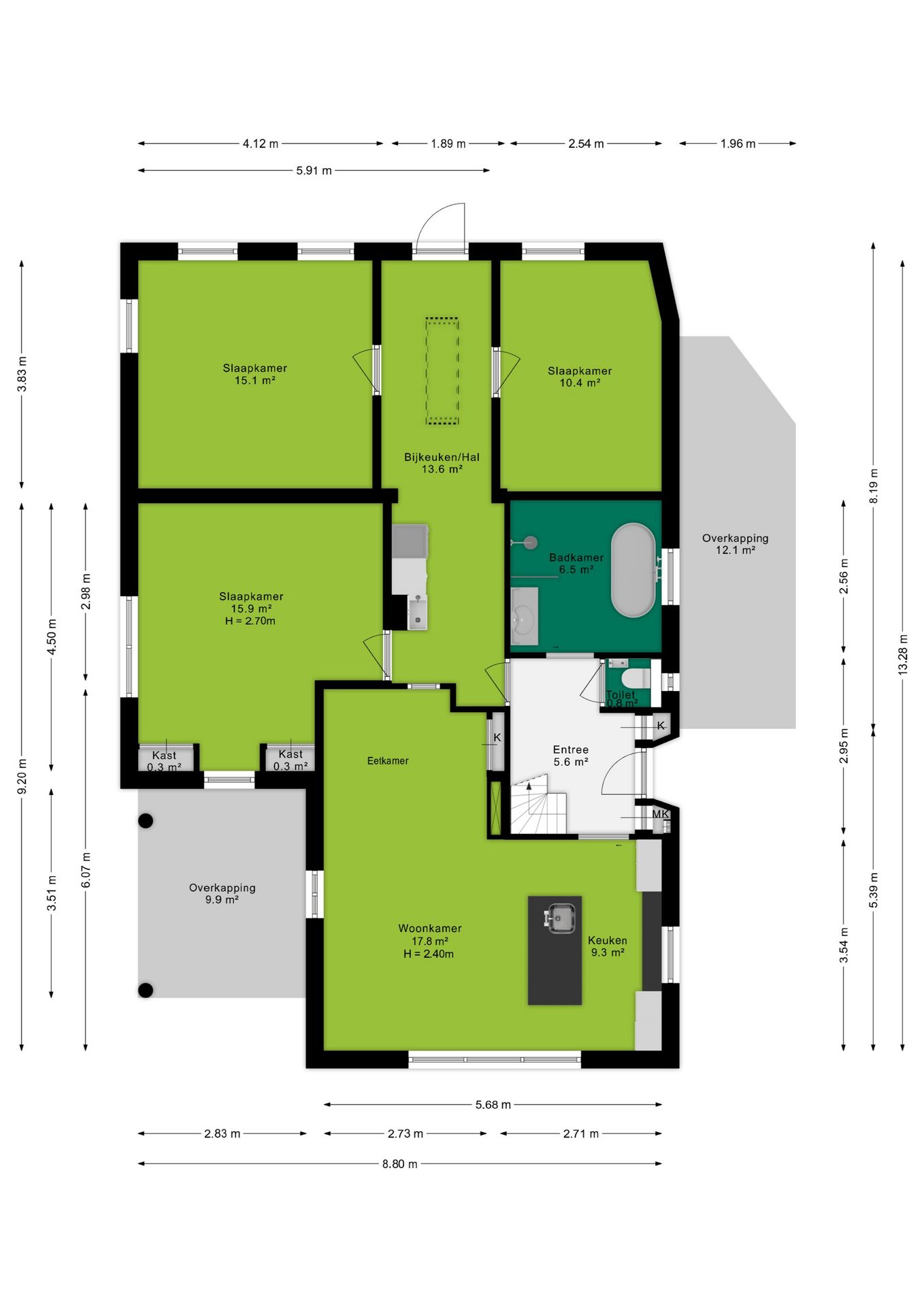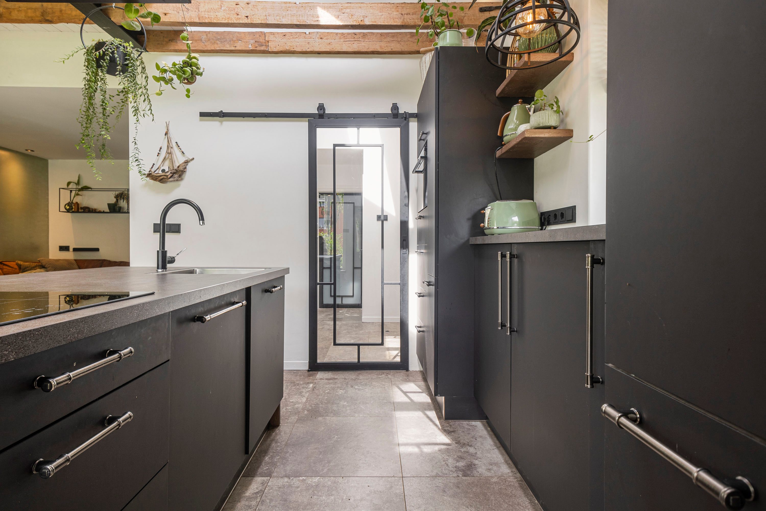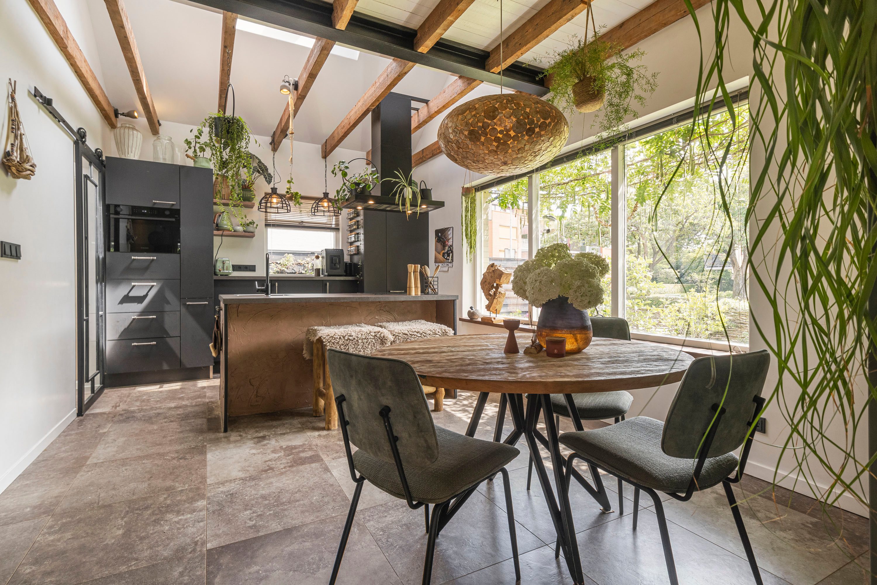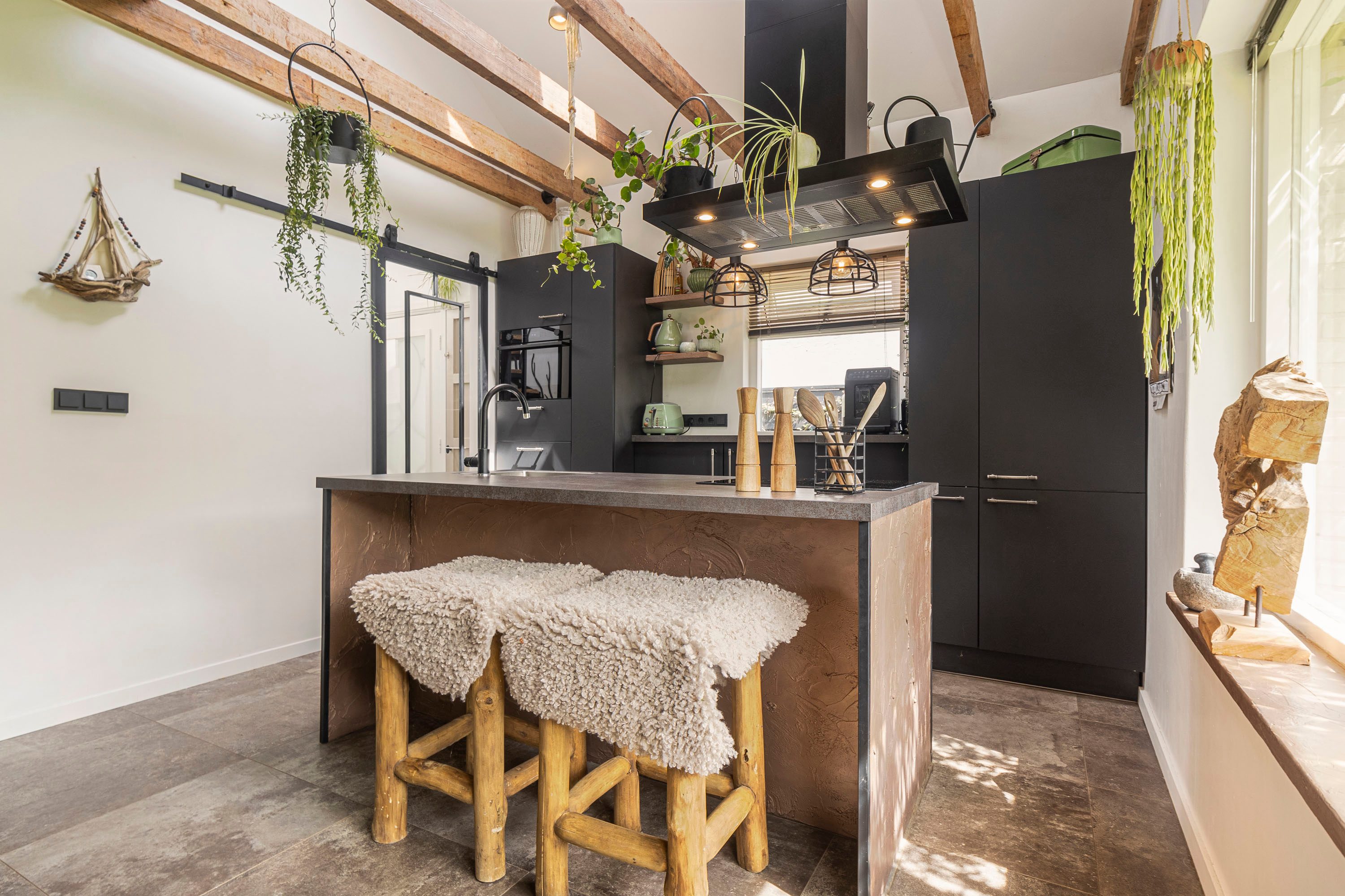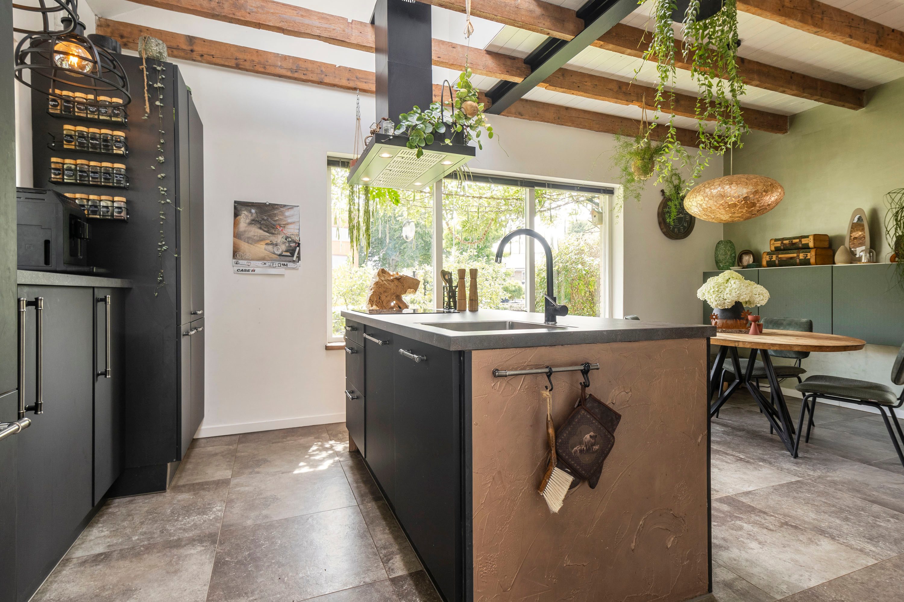 Centraal tussen de woonkamer en keuken bevindt zich het eetgedeelte. Hier is meer dan voldoende ruimte voor een grote eettafel met stoelen. Een fijne plek om met familie en/of vrienden te genieten van een hapje, drankje en spelletje! De moderne keuken met spoel- en kookeiland, uitgevoerd met mat zwarte fronten, is praktisch ingedeeld en voorzien van diverse inbouwapparatuur, ideaal voor de kookliefhebber.