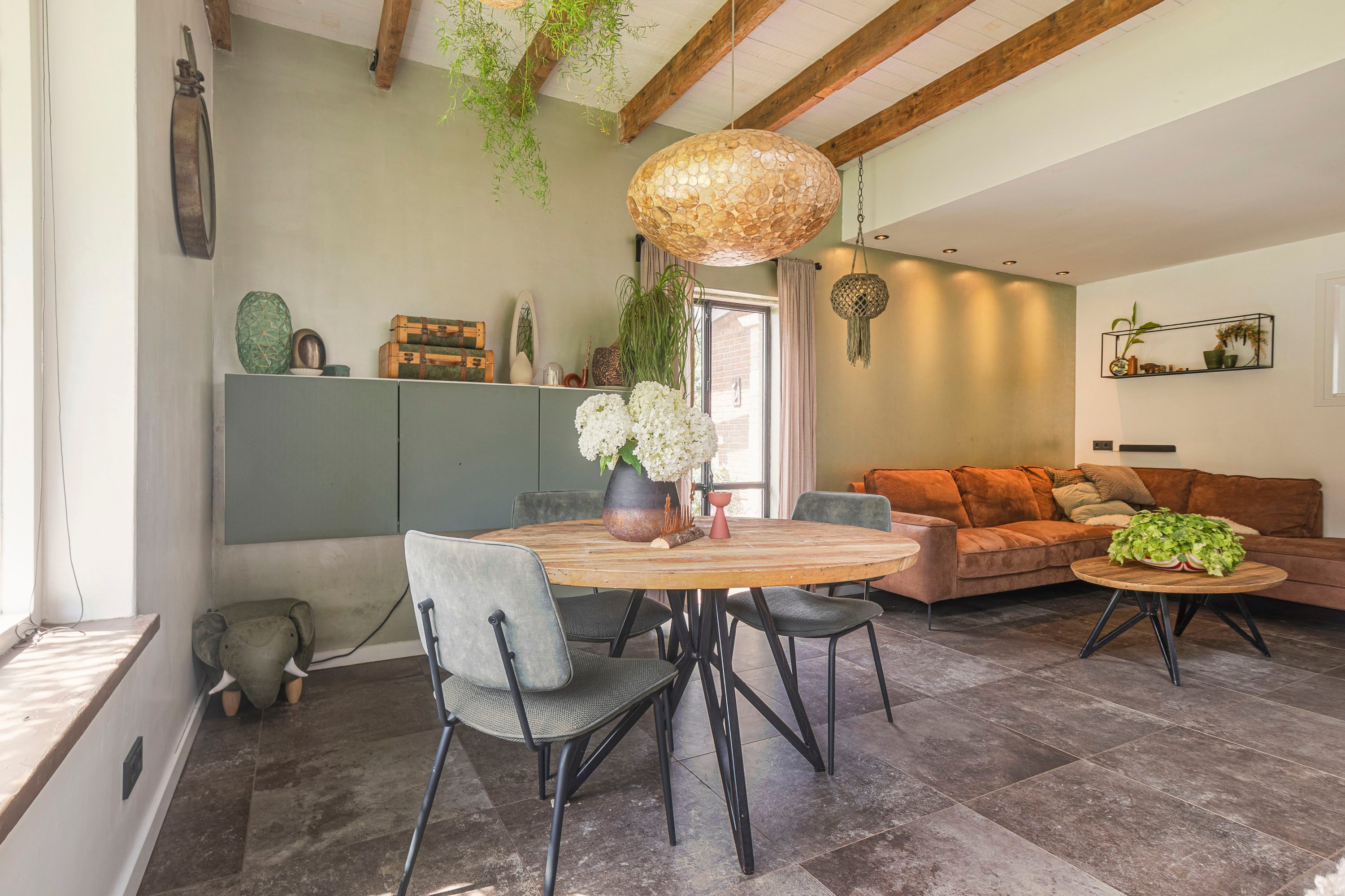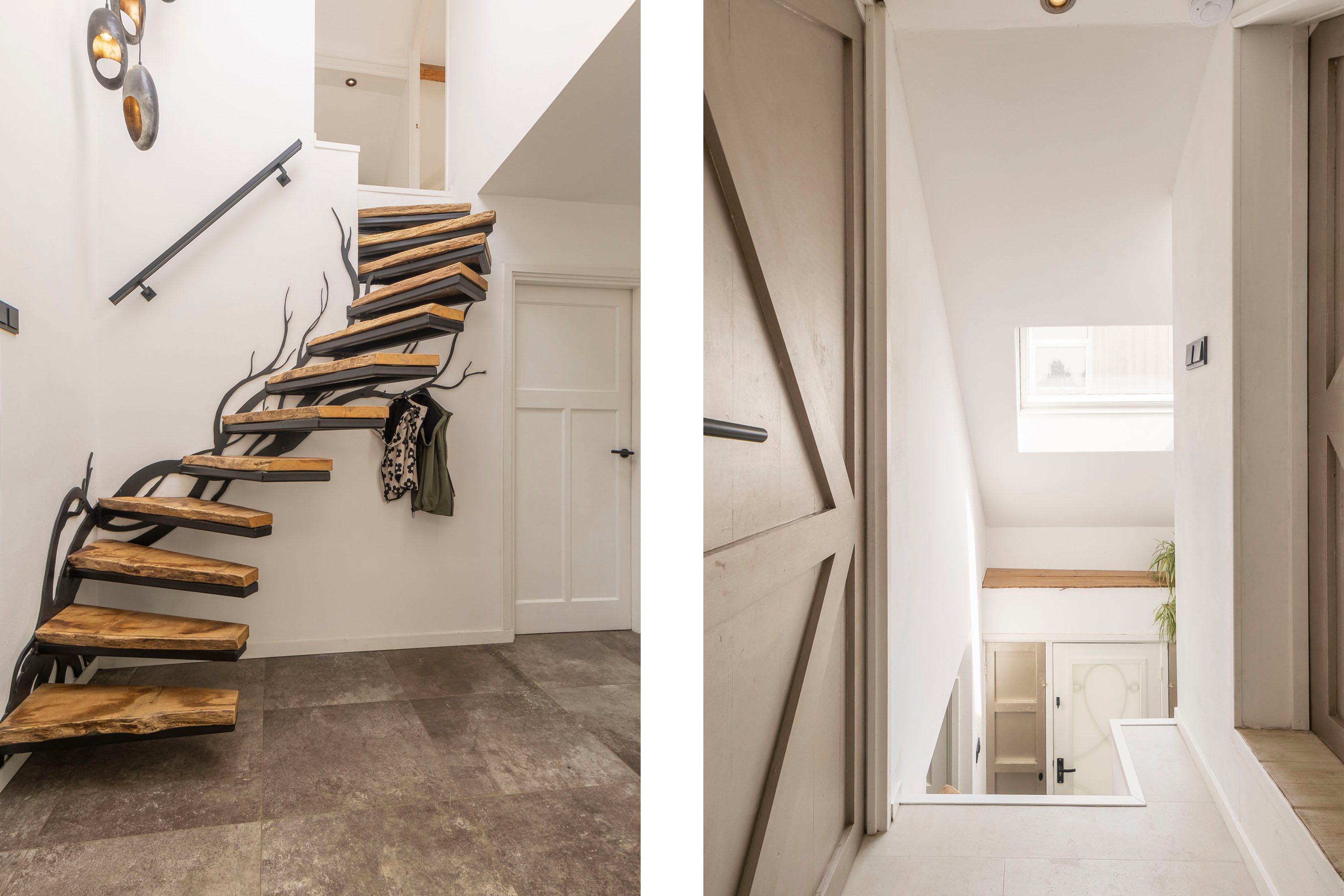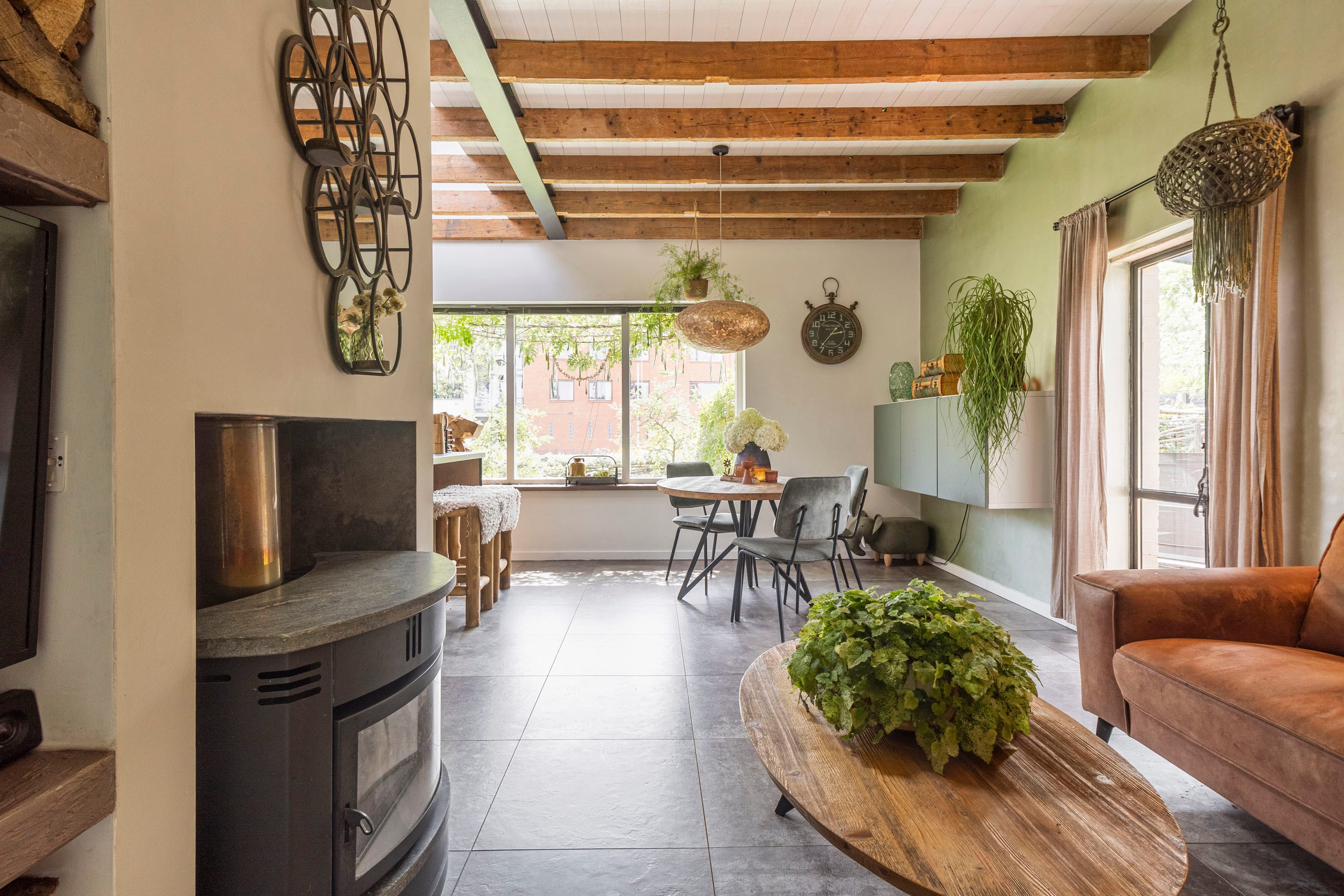 Bij binnenkomst valt meteen de ruime entree en het lichte en uitnodigende karakter van de woning op. Links een stalen schuifdeur die je naar de woon-/eetkamer brengt. De woonkamer is gezellig opgezet en geniet van veel daglicht via de vele raampartijen in de gevels en de dakramen. De openslaande deuren verbinden de binnenruimte naadloos met de tuin, perfect om op zonnige dagen van het buitenleven te genieten.