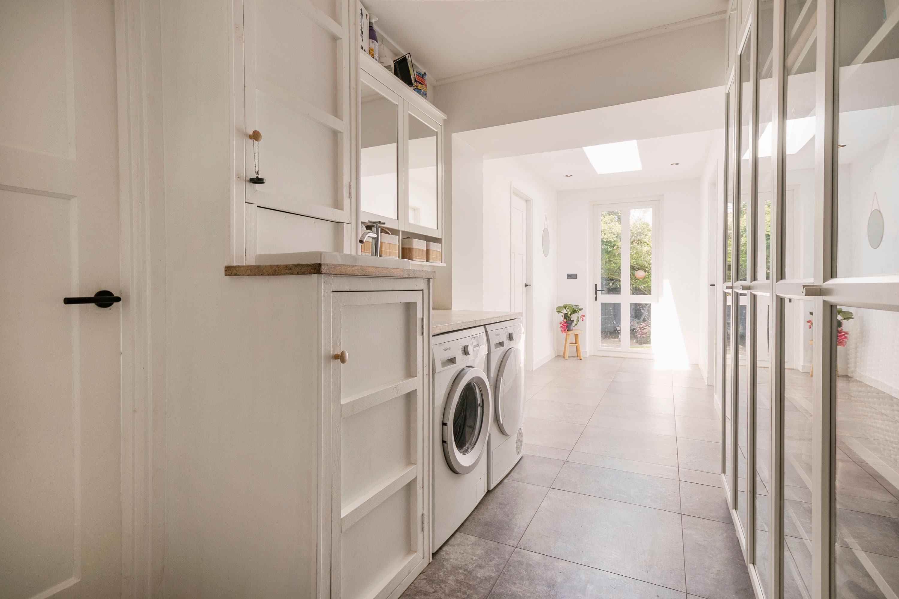 Centraal in de woning bevinden zich de aansluiten voor de wasmachine, droger, cv-installatie en verdeelunit van de vloerverwarming in de uitbouw.