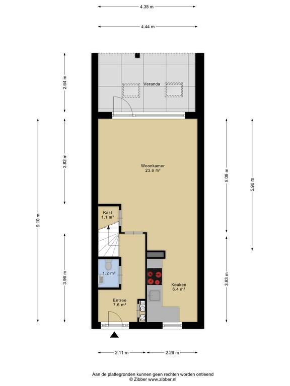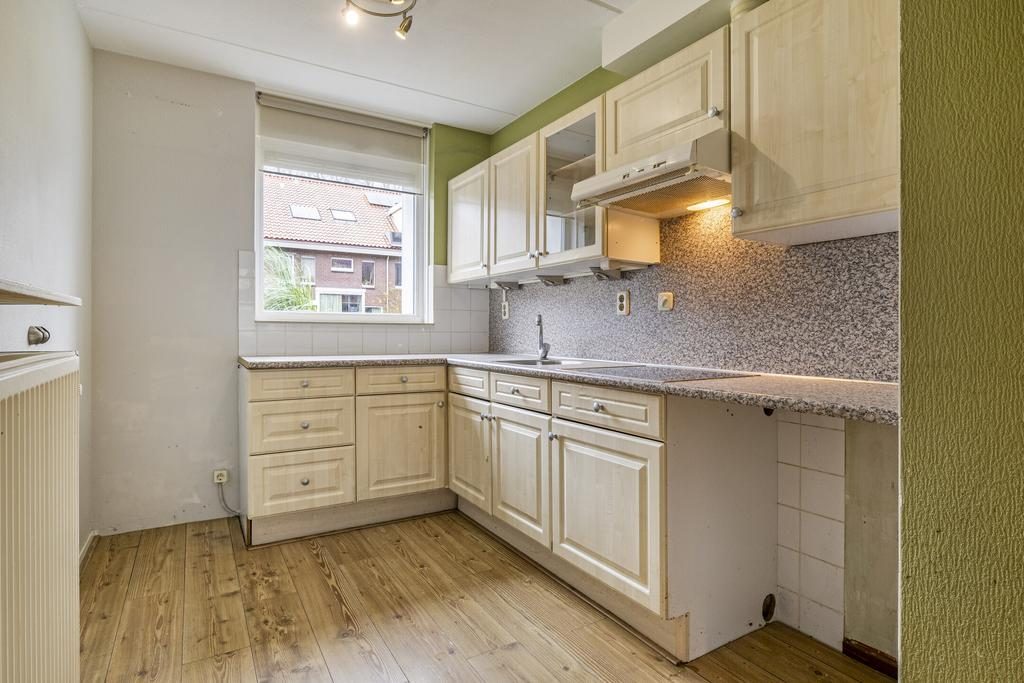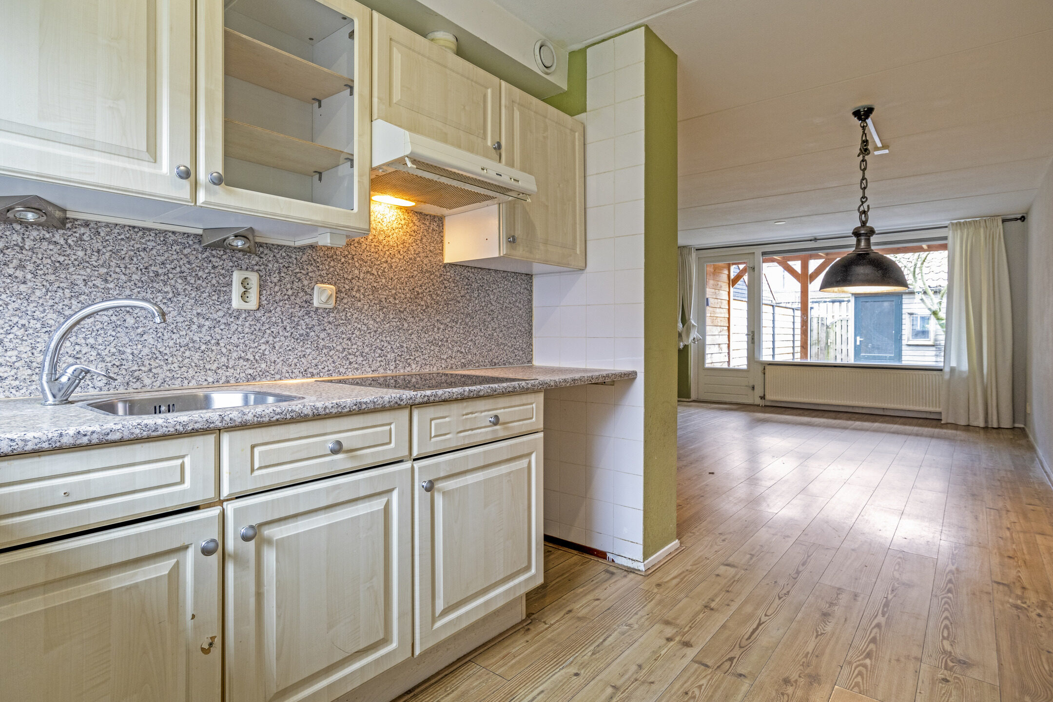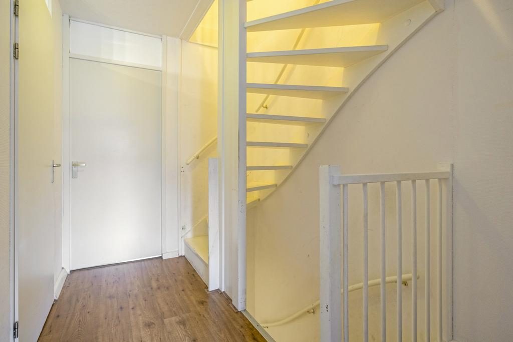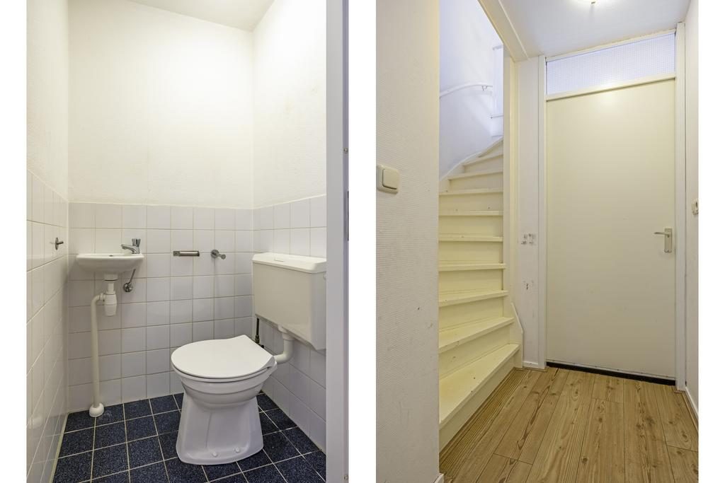Entreehal met een toilet en trapopgang naar de eerste verdieping. Vanuit de hal heb je toegang tot de woonkamer met aan de voorzijde de open keuken. De open keuken is voorzien van L vormig keukenblok met kookplaat en afzuigkap. De woonkamer is gelegen aan de achterzijde van de woning en beschikt over een groot raam. De praktische trapkast biedt bergruimte voor voorraad. Via de woonkamer is er toegang naar de tuin middels de deur aan de achterzijde van de woning. De begane grond is voorzien van een laminaatvloer.