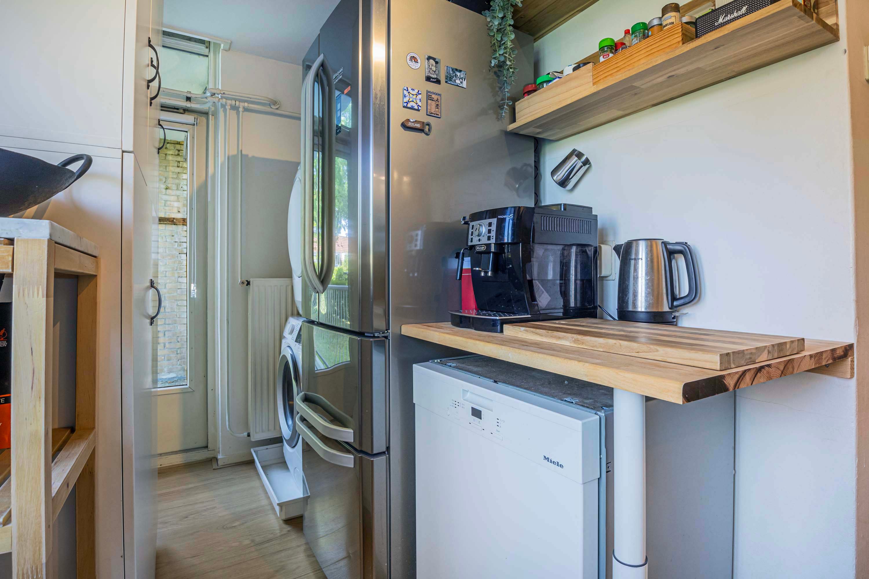 Via de gang bereik je de keuken, waar je een lichte en praktische opstelling vindt met voldoende opbergruimte dankzij de bovenkastjes. Ook is hier een wasmachineaansluiting aanwezig. Extra fijn: vanuit de keuken stap je zo het balkon op om even van de frisse buitenlucht te genieten!