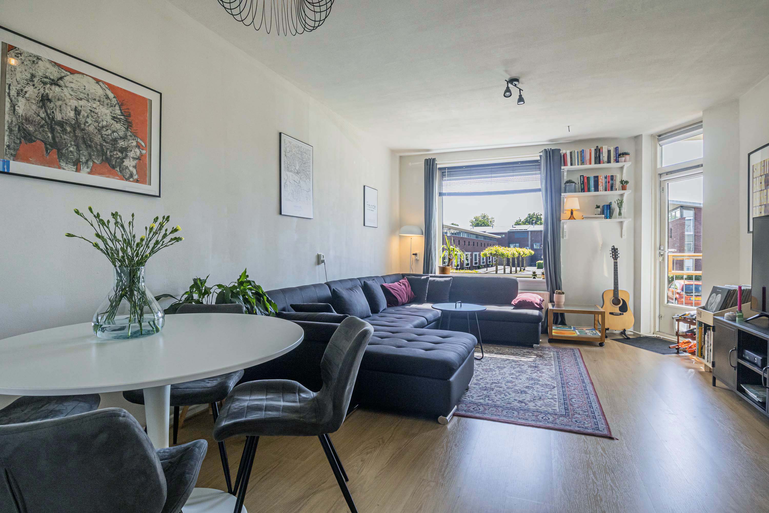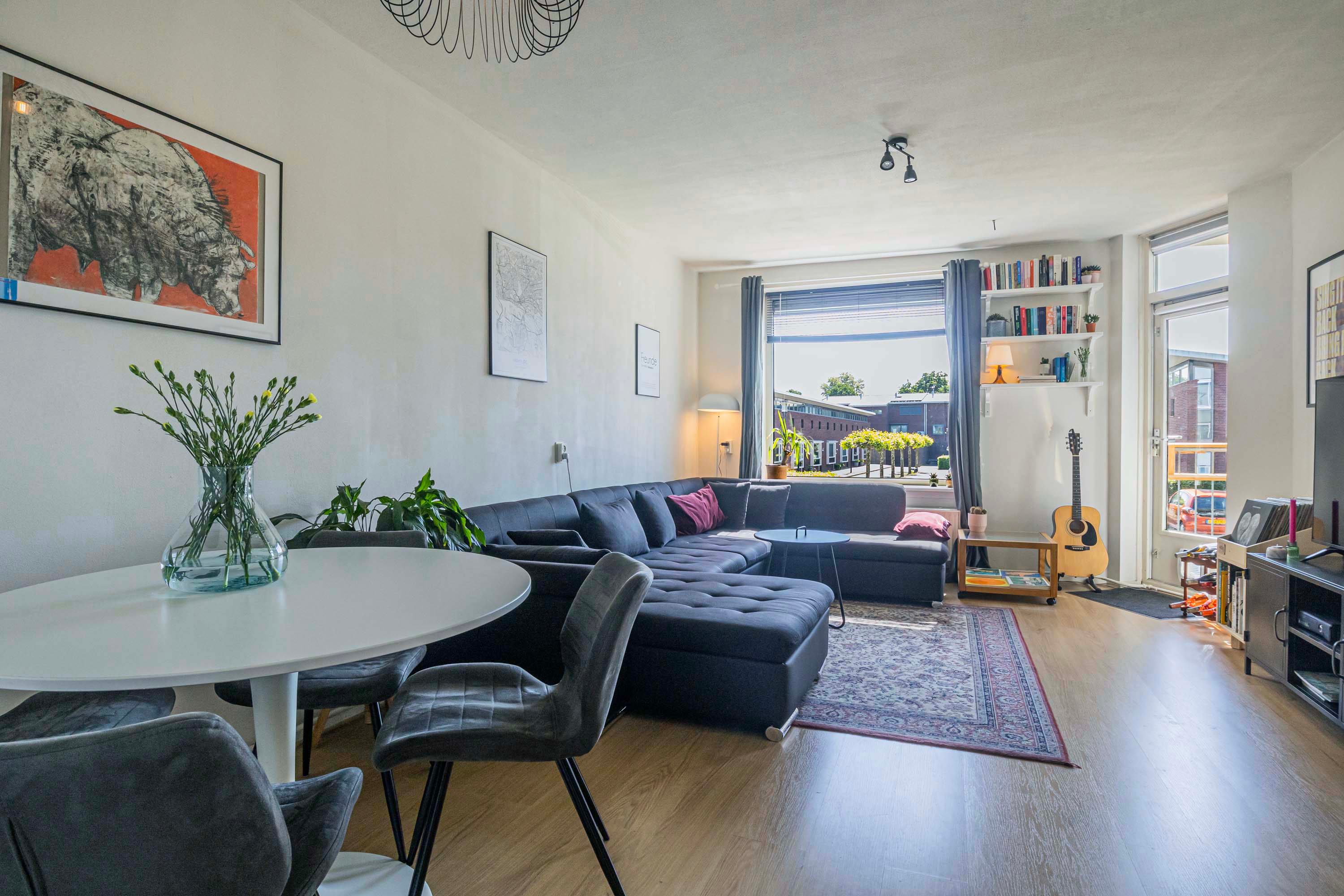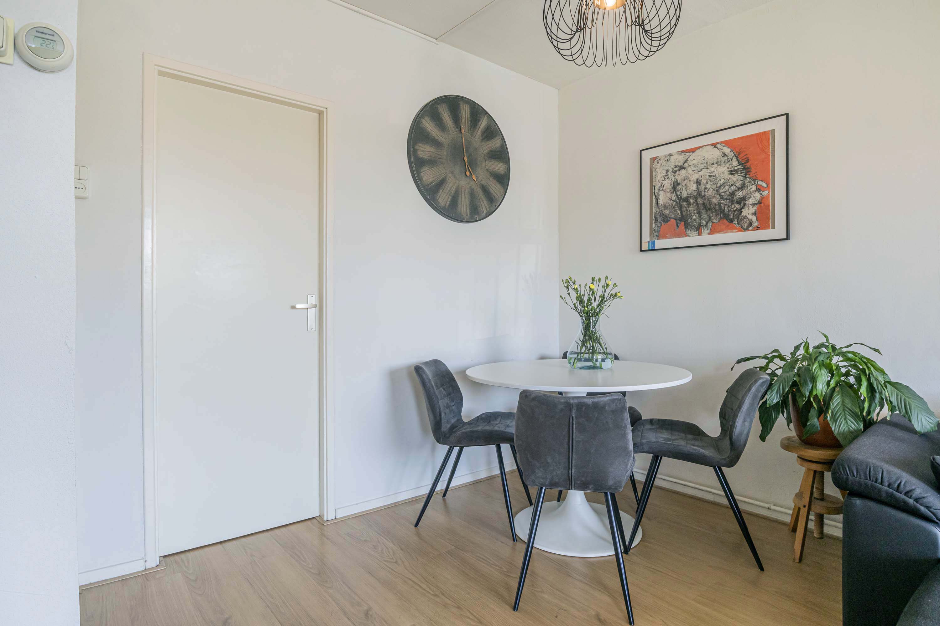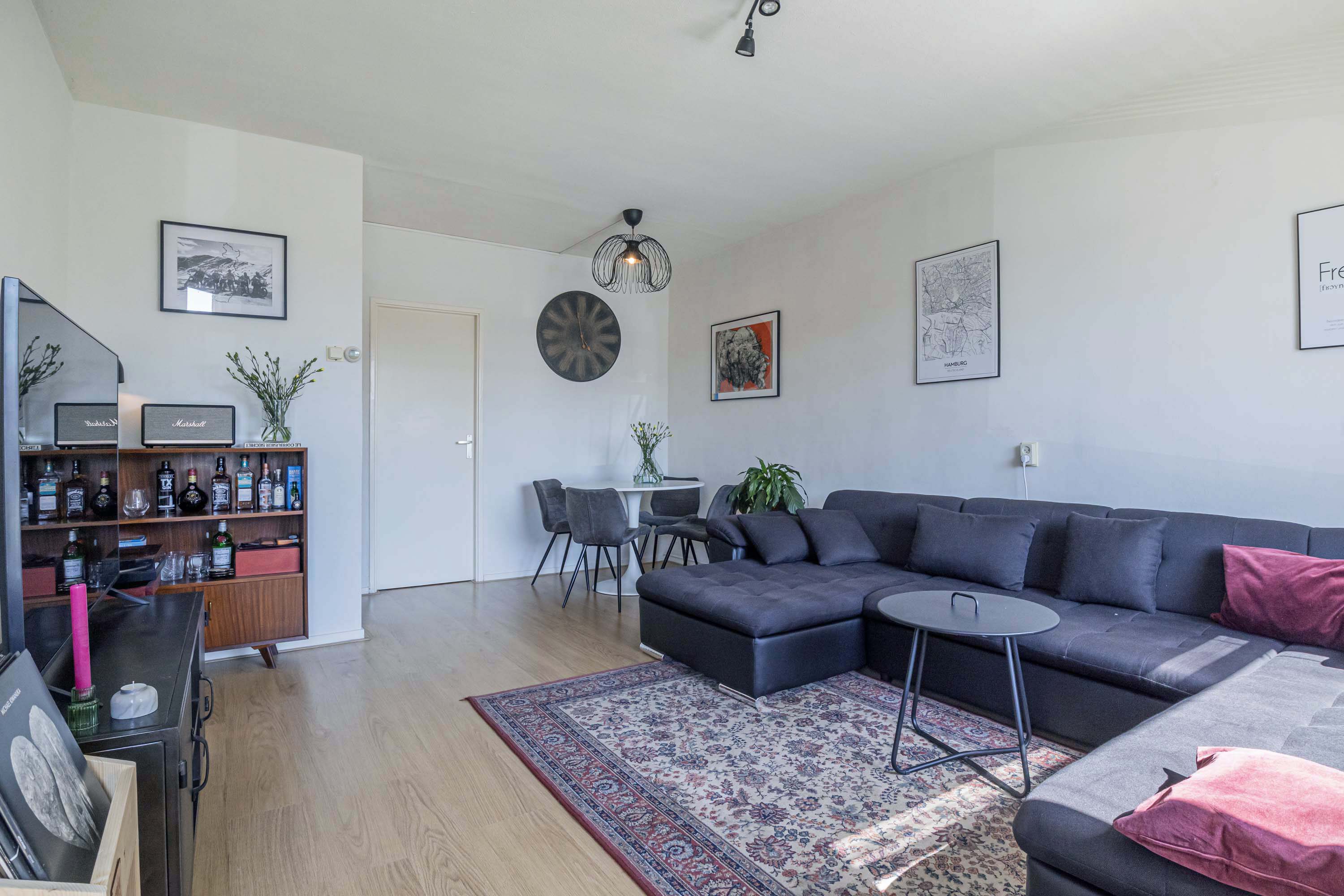 Wanneer je de leefruimte binnenstapt, valt direct het prachtige natuurlijke licht op. De ruimte is ingericht met een eettafel en een comfortabele bank. Vanuit deze fijne leefruimte zo het balkon op om heerlijk van het buitenleven te genieten.
