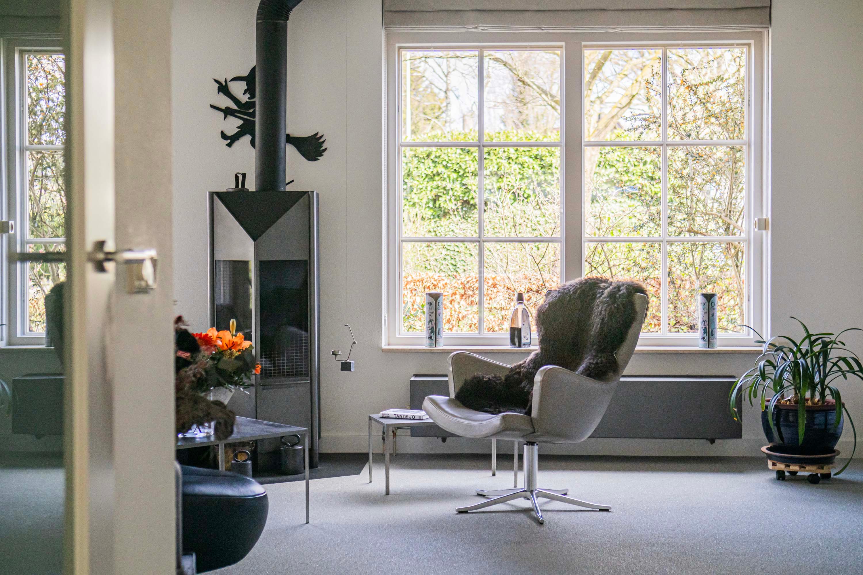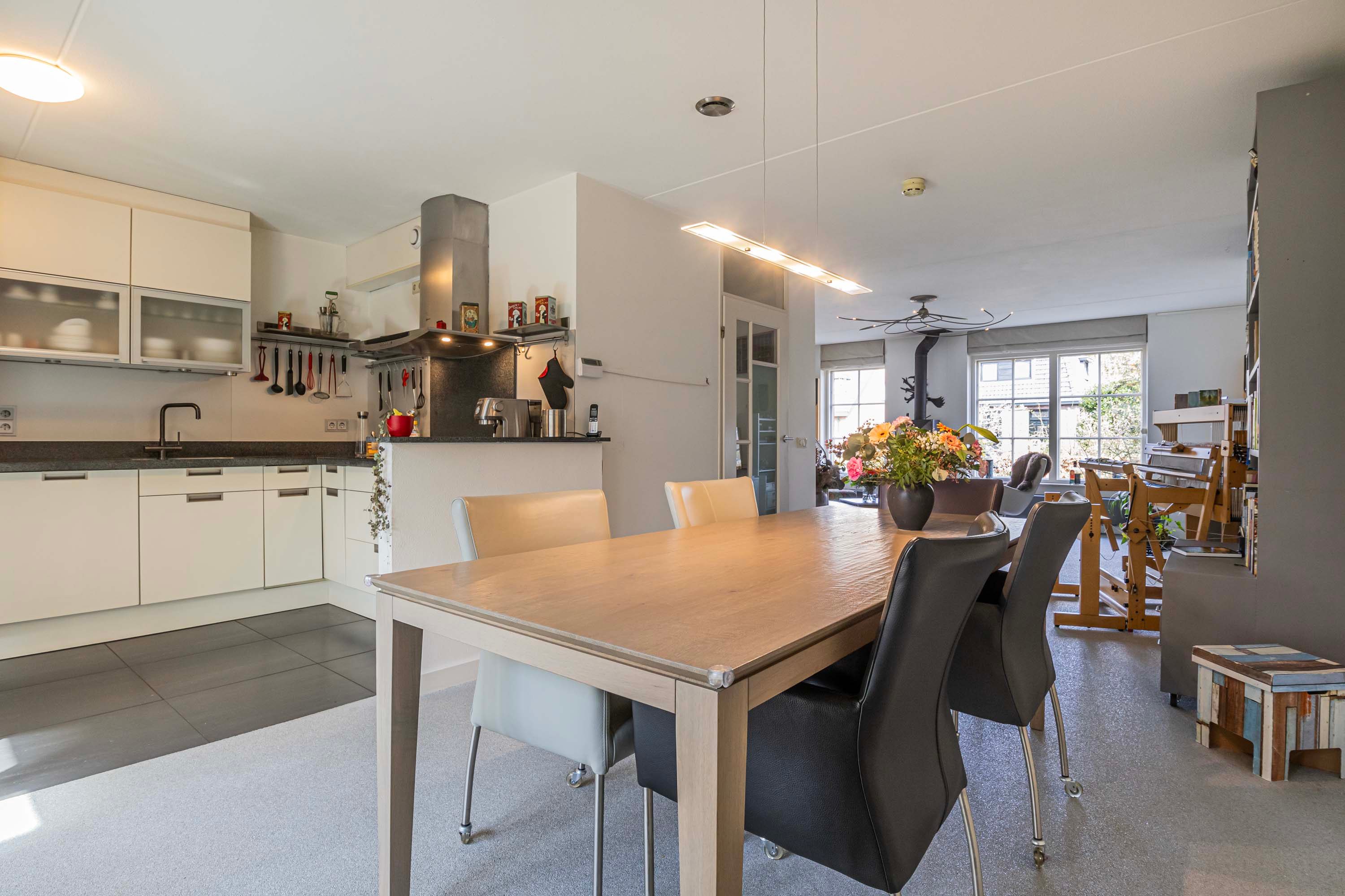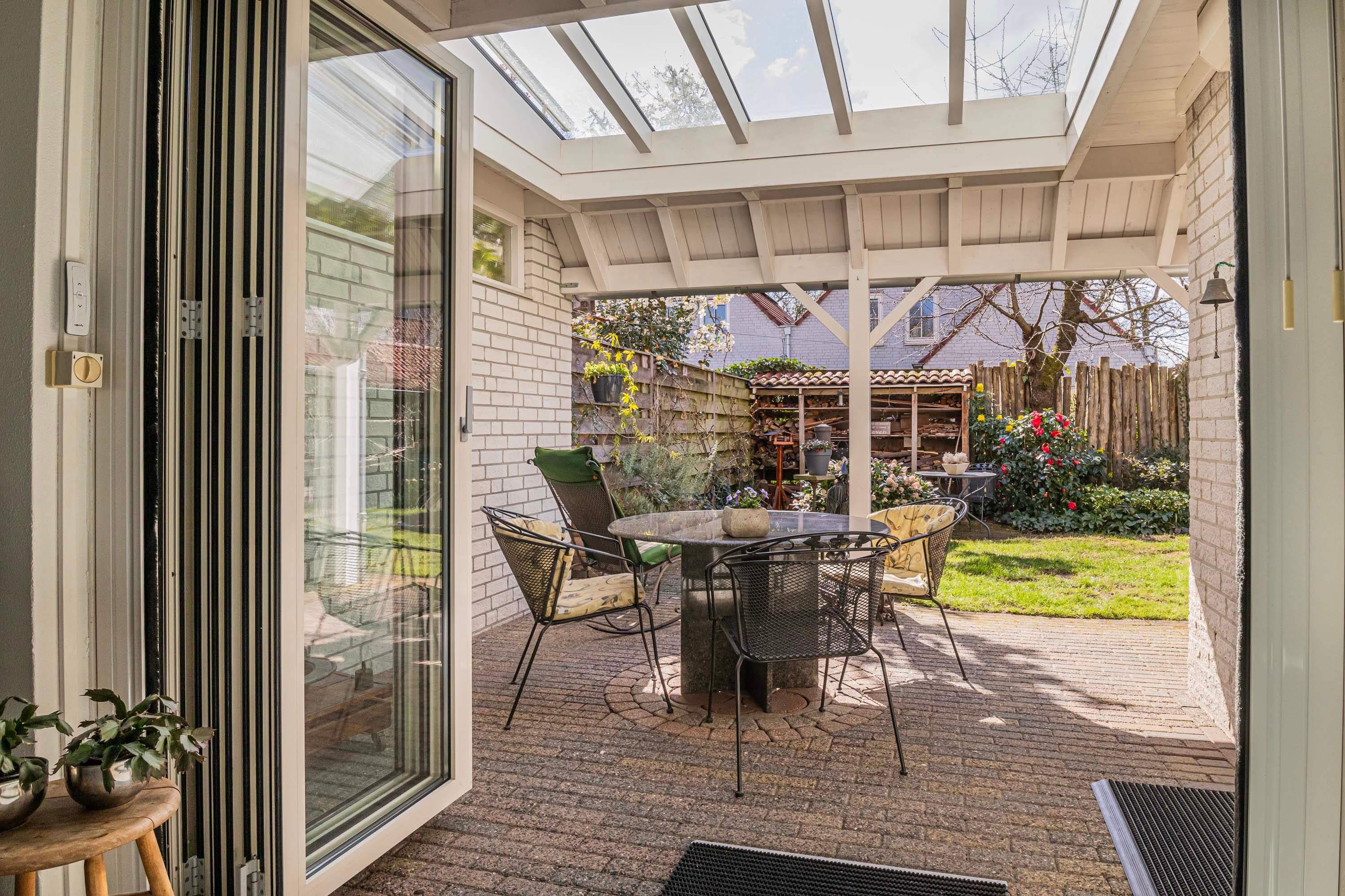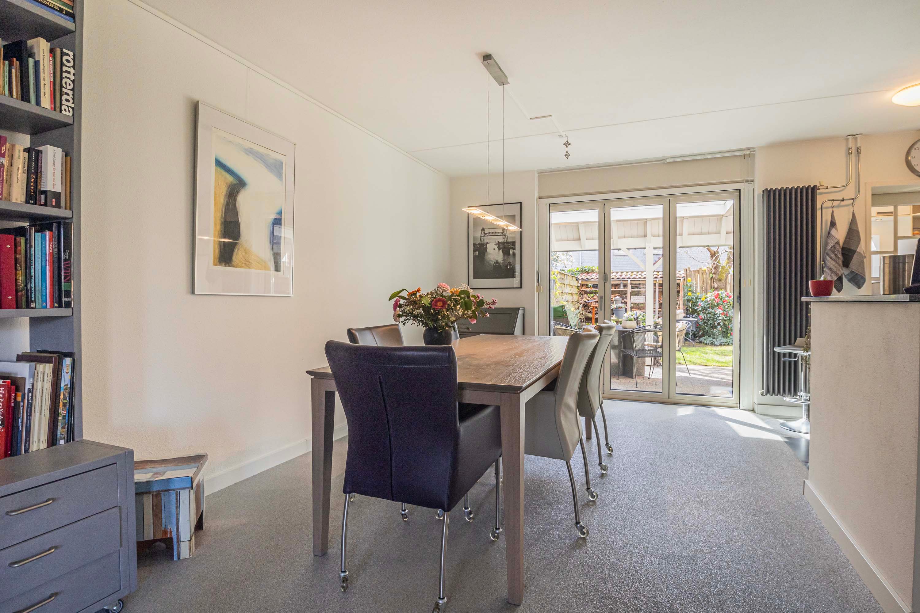 De openslaande deuren in de eetkamer zorgen voor een prachtige overgang, waarbij binnen en buiten moeiteloos in elkaar overvloeien.