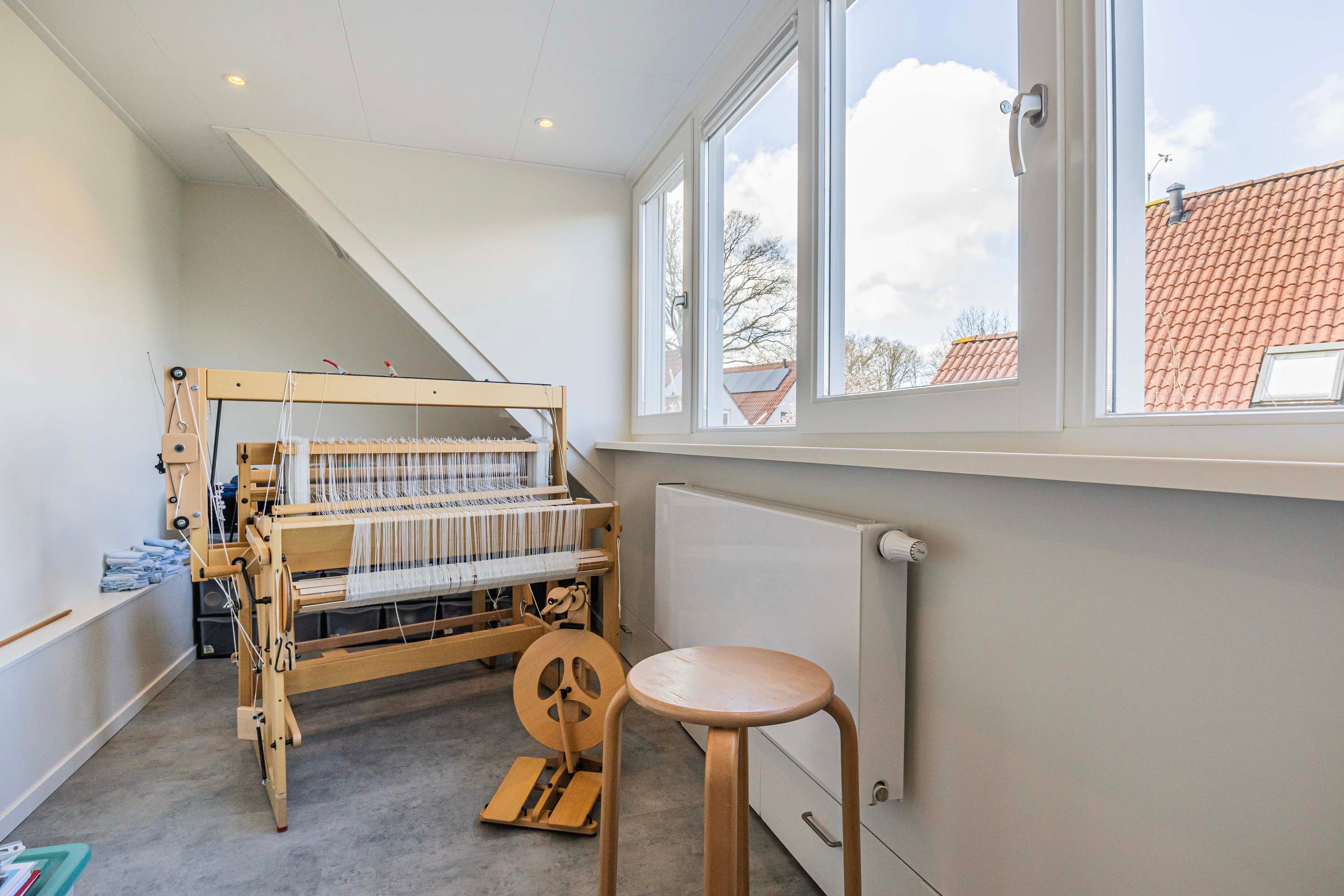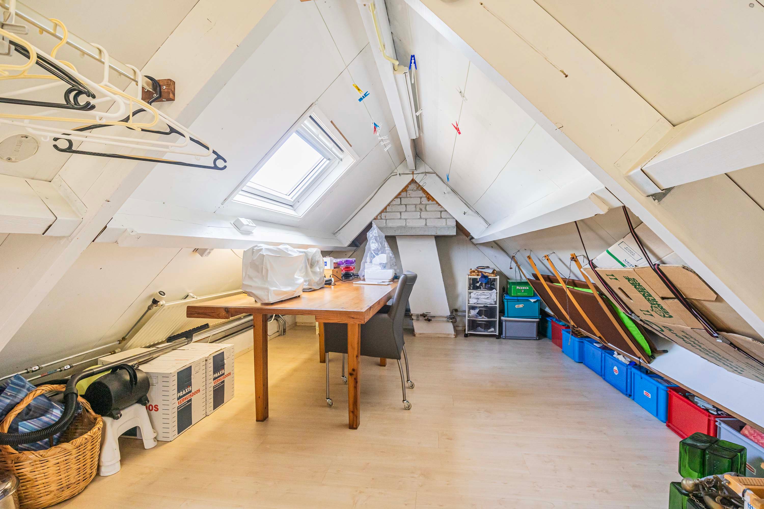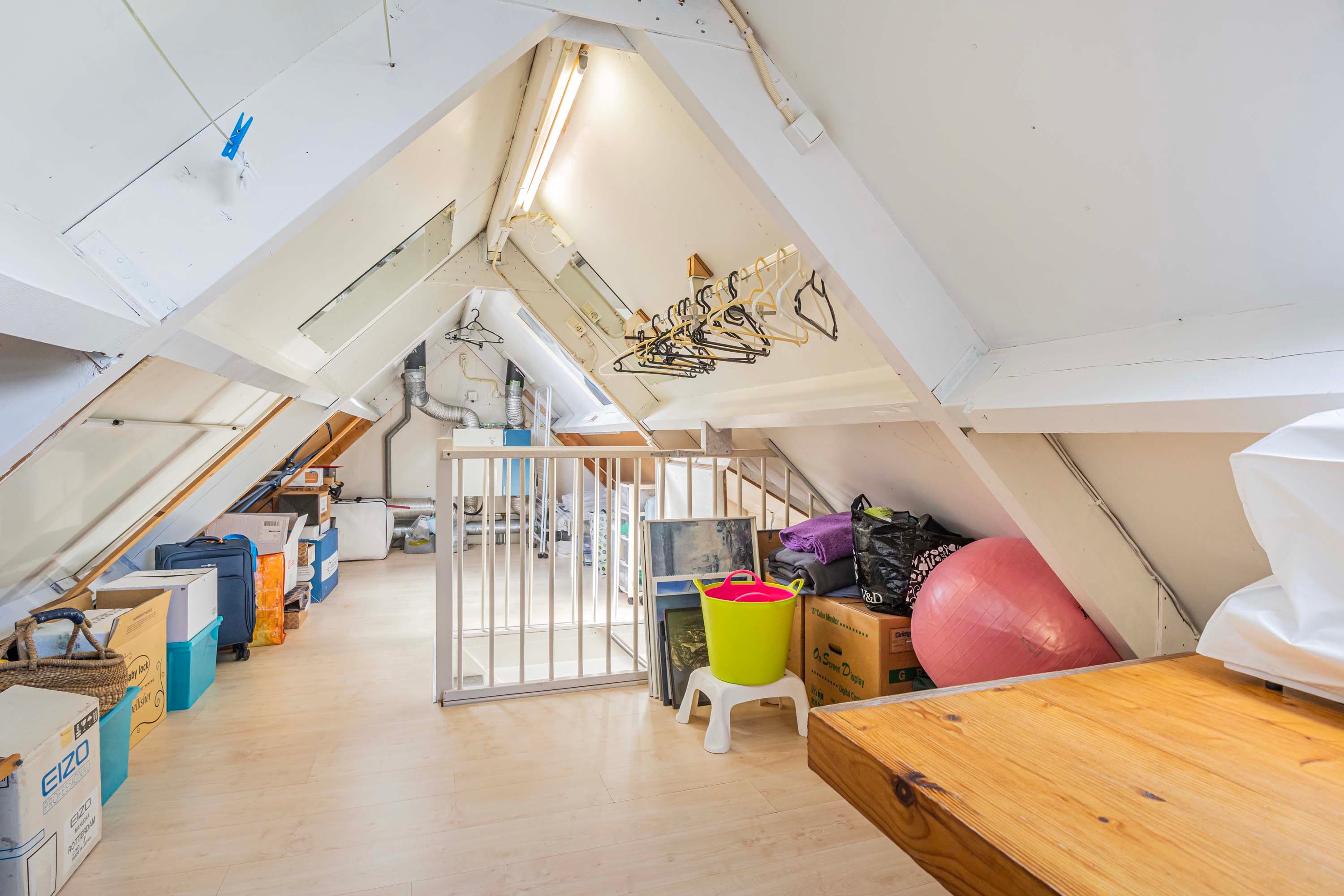 Via een vaste trap bereik je de tweede verdieping, waar één grote open ruimte volop mogelijkheden biedt. Of je het nu inricht als opslagruimte voor al je spullen of als een creatieve atelier, je kunt deze ruimte op diverse manier benutten.