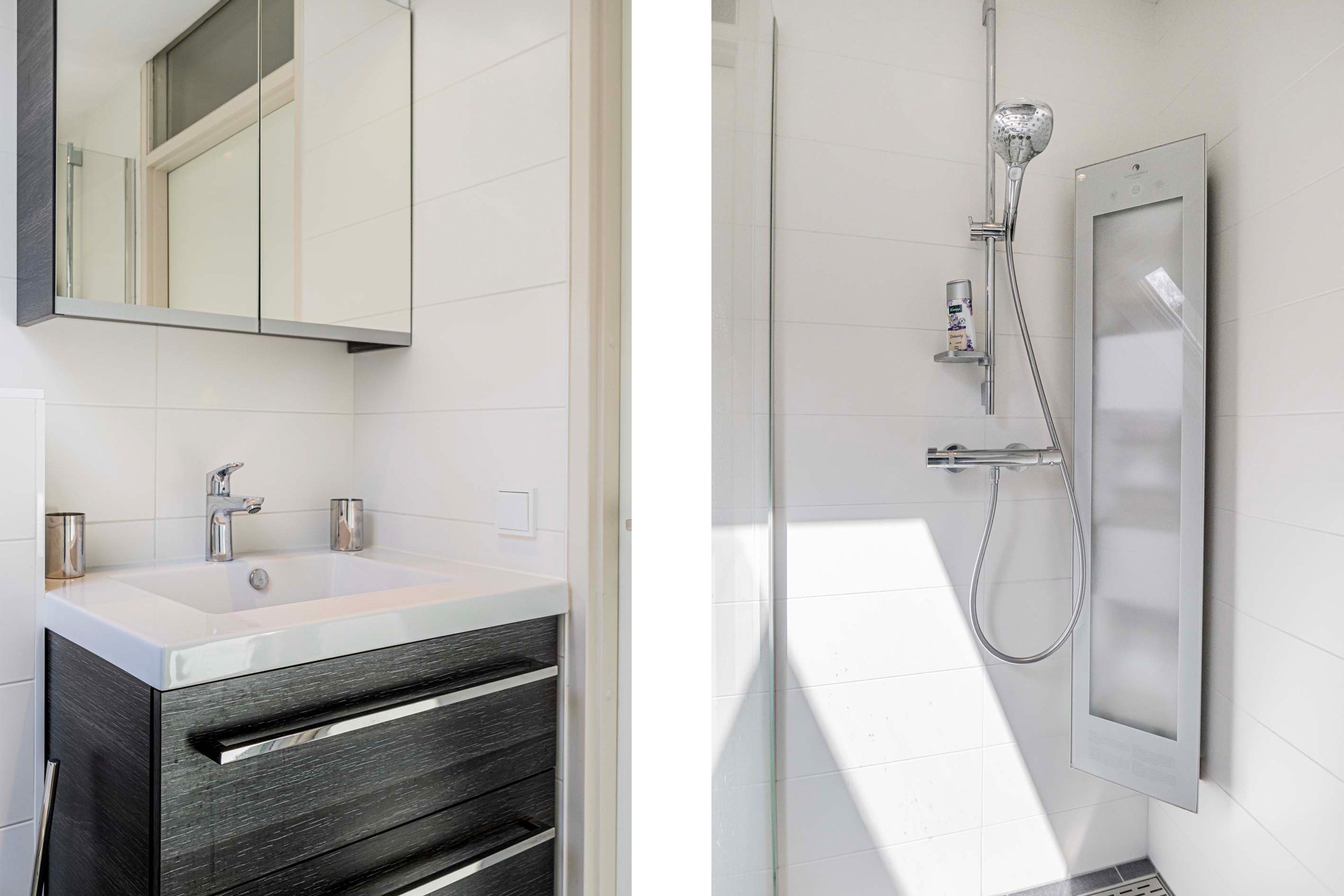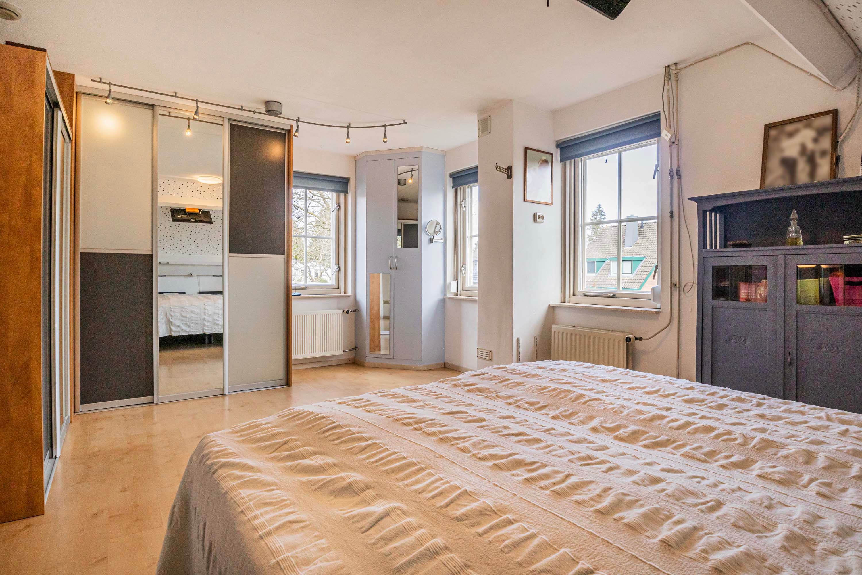 Eenmaal op de eerste verdieping vind je drie ruime slaapkamers. De slaapkamer aan de voorzijde van de woning is 18m² groot en is voorzien van een vaste kast, ideaal voor al jouw spullen. De tweede slaapkamer, met een oppervlakte van 11m², biedt directe toegang tot het balkon en laat zo het daglicht binnenstromen. De derde slaapkamer, gelegen aan de achterzijde, heeft een eigen wastafel voor extra gemak. De stijlvolle badkamer laat niets te wensen over: hier vind je een ontspannend ligbad, een praktische inloopdouche met sunshower, een modern wastafelmeubel en een wc.