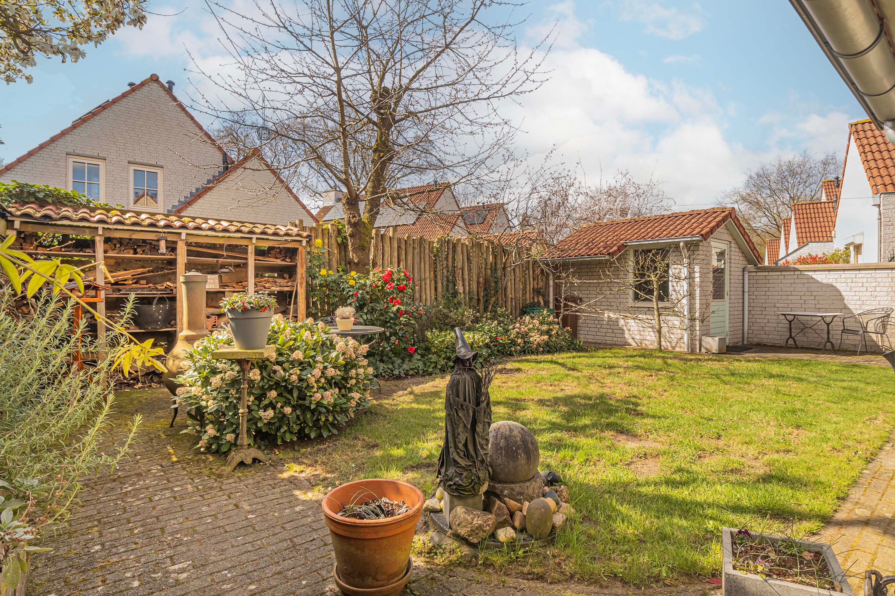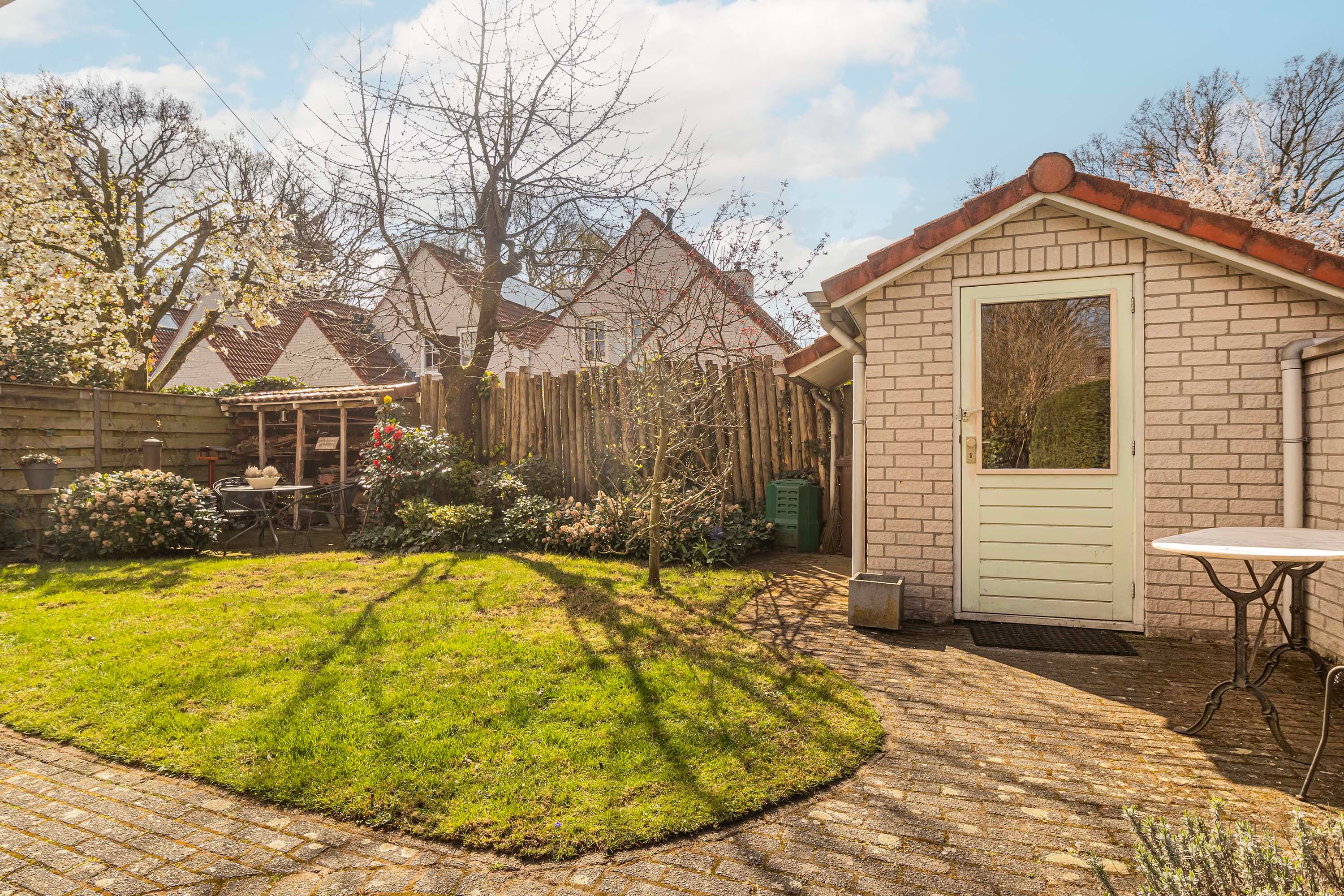 Verderop in de tuin staat een stenen berging van 6 m², ideaal voor je opslagbehoeften of als extra plek voor tuingereedschap.