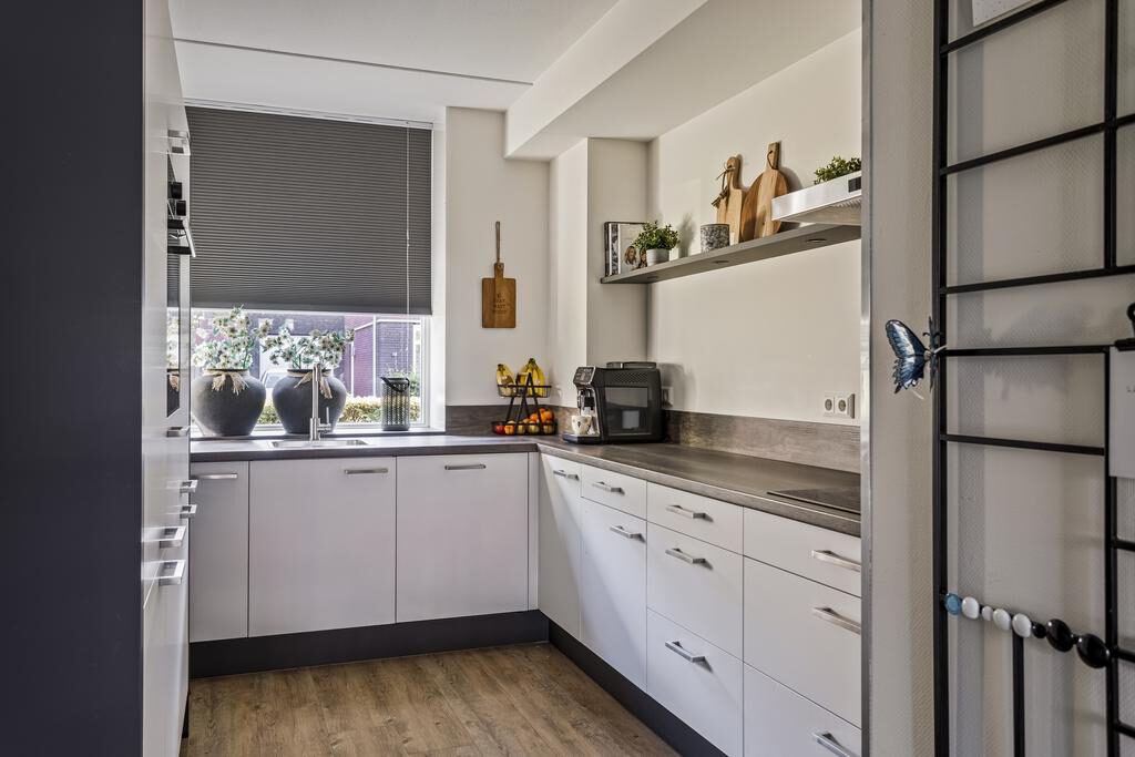 Bij binnenkomst in de woonkamer valt gelijk de fijne hoeveelheid lichtinval op. Door de grote raampartij in de achtergevel valt er veel licht binnen, hierdoor is het op elk moment van de dag lekker licht op de gehele beneden verdieping. Aangrenzend aan de woonkamer is de strak afgewerkte open keuken. De keuken geniet veel zonlichtinval door het grote raam aan de voorzijde van de woning, daarnaast heeft de keuken een frisse uitstraling en is voorzien van de volgende inbouwapparatuur:
