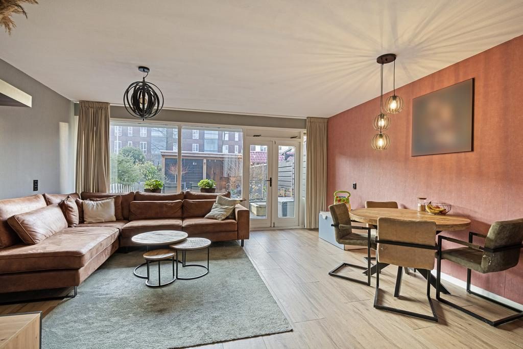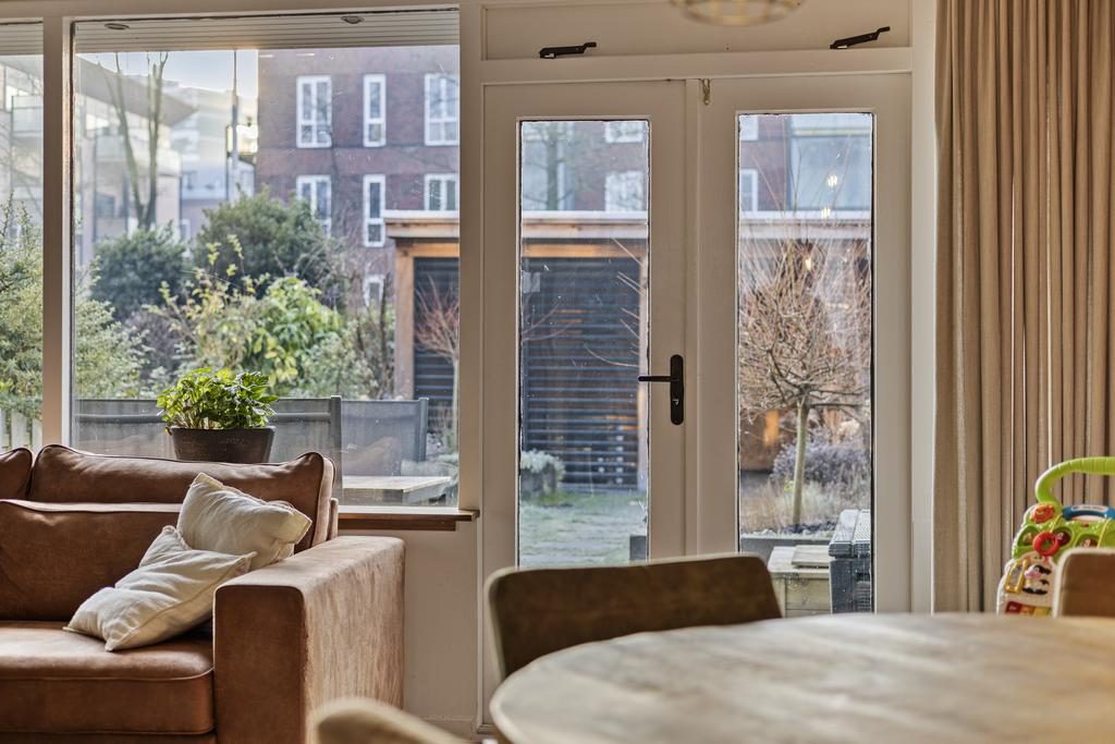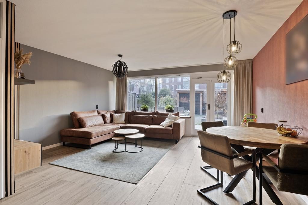 De woonkamer is een fijne, tuingerichte ruimte met grote ramen (zuid) en openslaande deuren naar de zonnige achtertuin. De vloer op de begane grond is afgewerkt met een hoogwaardige keramisch parketvloer – een luxe plavuizen vloer met een stijlvolle uitstraling – en voorzien van comfortabele vloerverwarming.