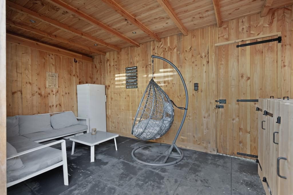 Achterin de tuin staat een robuuste Douglashouten veranda, een heerlijke plek om te ontspannen in de zomer.