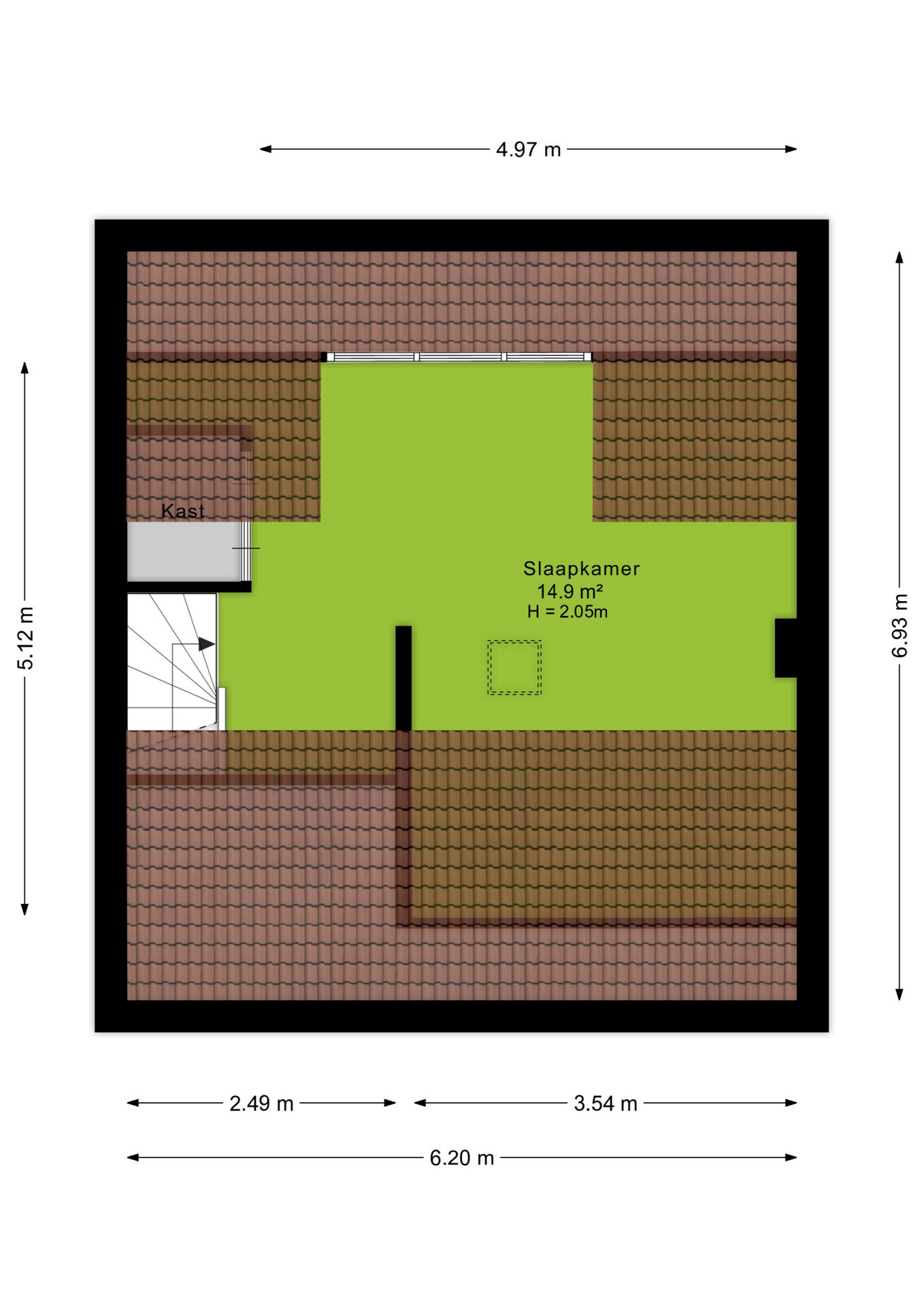 Op de tweede verdieping bevindt zich een royale ruimte van ca. 15 m², voorzien van zowel een dakraam als een dakkapel. Deze lichte en veelzijdige ruimte is ideaal als extra slaapkamer of werkruimte. Daarnaast is er de mogelijkheid om de ruimte op te splitsen en zo meerdere kamers te creëren. Extra praktisch is de ingebouwde kastruimte naast de trap, die zorgt voor handige opbergruimte.