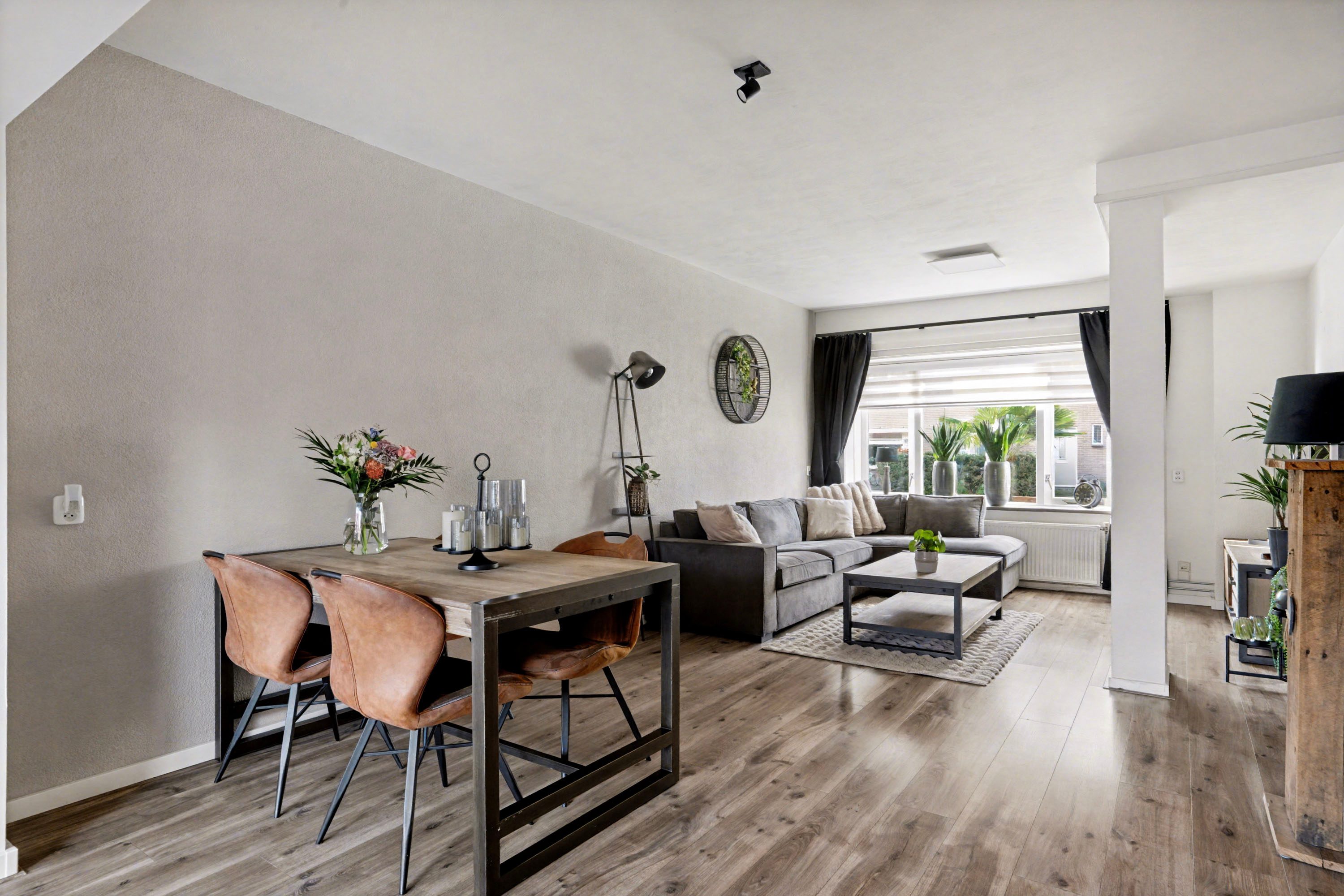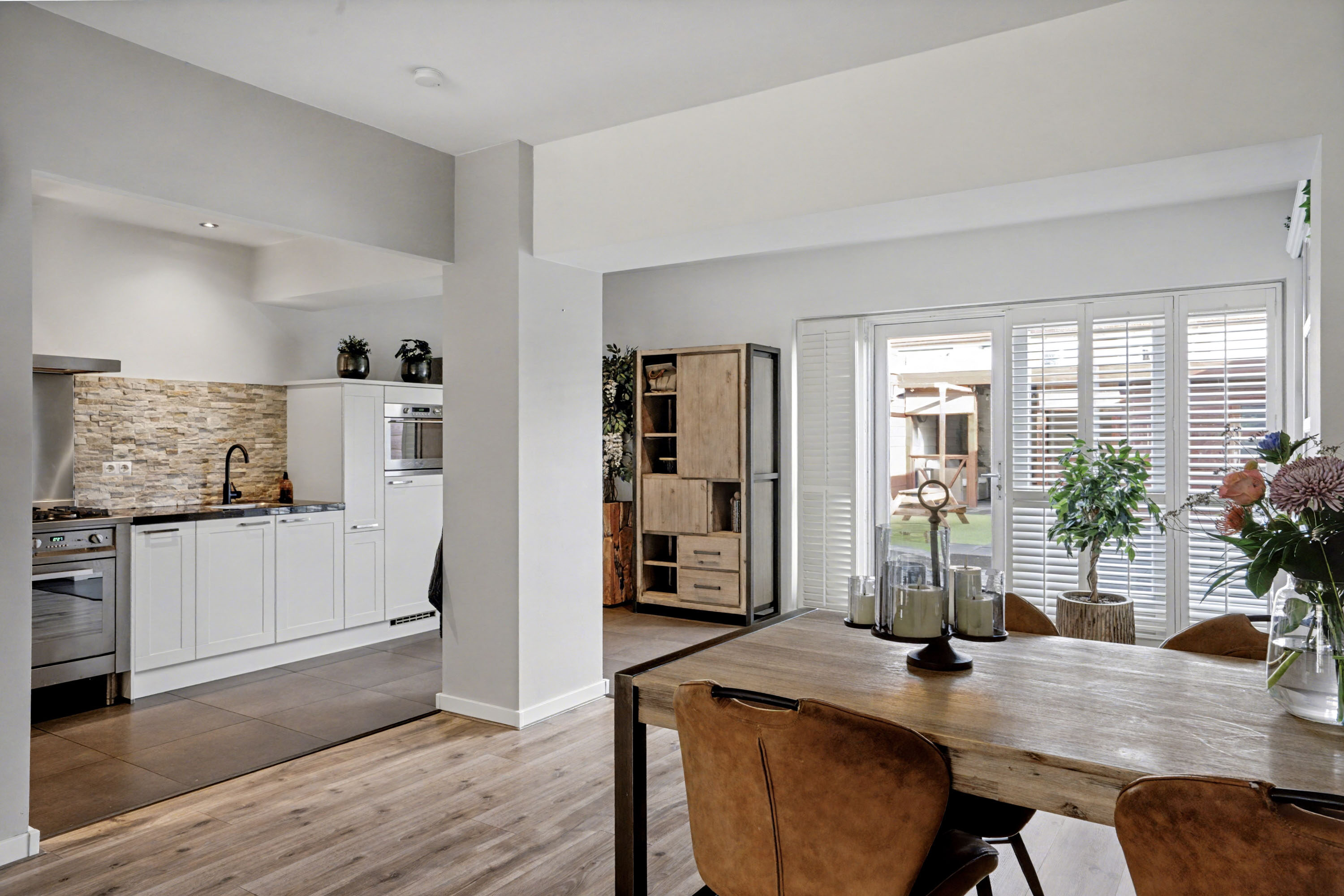 In de uitgebouwde woonkamer valt direct de ruimte en het vele daglicht op. Er is voldoende plaats voor zowel een fijne zithoek als een ruime eethoek. Onder de tegelvloer in de uitbouw en de keuken ligt vloerverwarming.