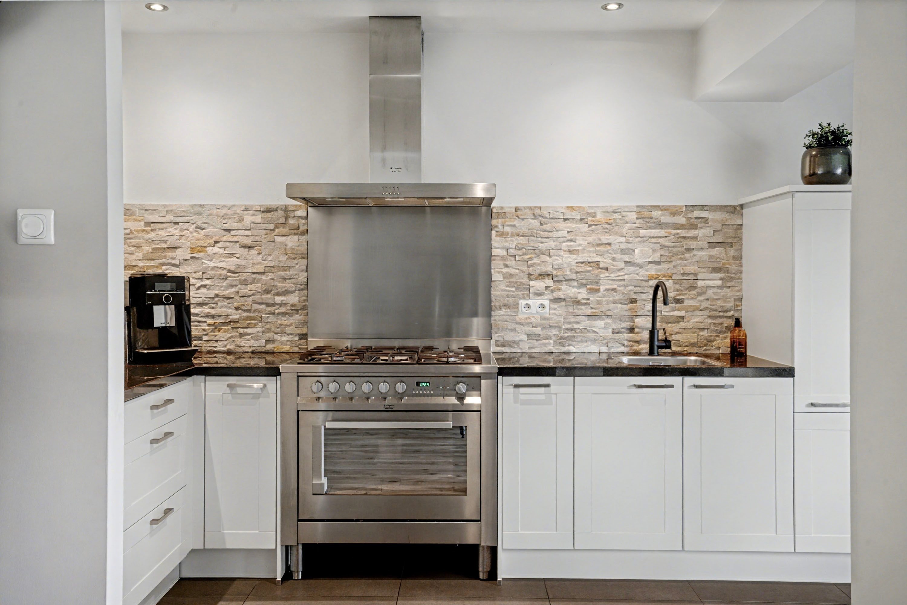 De open keuken heeft een hoekopstelling en is voorzien van diverse inbouwapparatuur, waaronder een afzuigkap, combi-oven, koelkast en vaatwasser. Via de openslaande deuren loop je zo de tuin in gelegen op het oosten.