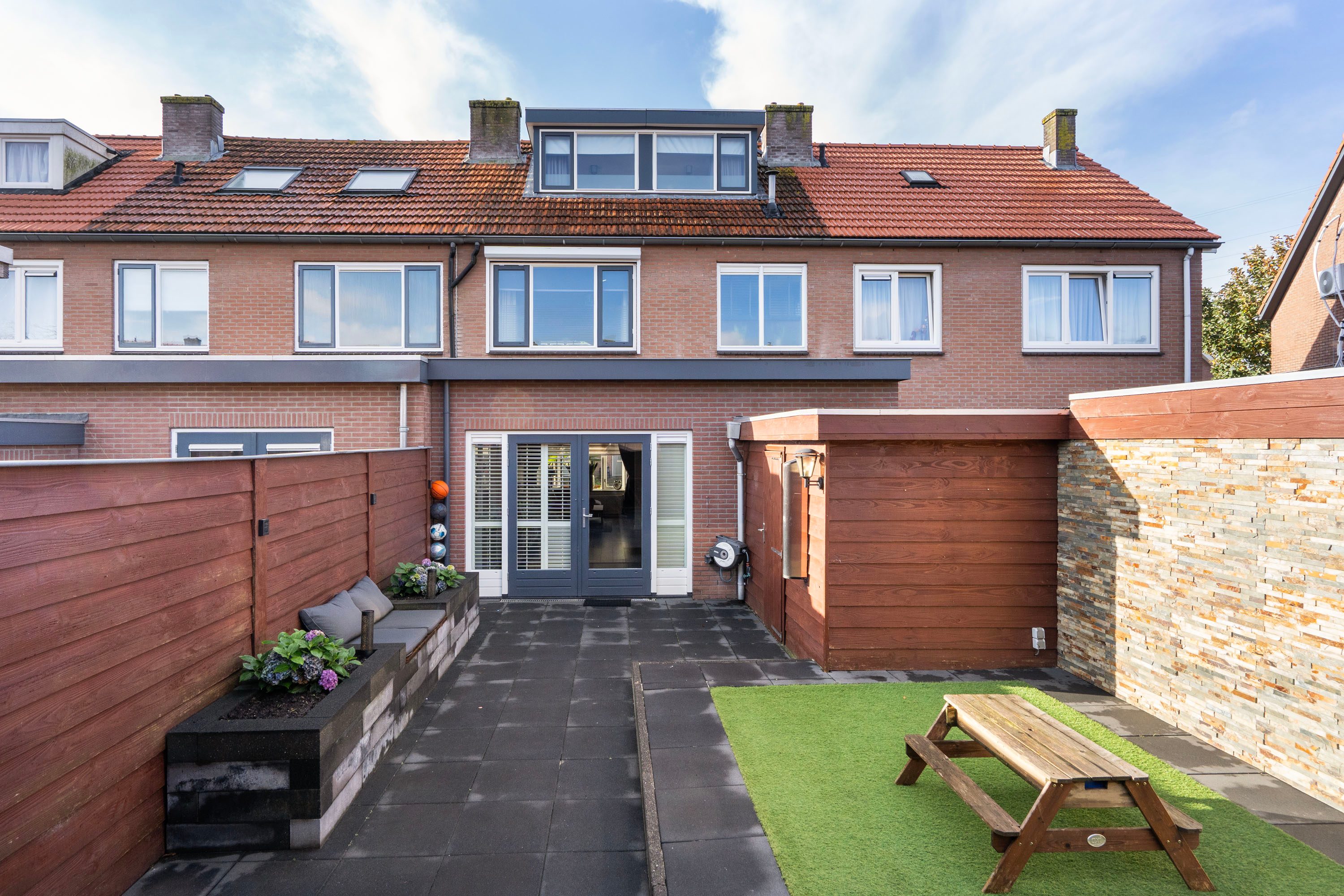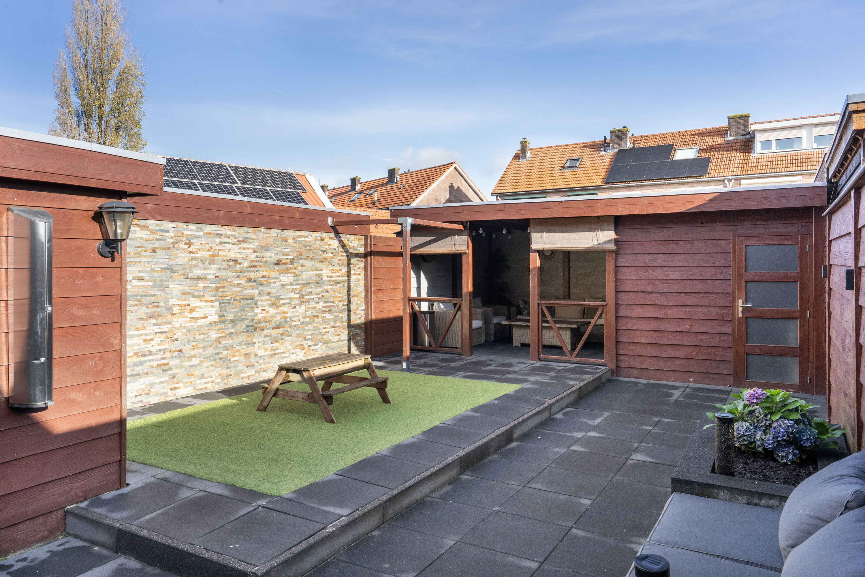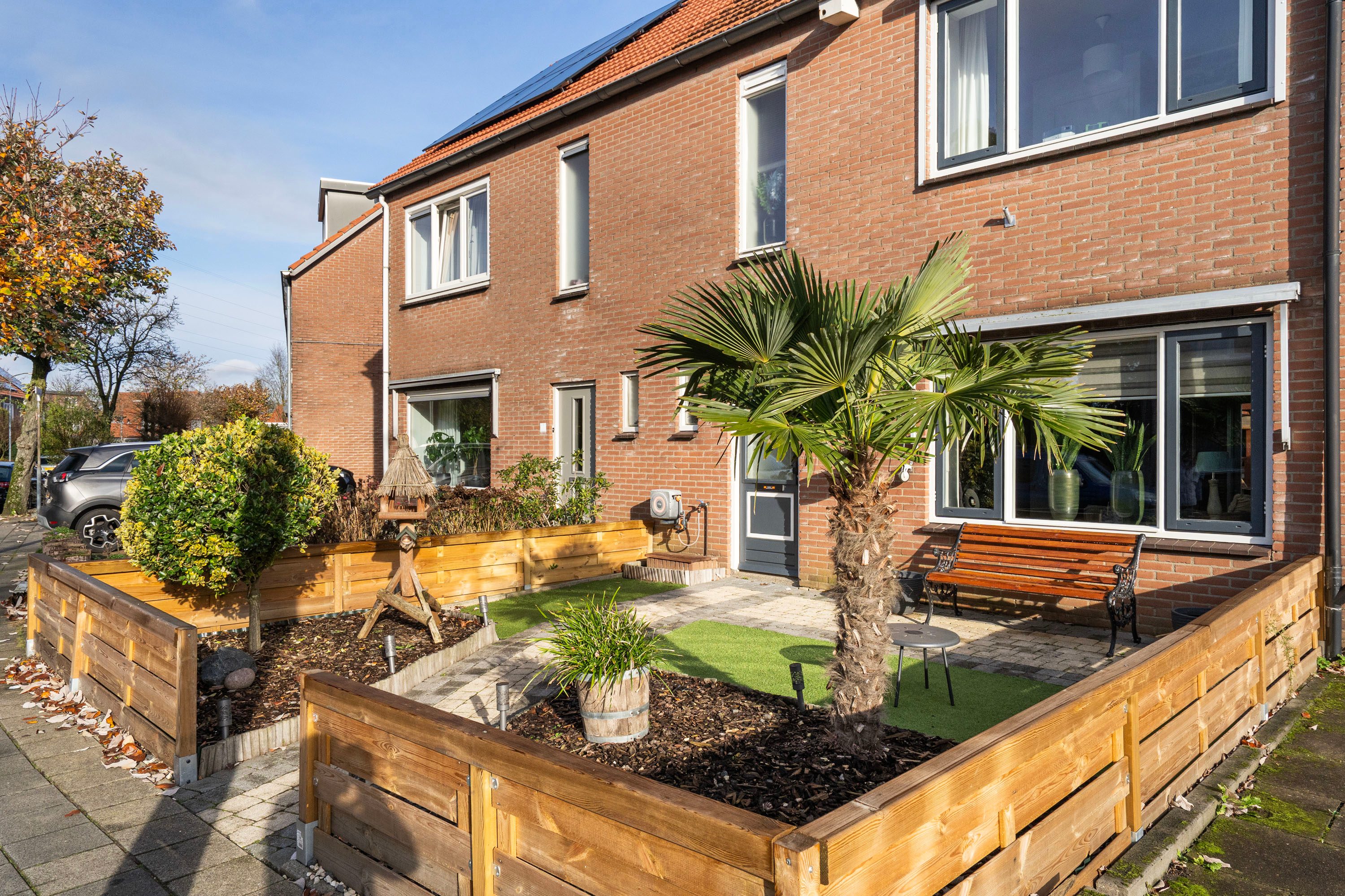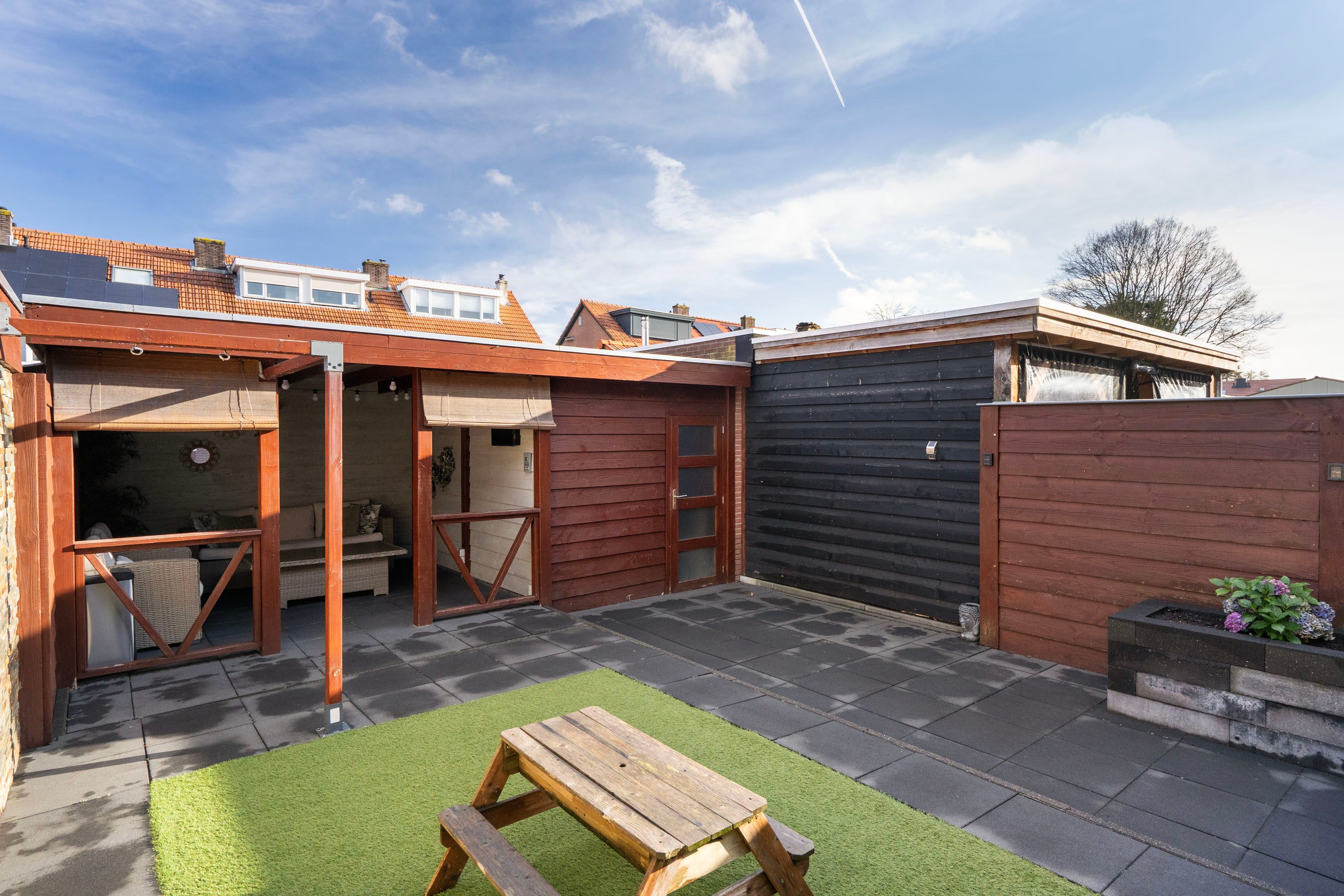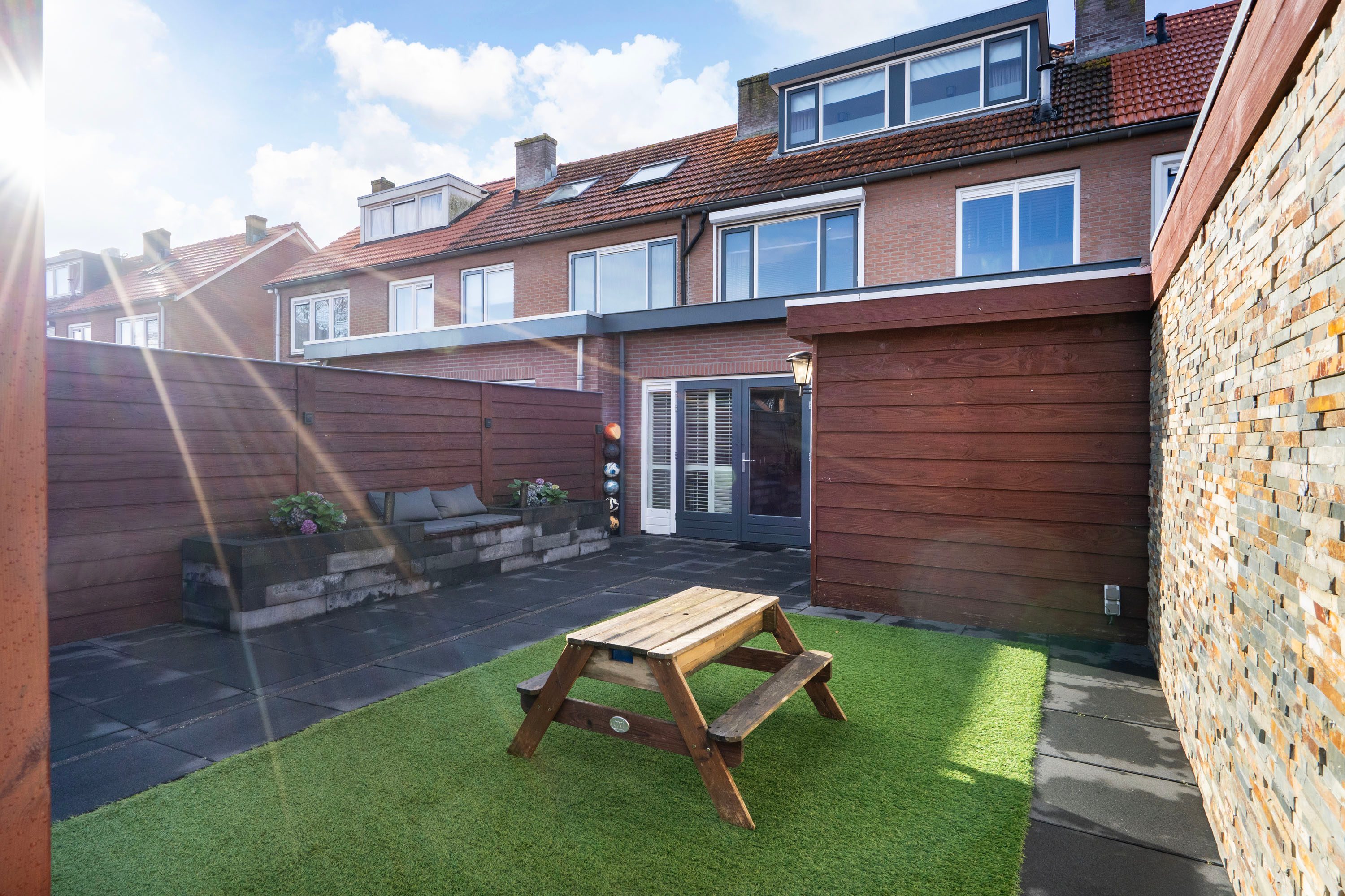 Via de openslaande deuren in de woonkamer stap je de onderhoudsvriendelijke achtertuin op het oosten in. De tuin beschikt over twee houten bergingen voor veel opbergruimte. Je kunt hier heerlijk zitten onder de veranda of in het sfeervolle zitje tussen de bloembakken.