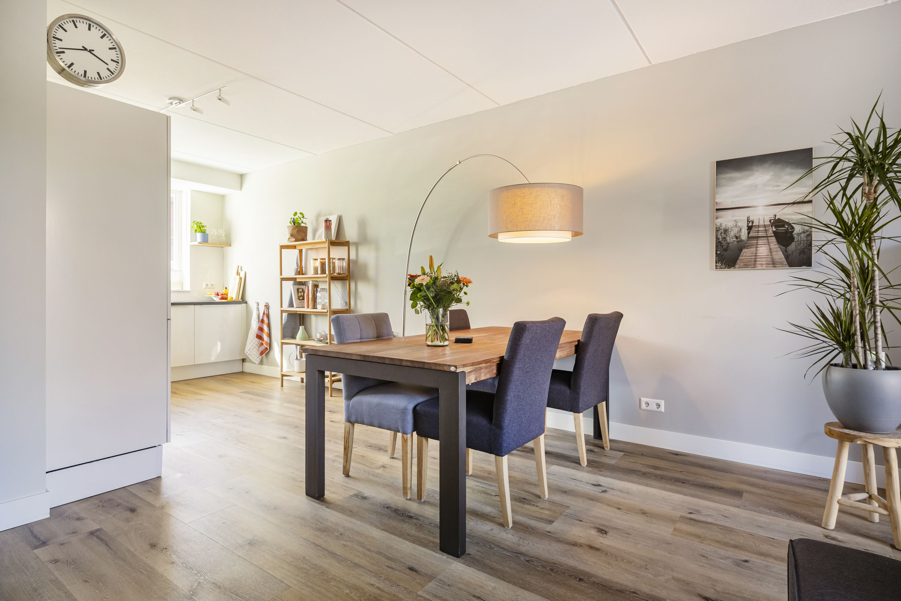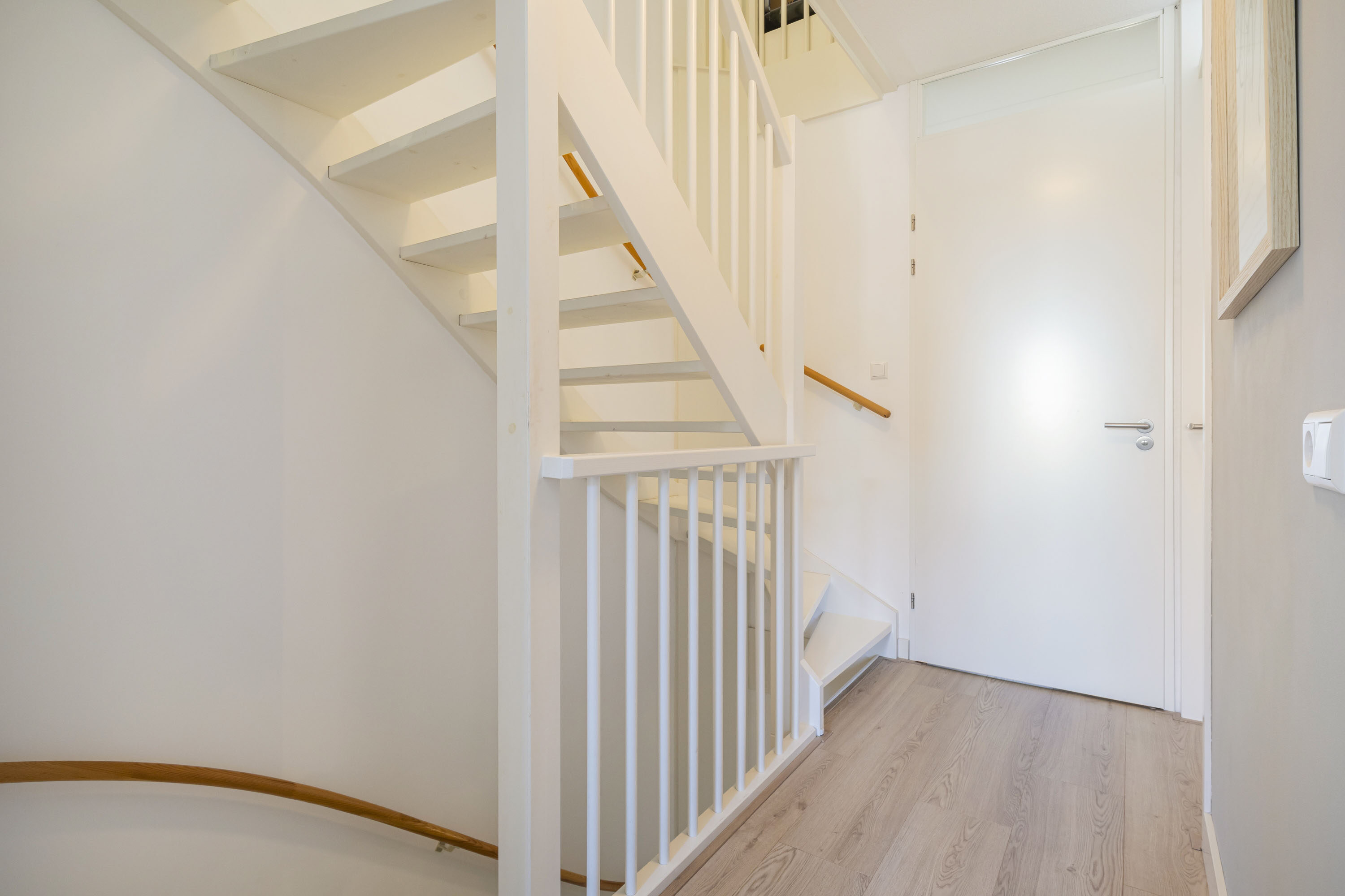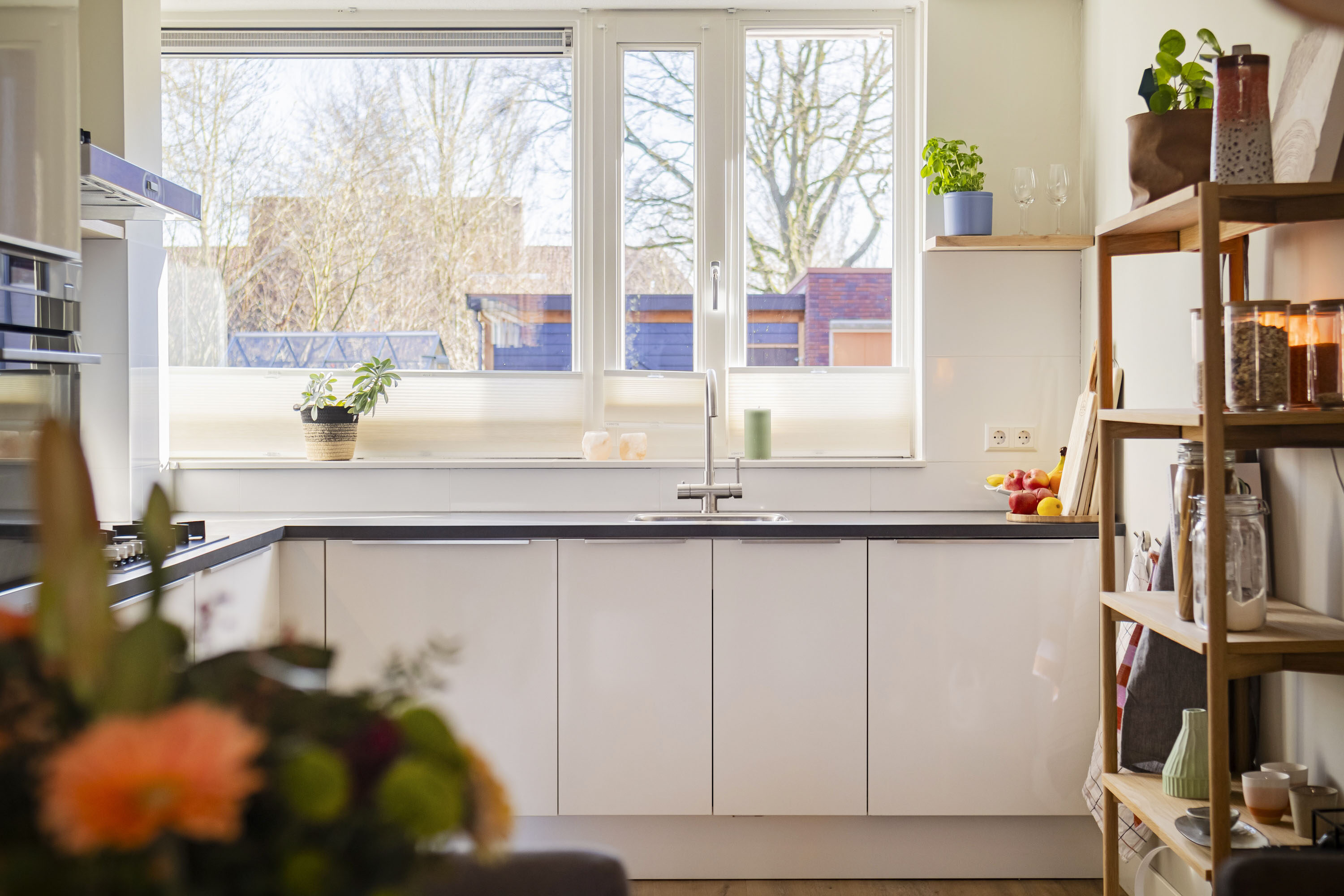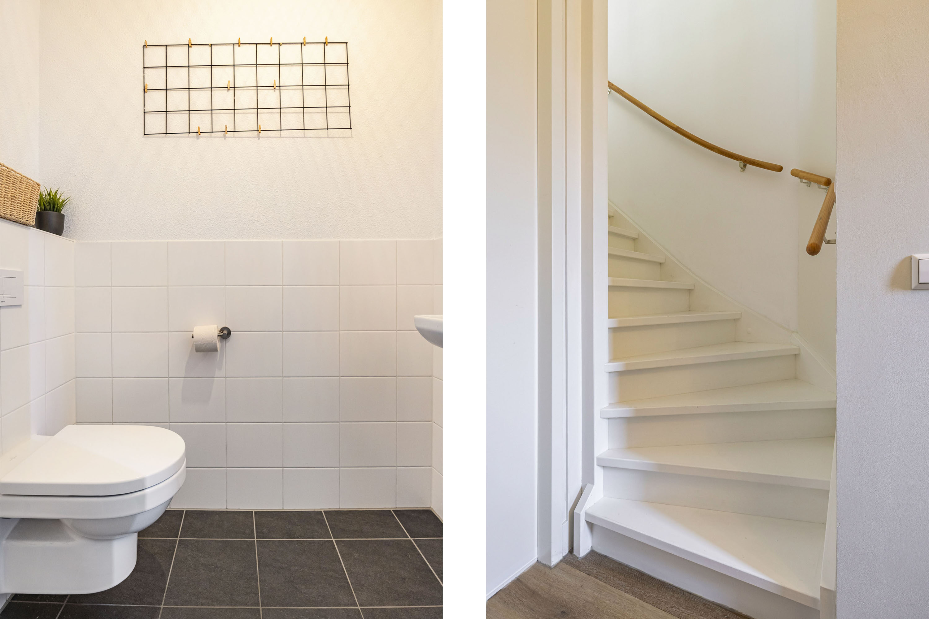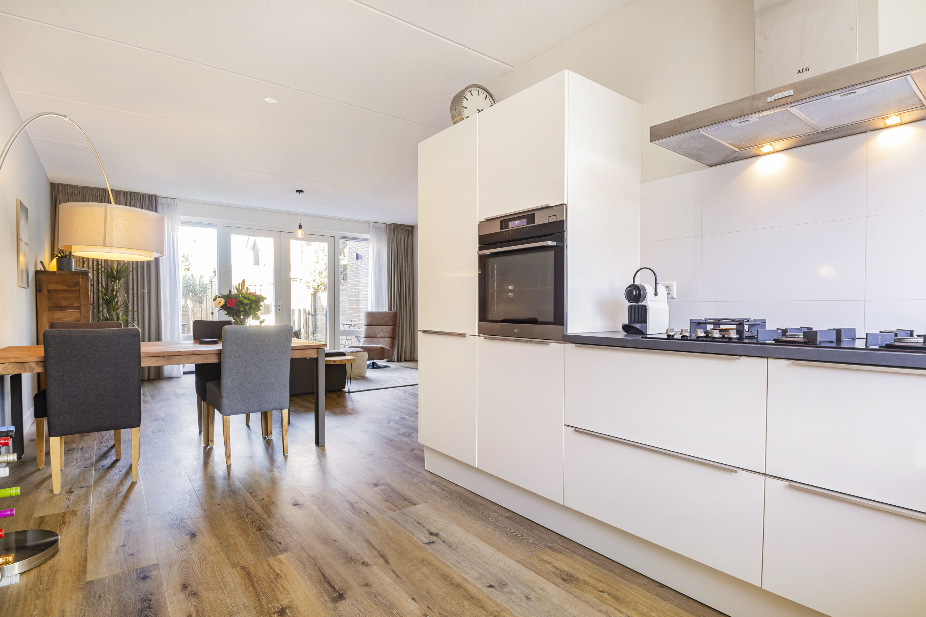 In het entree vind je de meterkast en het je ook toegang tot het toiletruimte, welke is voorzien van zwevend toilet en een fonteintje. De woonkamer is stijlvol en modern ingericht en baadt in het natuurlijke licht door de brede ramen en de openslaande deuren die naar buiten leiden. Onder de trap in de woonkamer vind je een handige opbergkast. Je moderne keuken is uitgevoerd in een frisse, lichte kleur en biedt allerlei inbouwapparatuur: een koelkast met vriesvak, oven, vijfpits gasfornuis met afzuigkap en een vaatwasser.