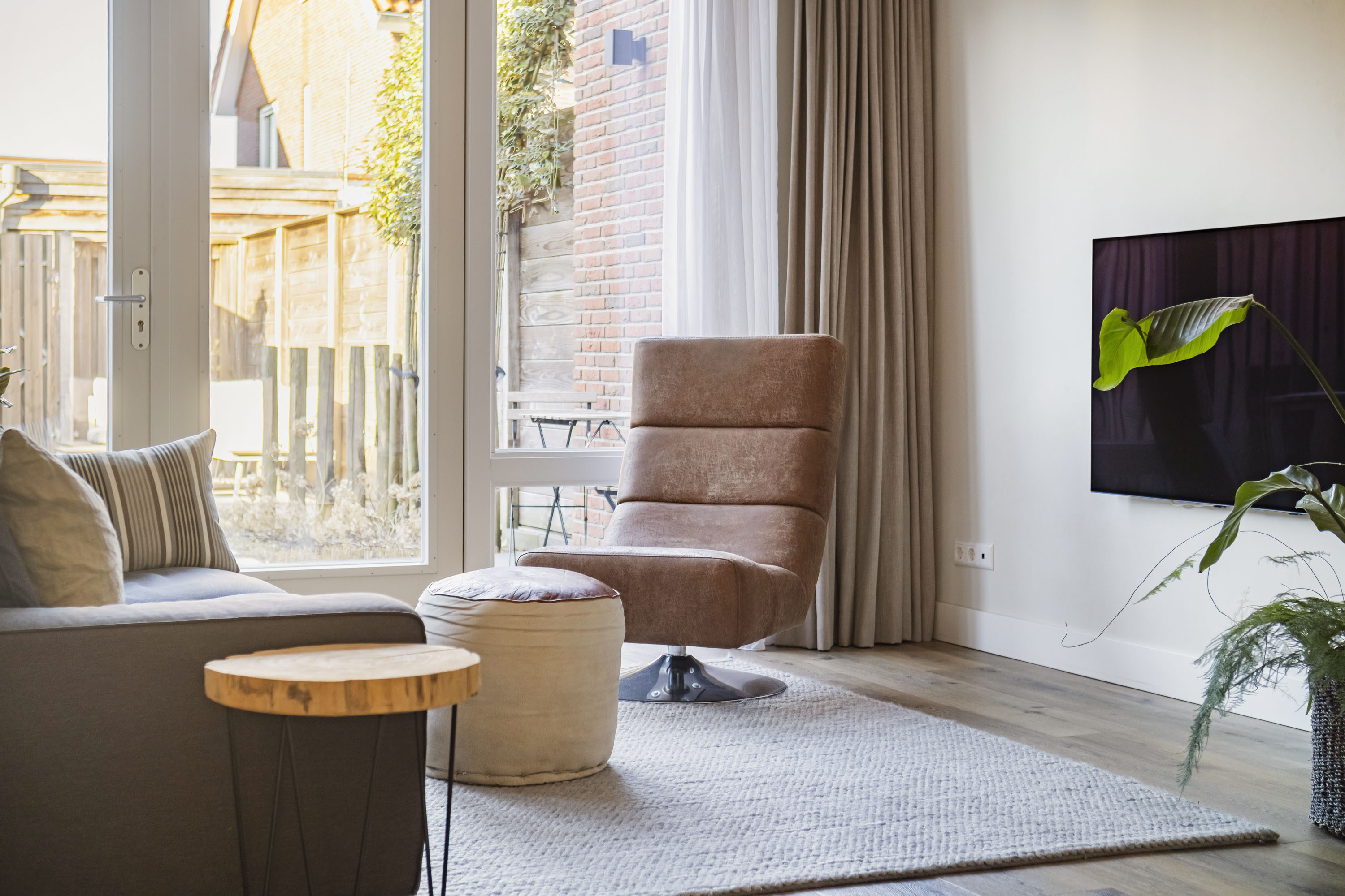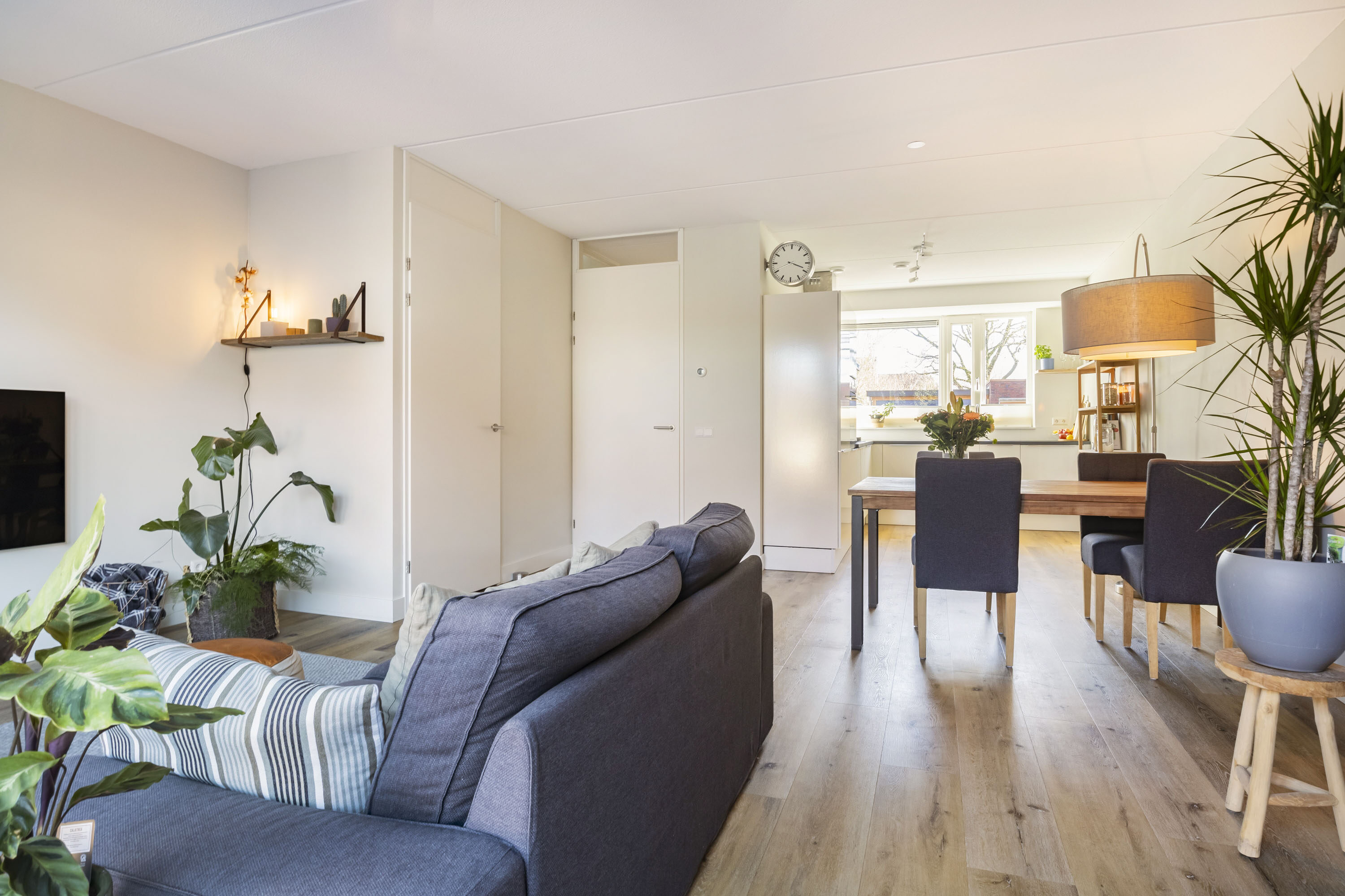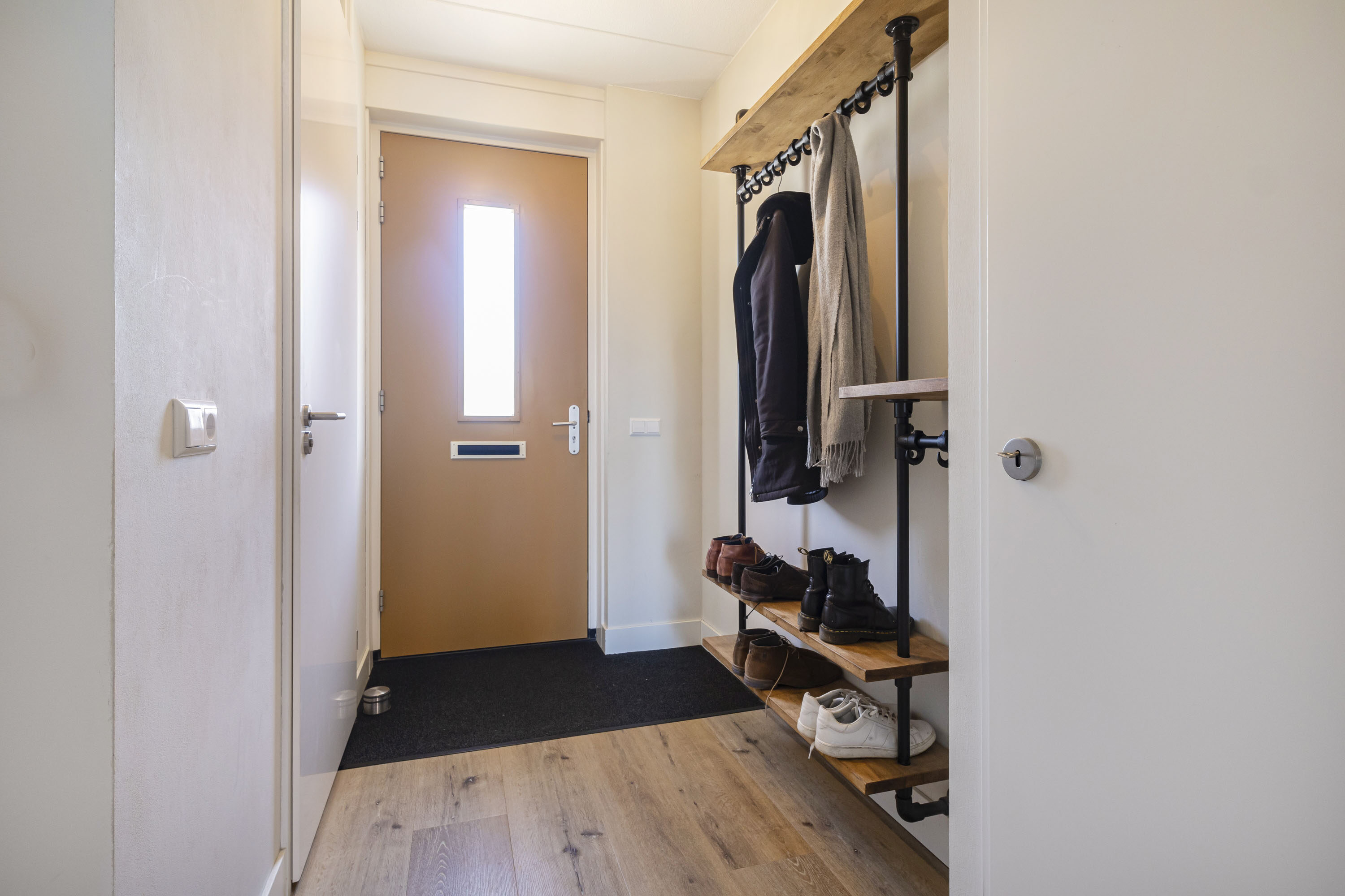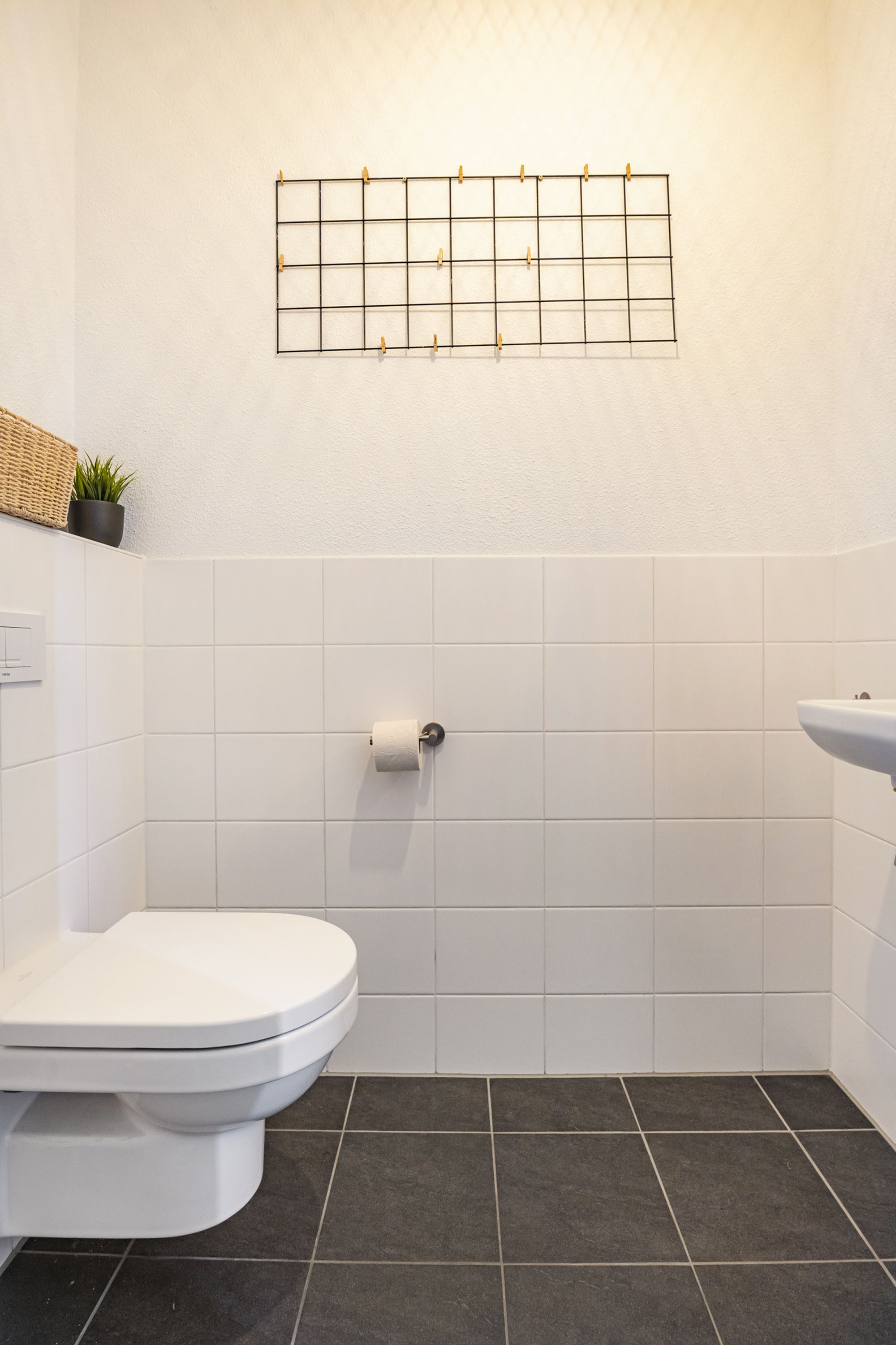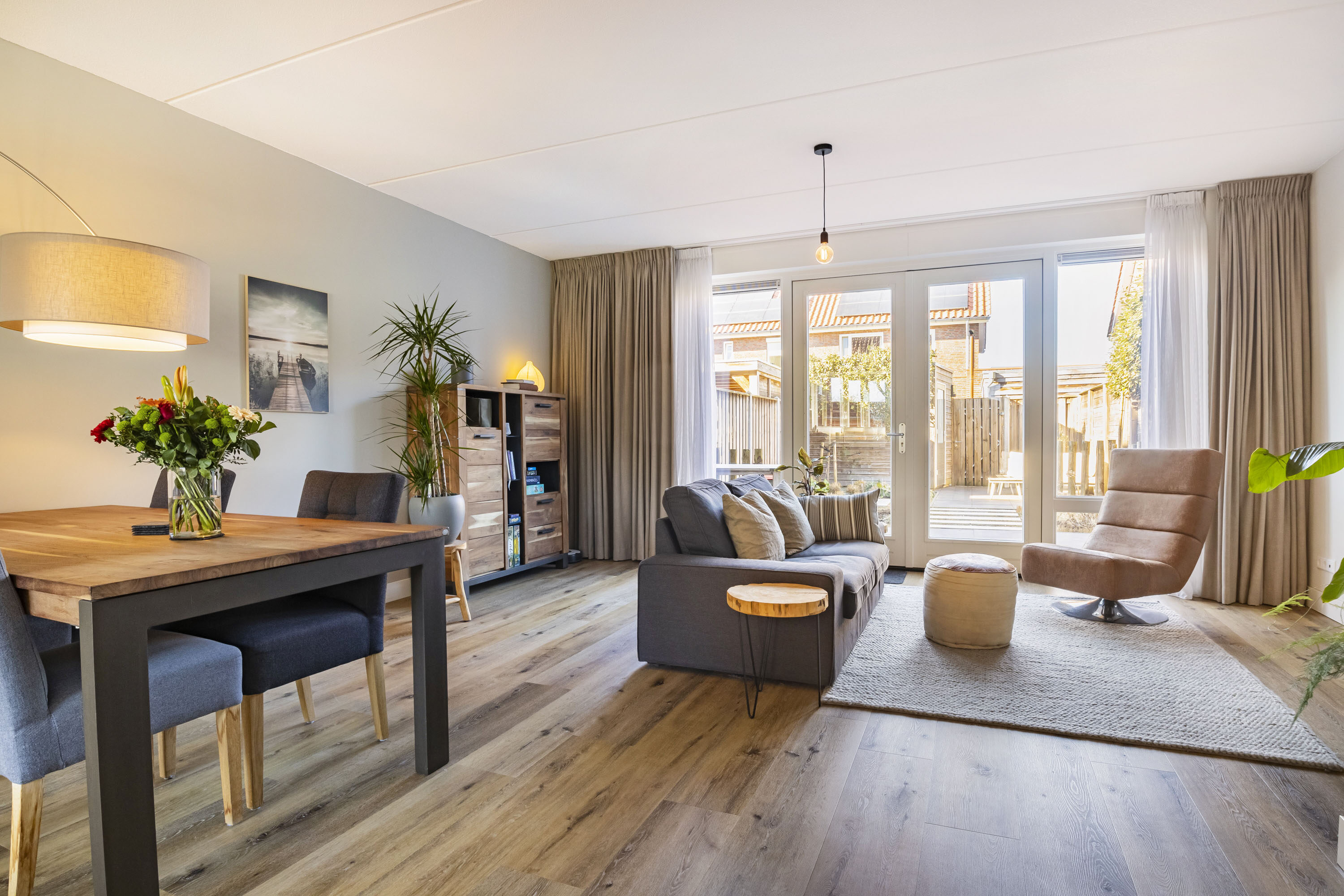 In het entree vind je de meterkast en het je ook toegang tot het toiletruimte, welke is voorzien van zwevend toilet en een fonteintje. De woonkamer is stijlvol en modern ingericht en baadt in het natuurlijke licht door de brede ramen en de openslaande deuren die naar buiten leiden. Onder de trap in de woonkamer vind je een handige opbergkast. Je moderne keuken is uitgevoerd in een frisse, lichte kleur en biedt allerlei inbouwapparatuur: een koelkast met vriesvak, oven, vijfpits gasfornuis met afzuigkap en een vaatwasser.