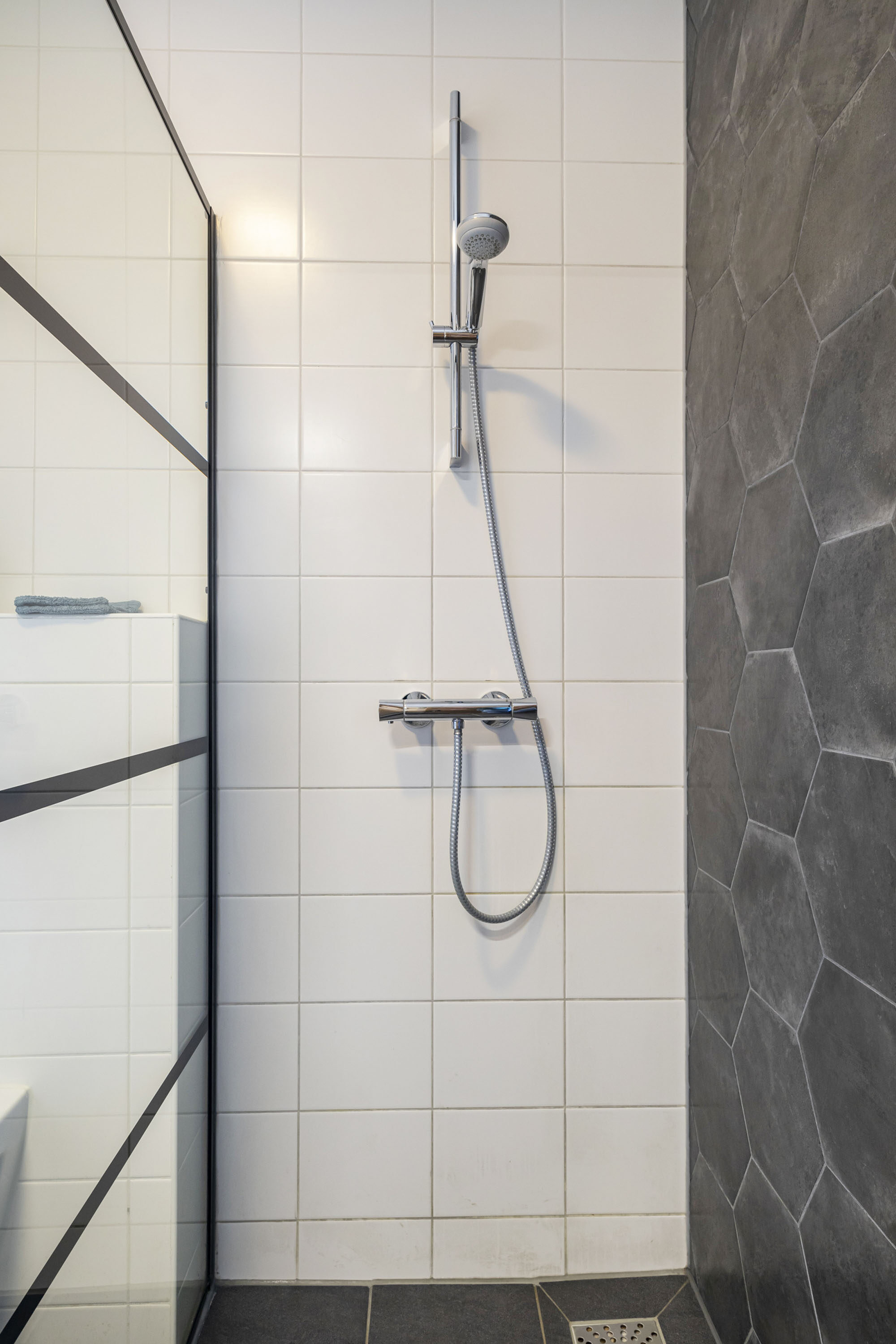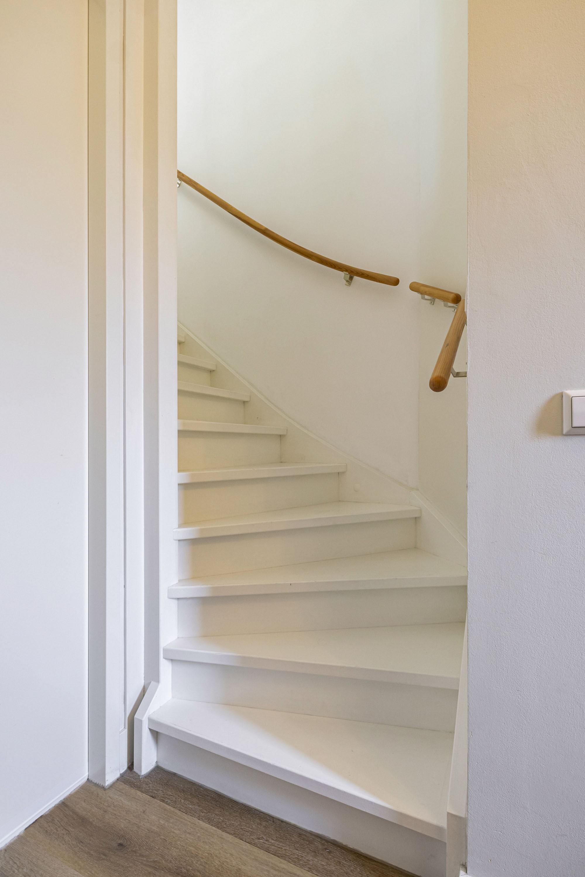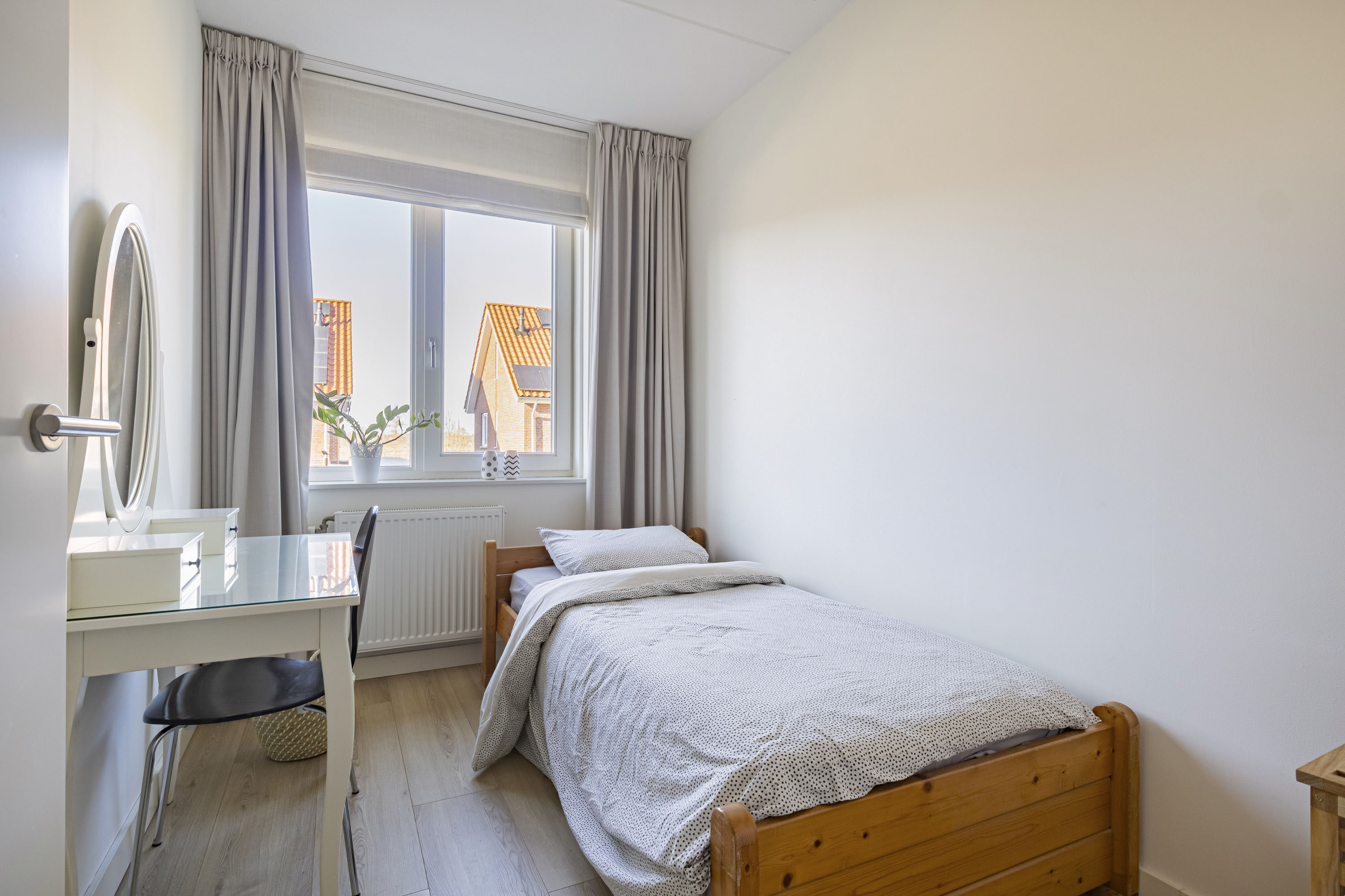 Vanaf de overloop heb je toegang tot drie slaapkamers en de badkamer. De ruime hoofdslaapkamer baadt in het licht dankzij witte muren en het licht dat vanuit het noorden binnenstroomt en beschikt bovendien over een ingebouwde kast. De tweede slaapkamer is ongeveer 12 m² groot en is net zo strak en helder, met zonlicht dat vanuit het zuiden de kamer binnenkomt. De derde slaapkamer is ongeveer 6 m² groot, vangt het noordelijke licht op en is perfect voor gebruik als kinderkamer. De badkamer is in 2021 volledig gerenoveerd, smaakvol betegeld en voorzien van een douche, wastafel en tweede toilet.