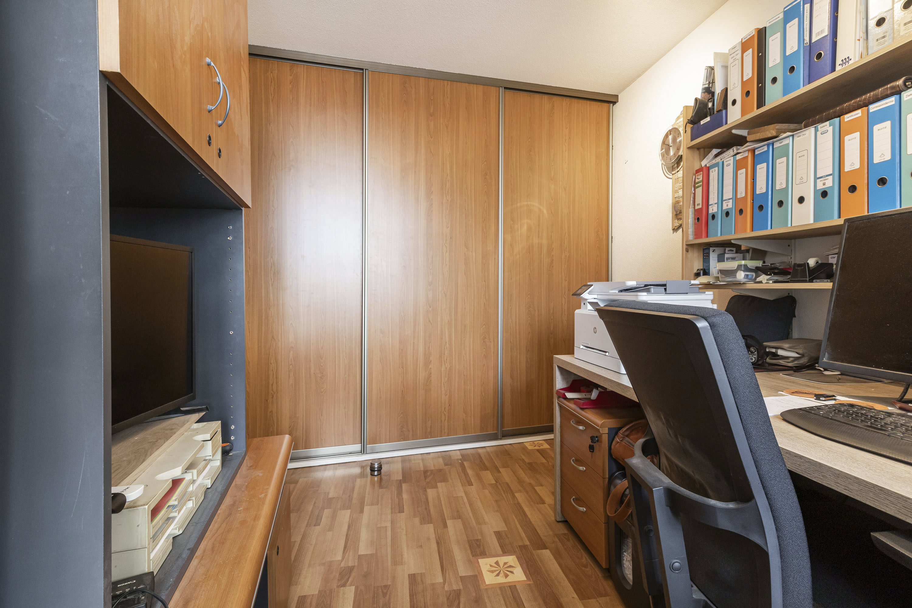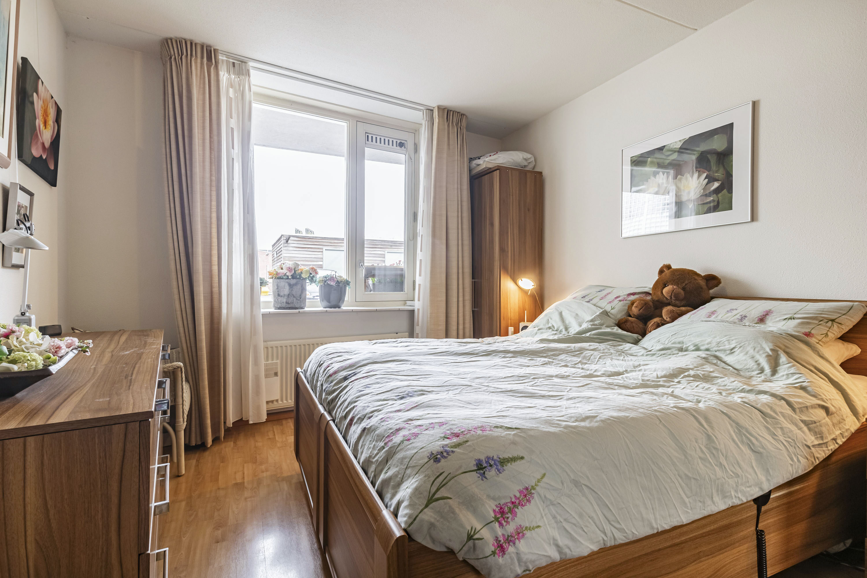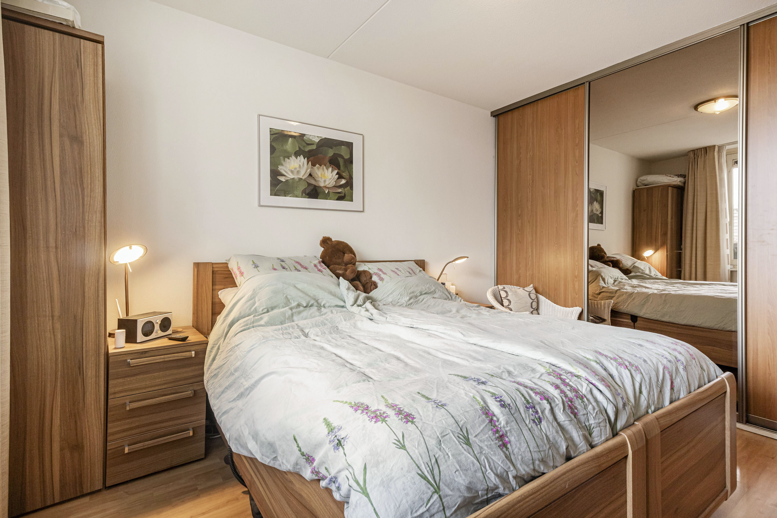 De hoofdslaapkamer is aan de achterzijde van het appartement gelegen en beschikt over een raampartij en een praktische vaste kasten wand met schuifdeuren. De tweede slaapkamer is eveneens voorzien van een praktische kastenwand met schuifdeuren. Beide slaapkamers zijn afgewerkt met een laminaatvloer en voldoende bergkasten.