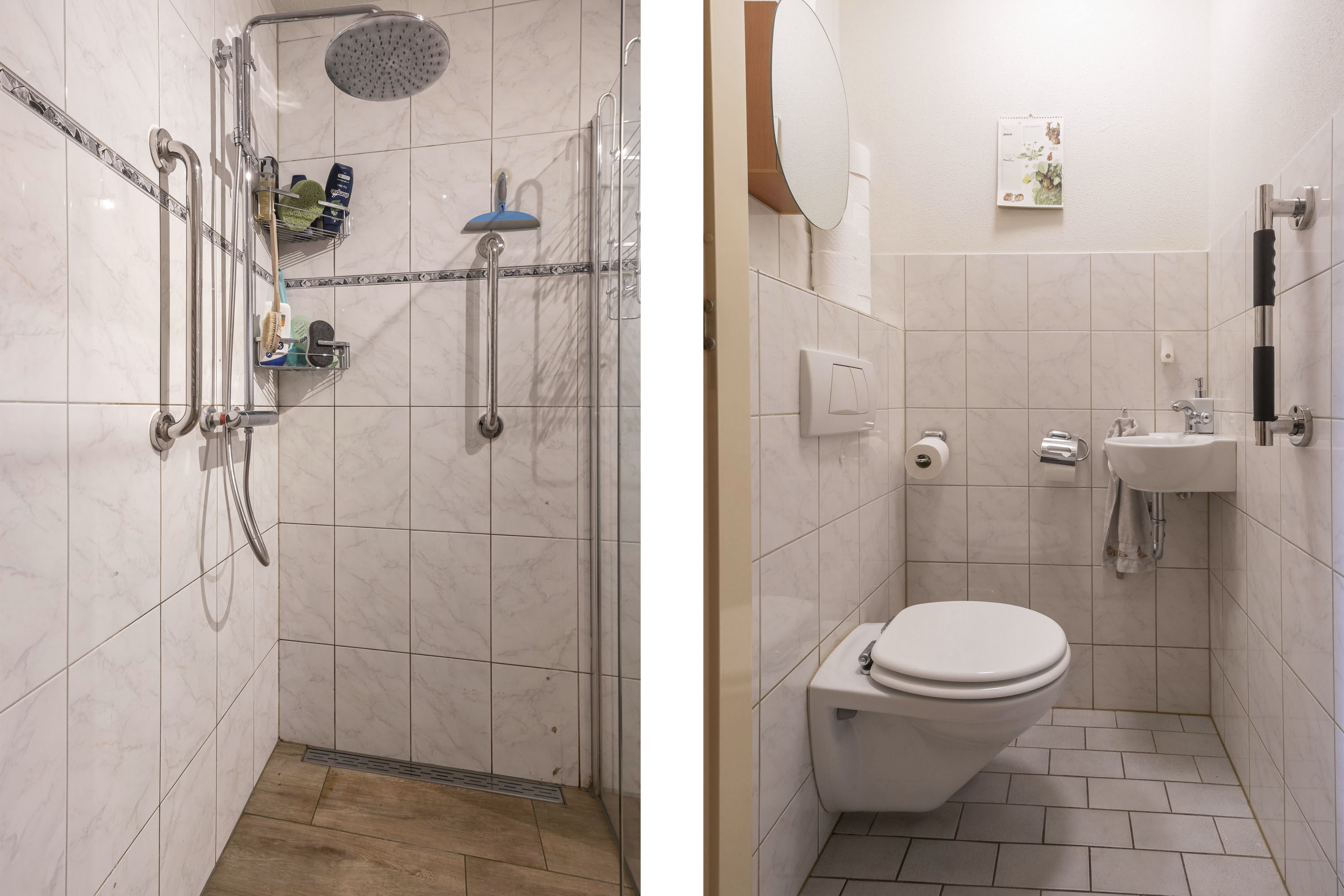 De ruime fraaie badkamer is volledig betegeld en beschikt over een wastafelmeubel met spiegel, Verder is er een seperaat toilet en ruime inloopdouche douche voorzien van faciliteiten ter ondersteuning.