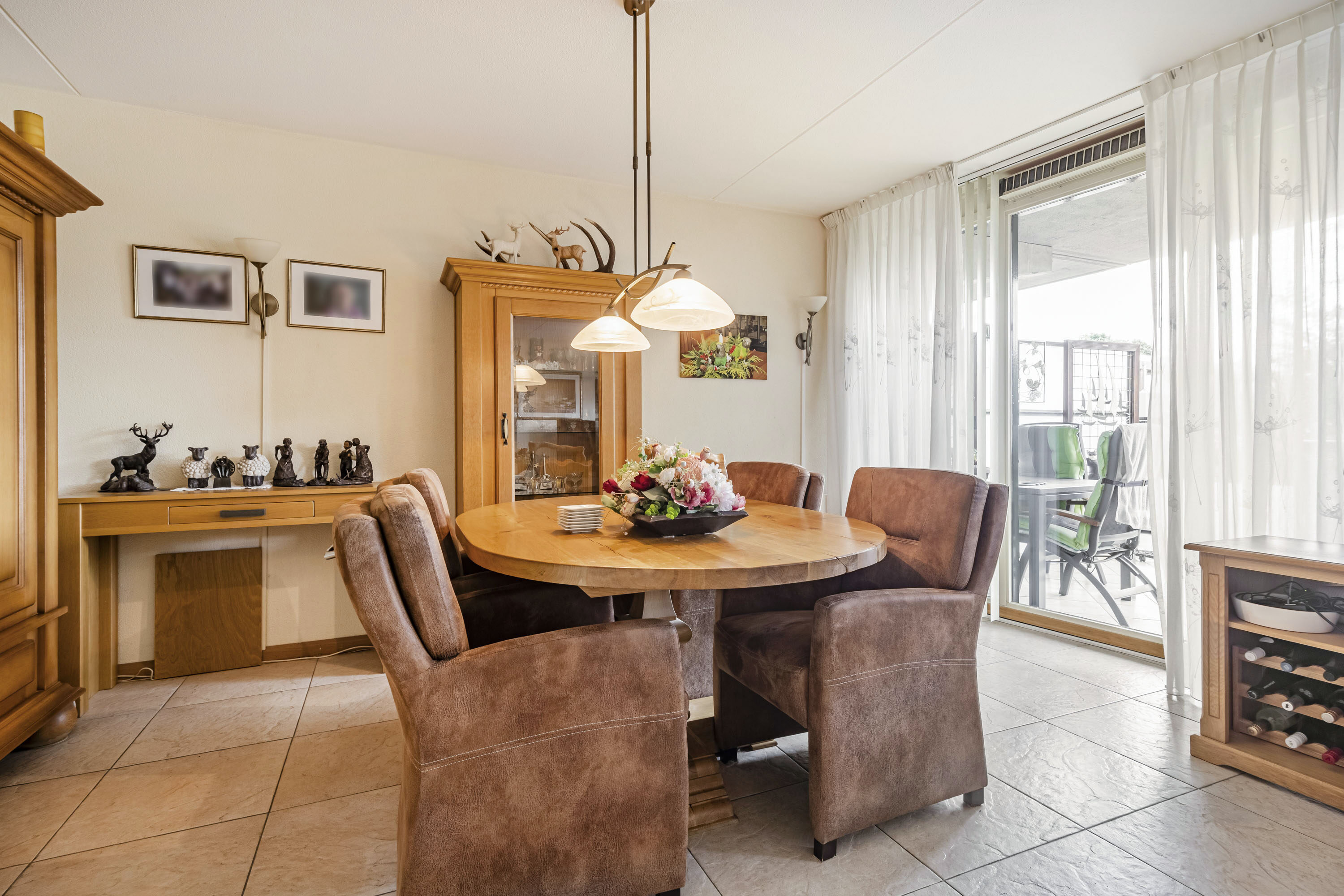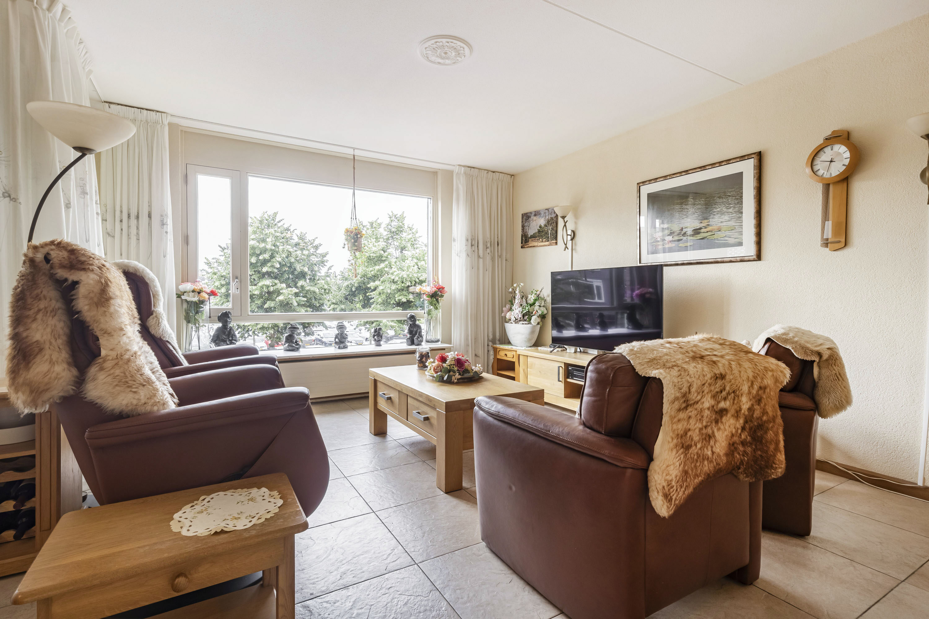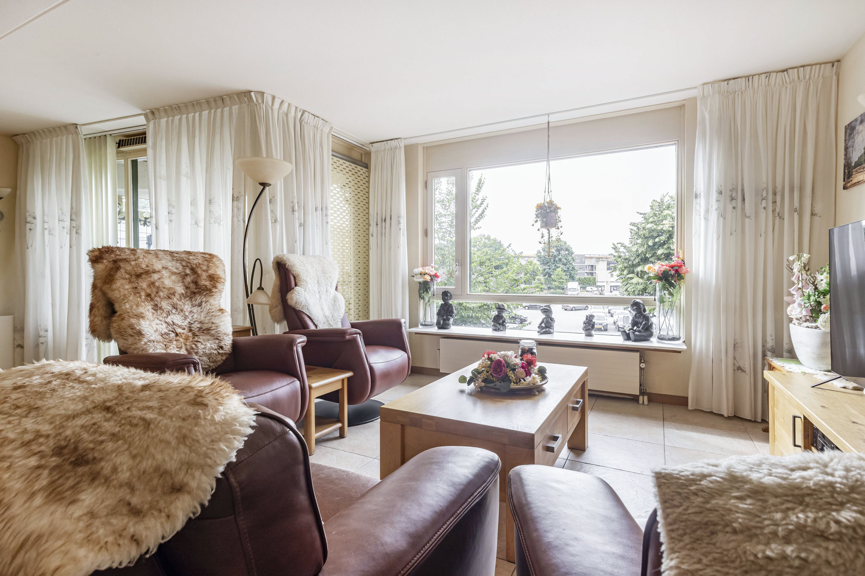 De woonkamer is een fijne lichte ruimte door de grote raampartijen en praktisch in te delen. Vanuit hier heb je direct toegang tot het overdekte balkon op het zuidoosten. Zowel vanuit de woonkamer als het balkon heb je een fraai uitzicht over het centrum van Ede.