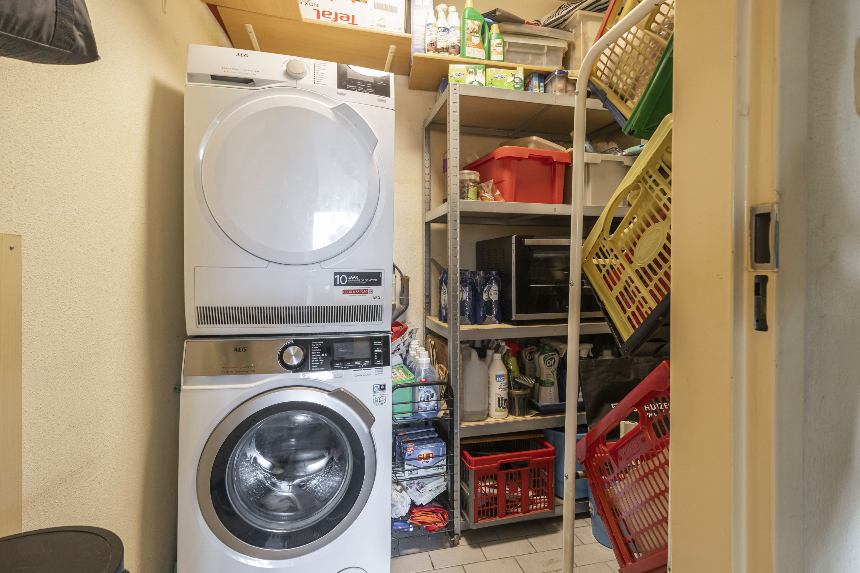 Er is een inpandige bergruimte aanwezig voor het opstellen van de wasmachine en droger.