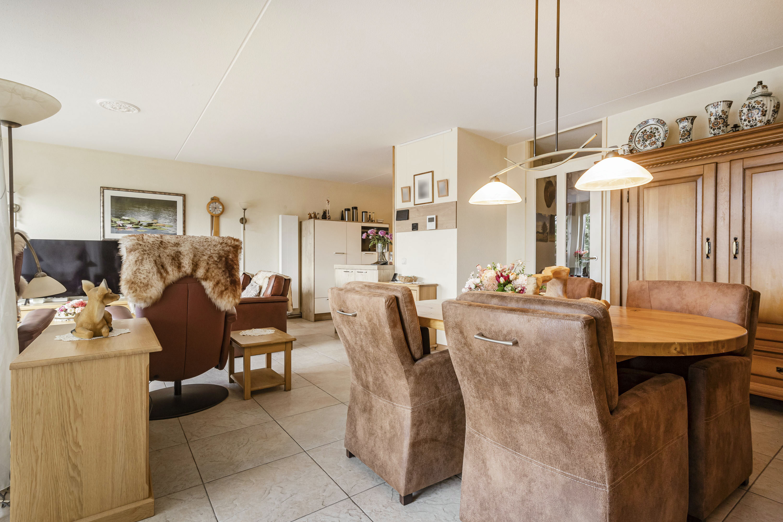 Zowel de woonkamer als keuken beschikken over een lichte plavuizenvloer.