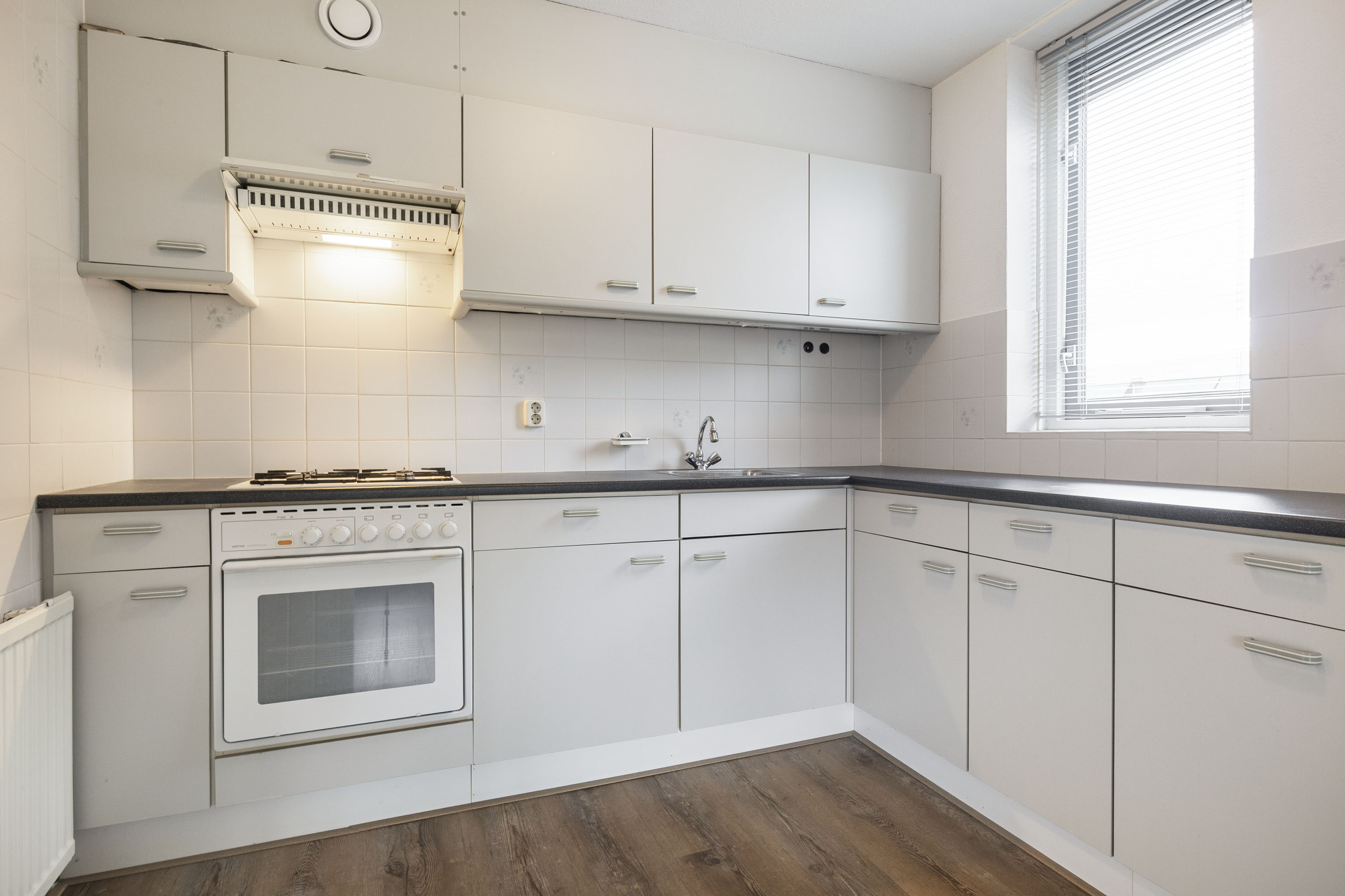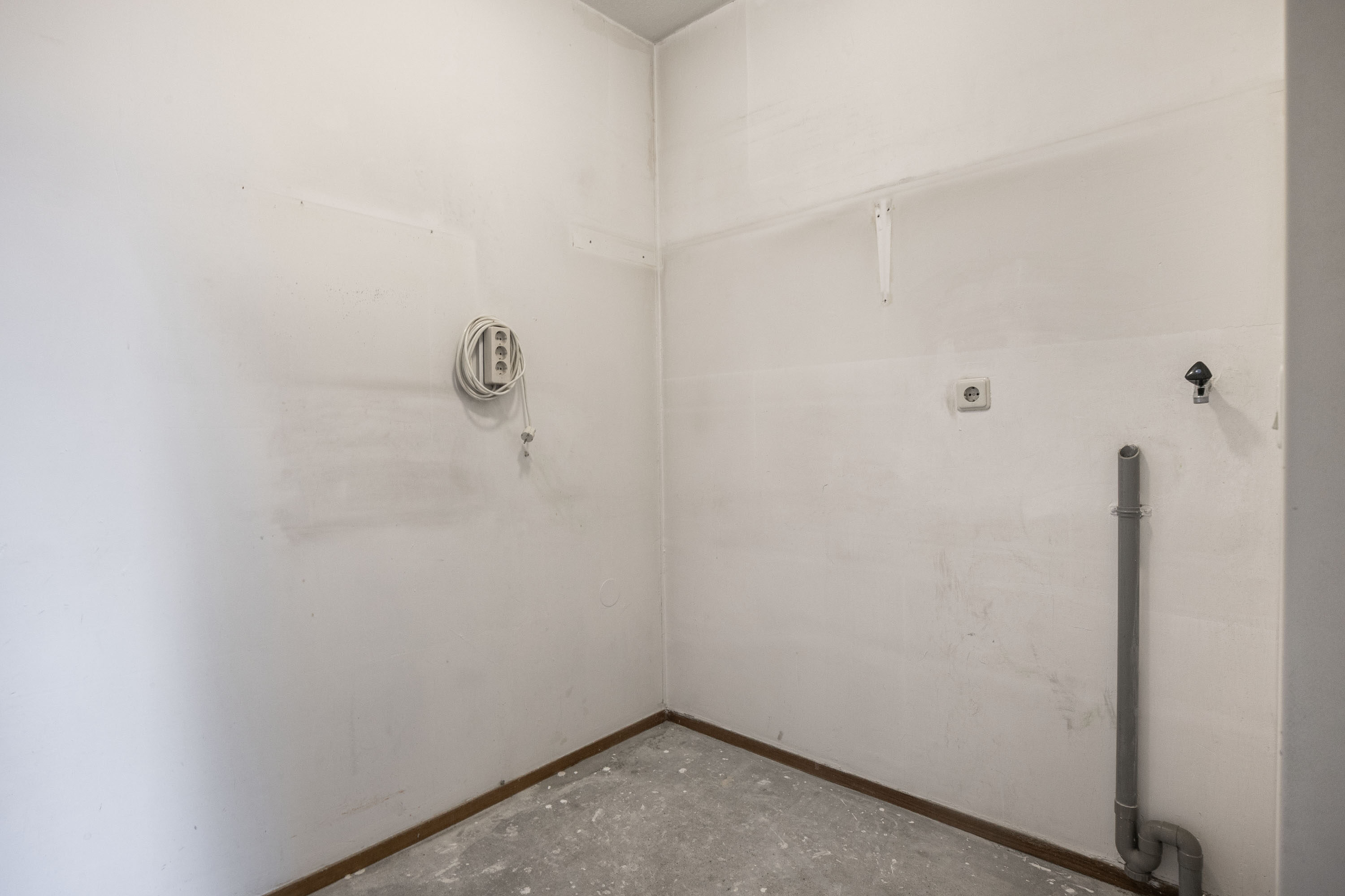 De keuken in lichte kleurstelling is opgesteld in een hoekvorm en beschikt over veel werk- en kastruimte. Aangrenzend bevindt zich een praktische berging met aansluiting voor de wasmachine en ruimte voor extra voorraad.
