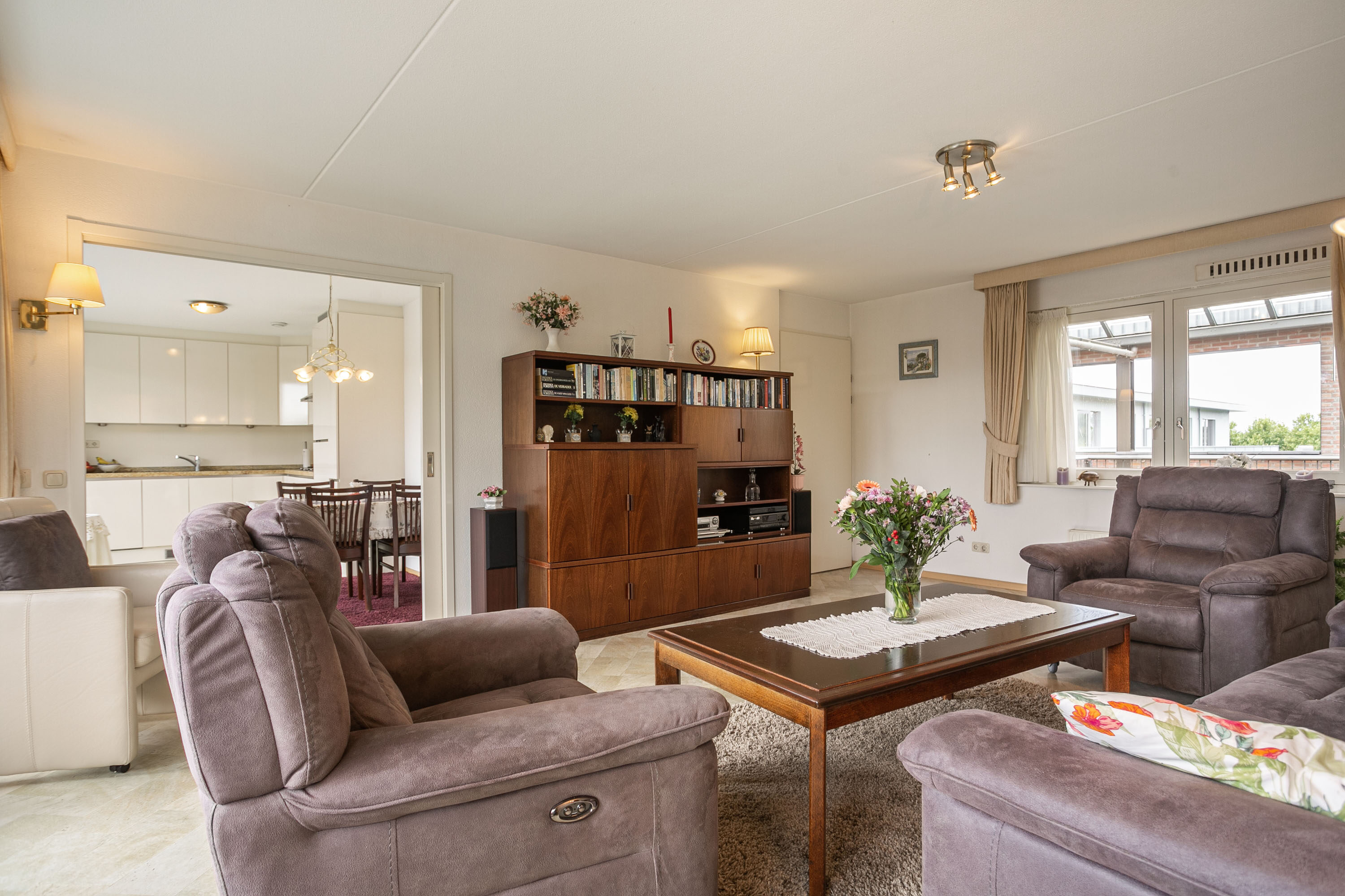 Via de centrale hal betreed je het appartement. Deze ruime entree geeft toegang tot het toilet, de wasruimte met extra berging en een zeer royale woonkamer met veel natuurlijk licht dankzij de grote raampartijen. De woonkamer sluit aan op een nette keuken in hoekopstelling, voorzien van inbouwapparatuur zoals een gasfornuis, afzuigkap, magnetron, koelkast en vaatwasser.