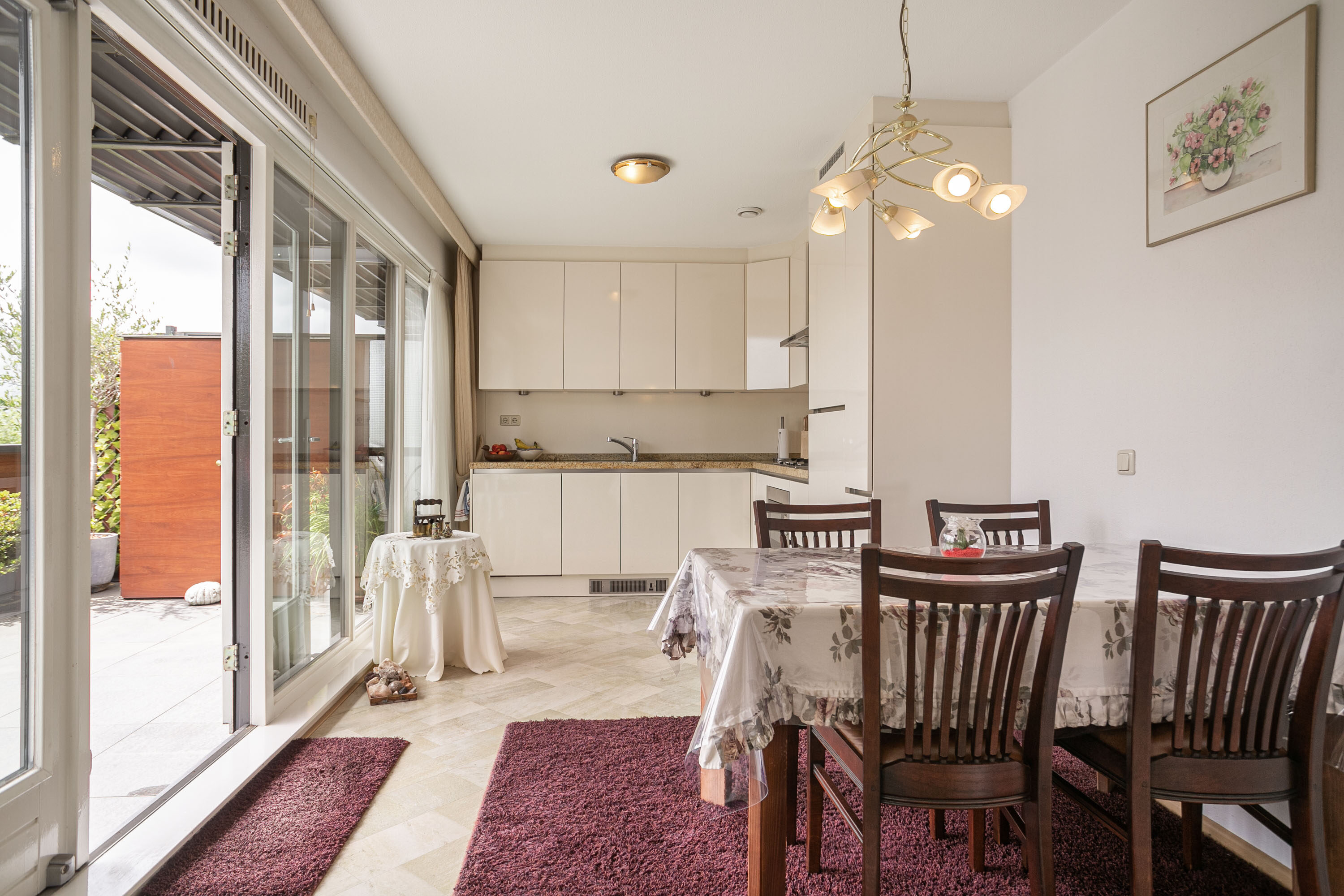 Het riante balkon van maar liefst 42 m² is gelegen op het zuiden en biedt een vrij uitzicht op groen. Een perfecte plek om te genieten van de zon, te borrelen met vrienden of te ontspannen met een goed boek.