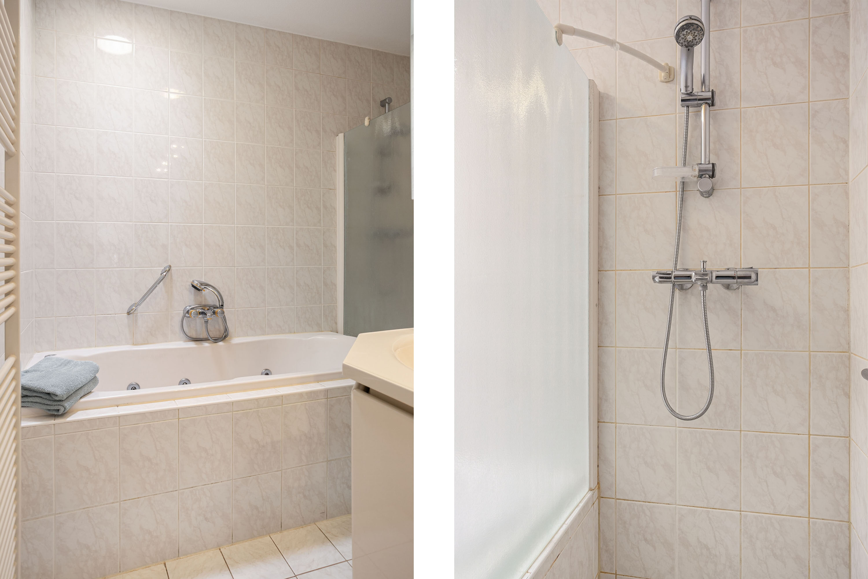 Aan de achterzijde bevinden zich twee ruime slaapkamers van circa 14 m² en 11 m², beide met vaste kastenwanden die op maat zijn gemaakt. De badkamer is uitgerust met een whirlpool, inloopdouche, dubbele wastafel, tweede toilet en designradiator.