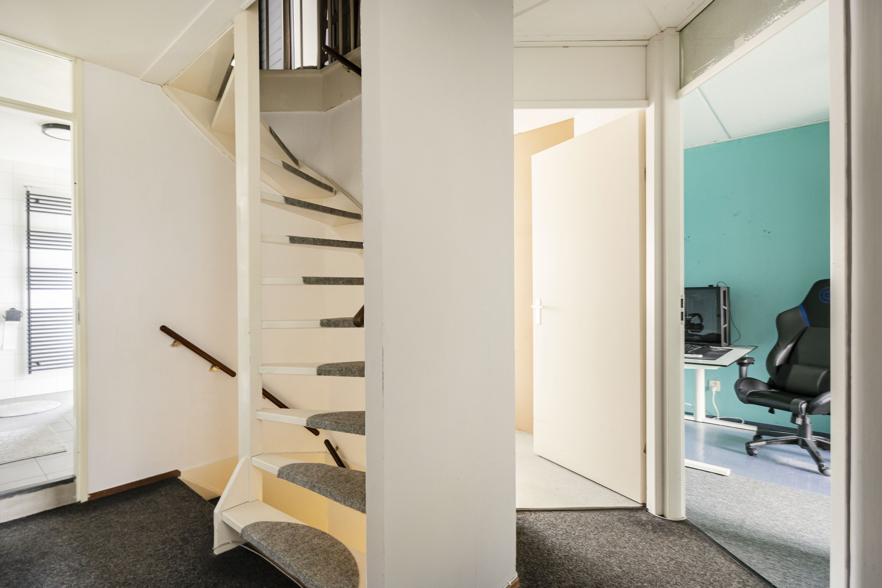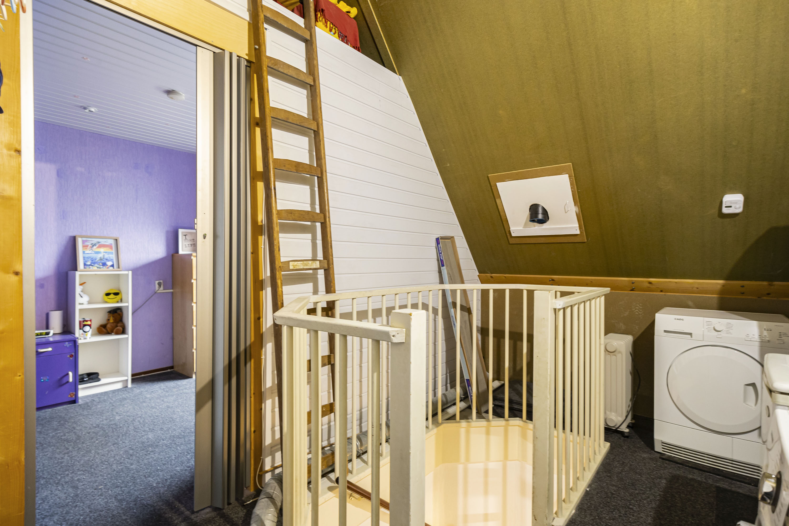 Via de trap bereik je de zolderverdieping. Hier bevindt zich de wasmachineaansluiting en een vliering voor extra opbergruimte.