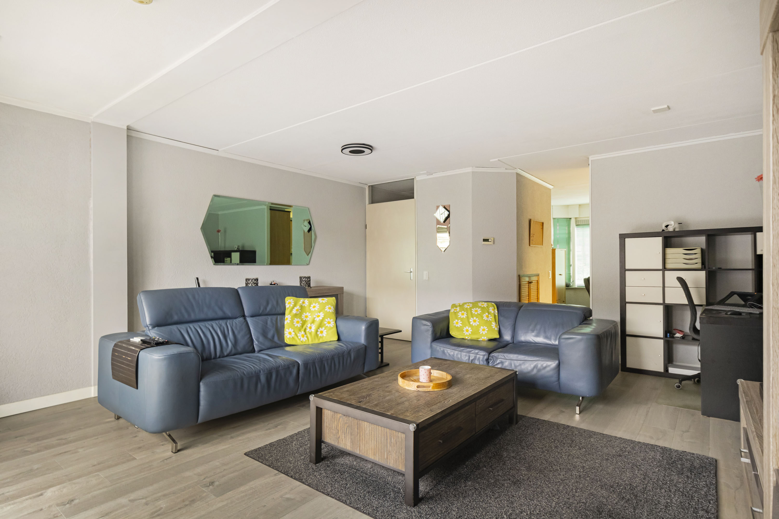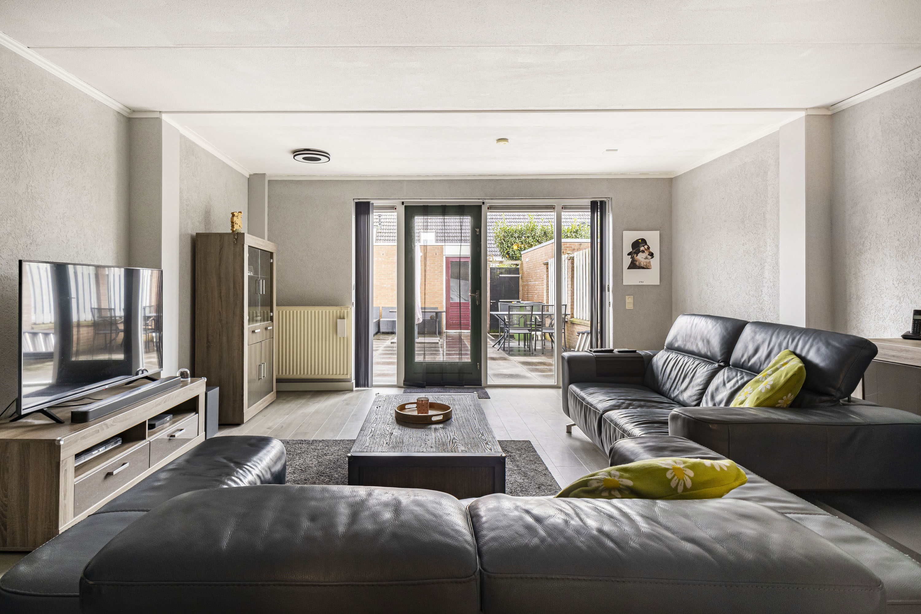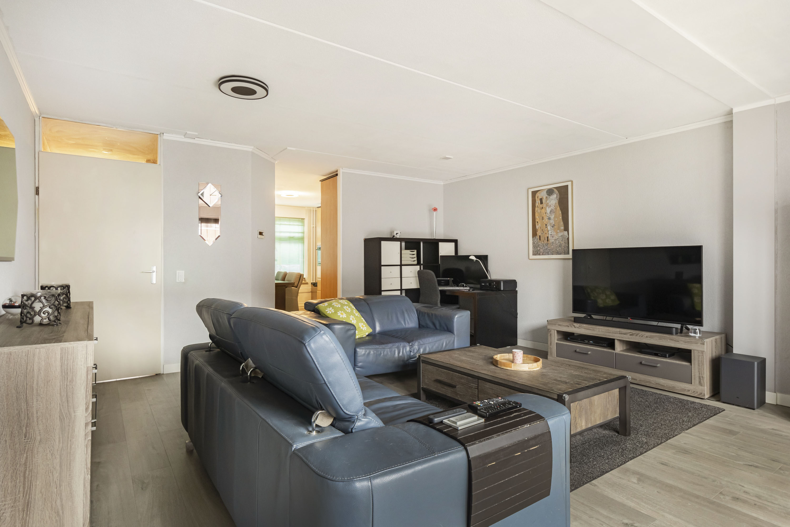 De woonkamer is ruim opgezet en dankzij de royale aanbouw ontstaat er veel leefruimte. De indeling is praktisch en via de openslaande deur heb je direct toegang tot de tuin.
