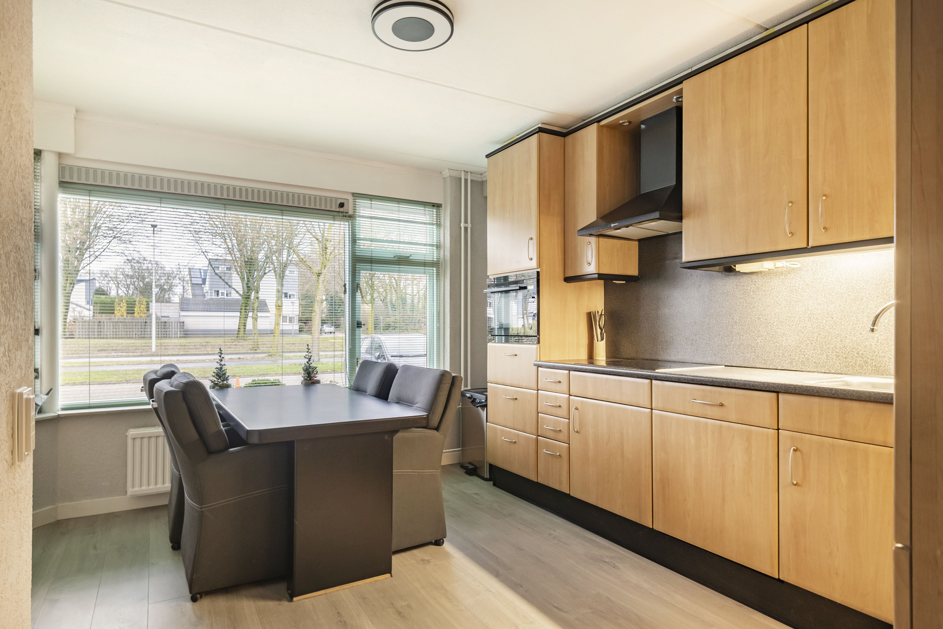 De keuken is praktisch ingericht, beschikt over diverse inbouwapparatuur en veel opbergruimte. De houten fronten geven de keuken een frisse en warme uitstraling.